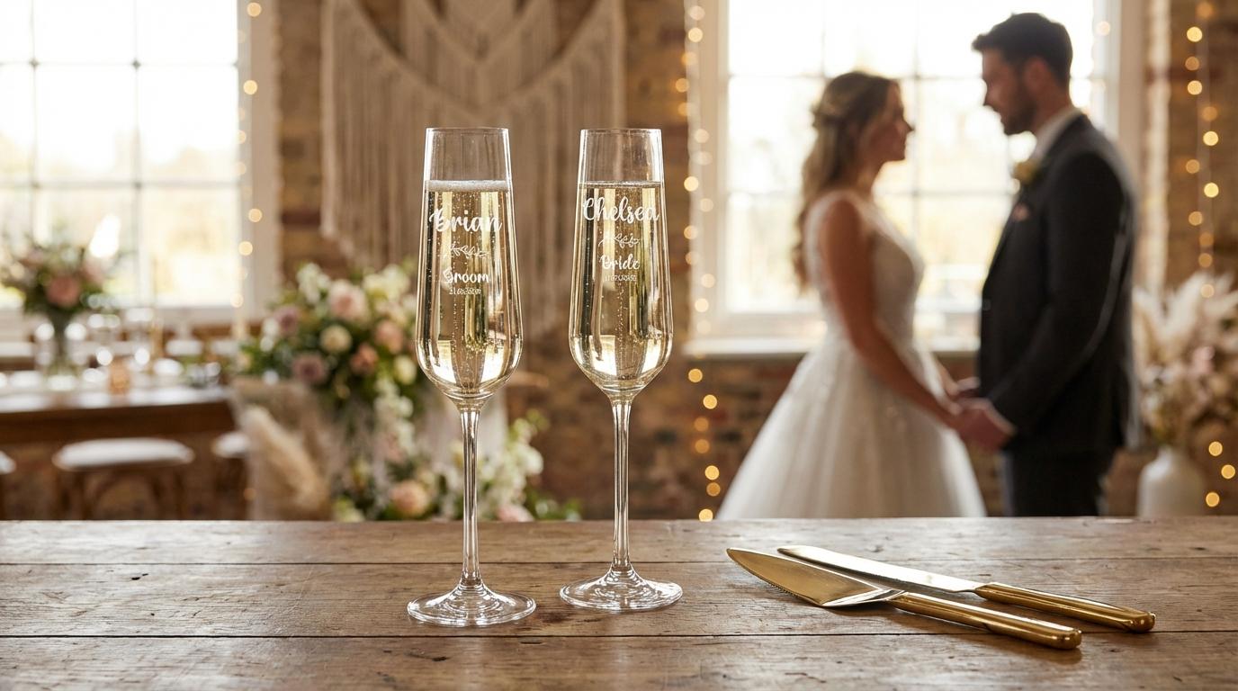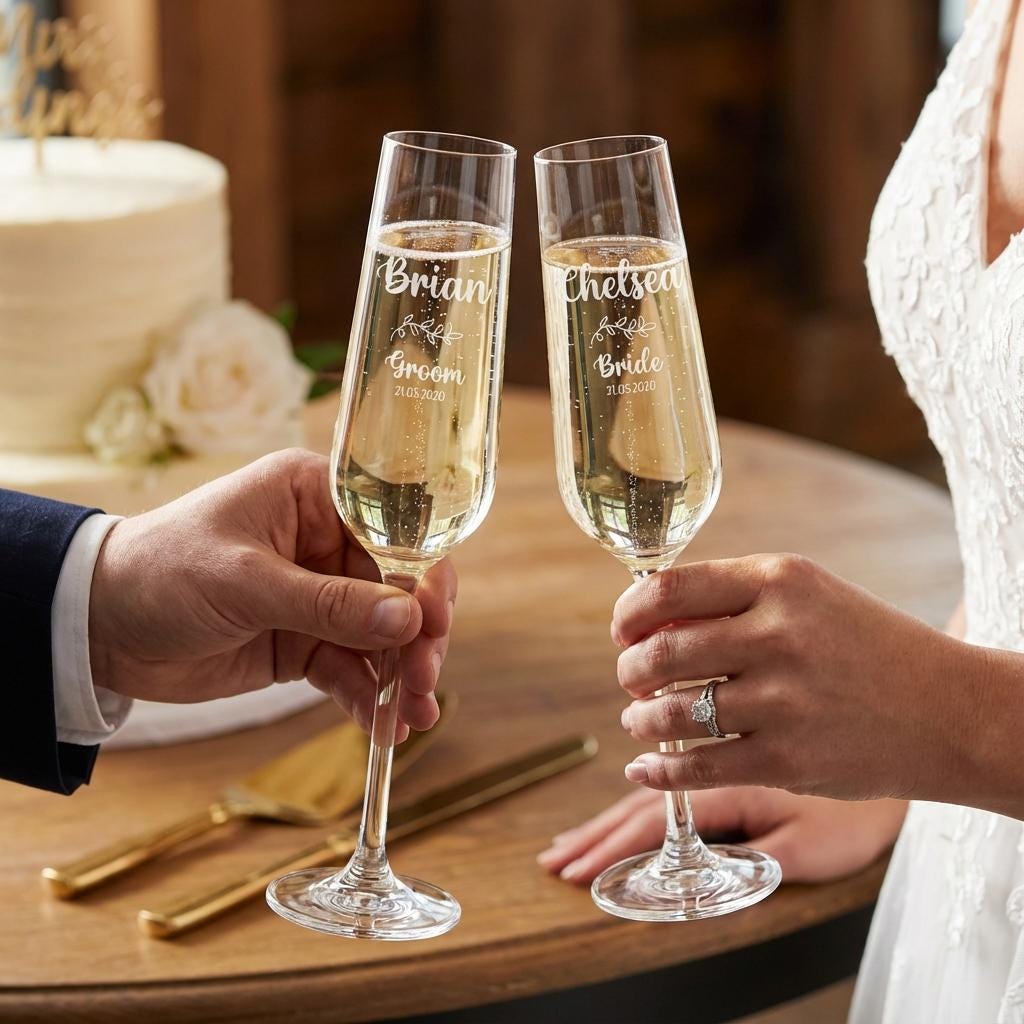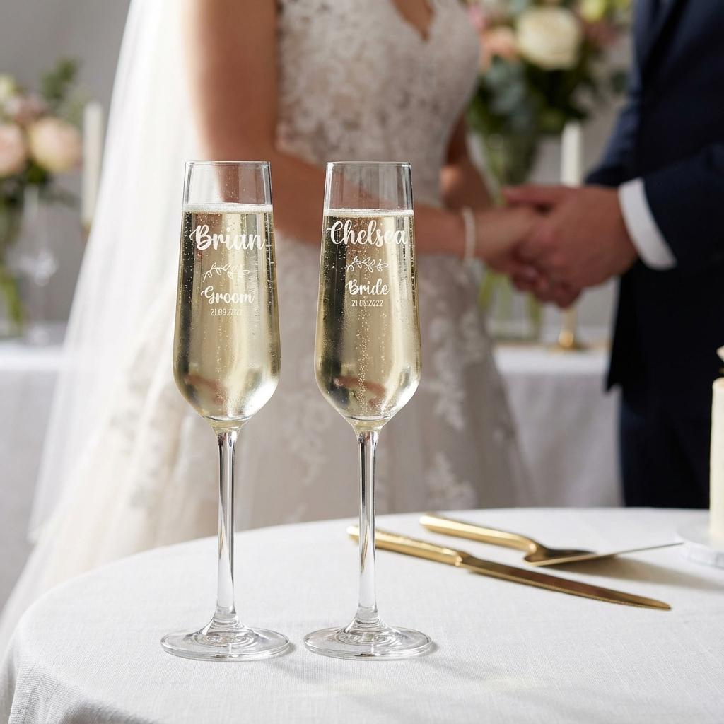 You can choose between a set of two Champagne glasses or a set presented in a stunning engraved box, perfect for gift-giving. Add a touch of luxury to your next celebration with our personalized Champagne glasses!