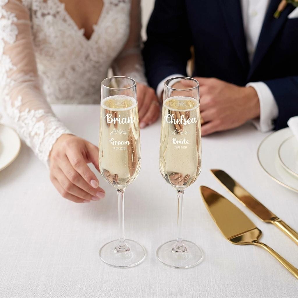 Personalized set of 2 Champagne Glasses, Groom and Bride Champagne Flutes, Custom Engraved Glass, Monogram Champagne Glass, Wedding Gift