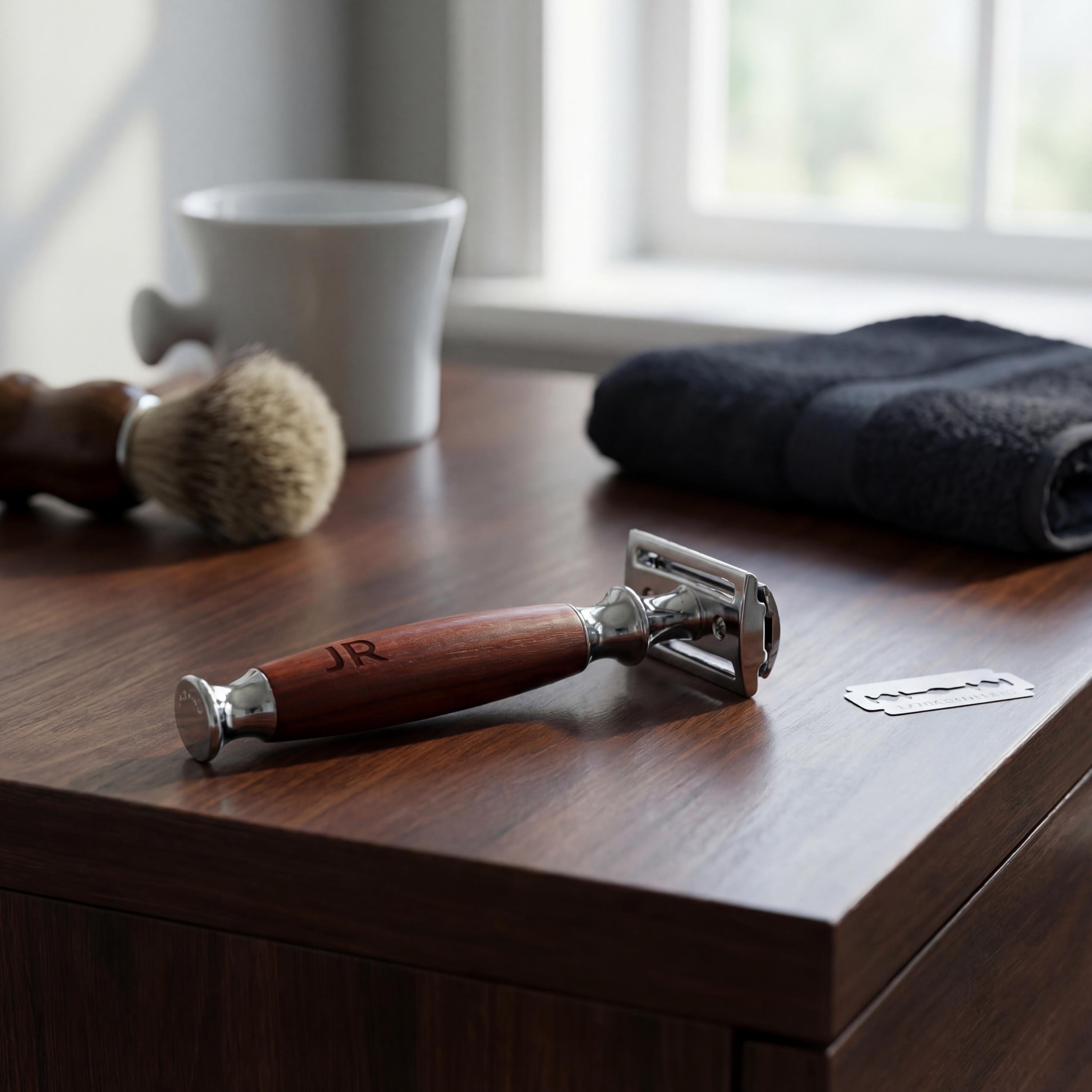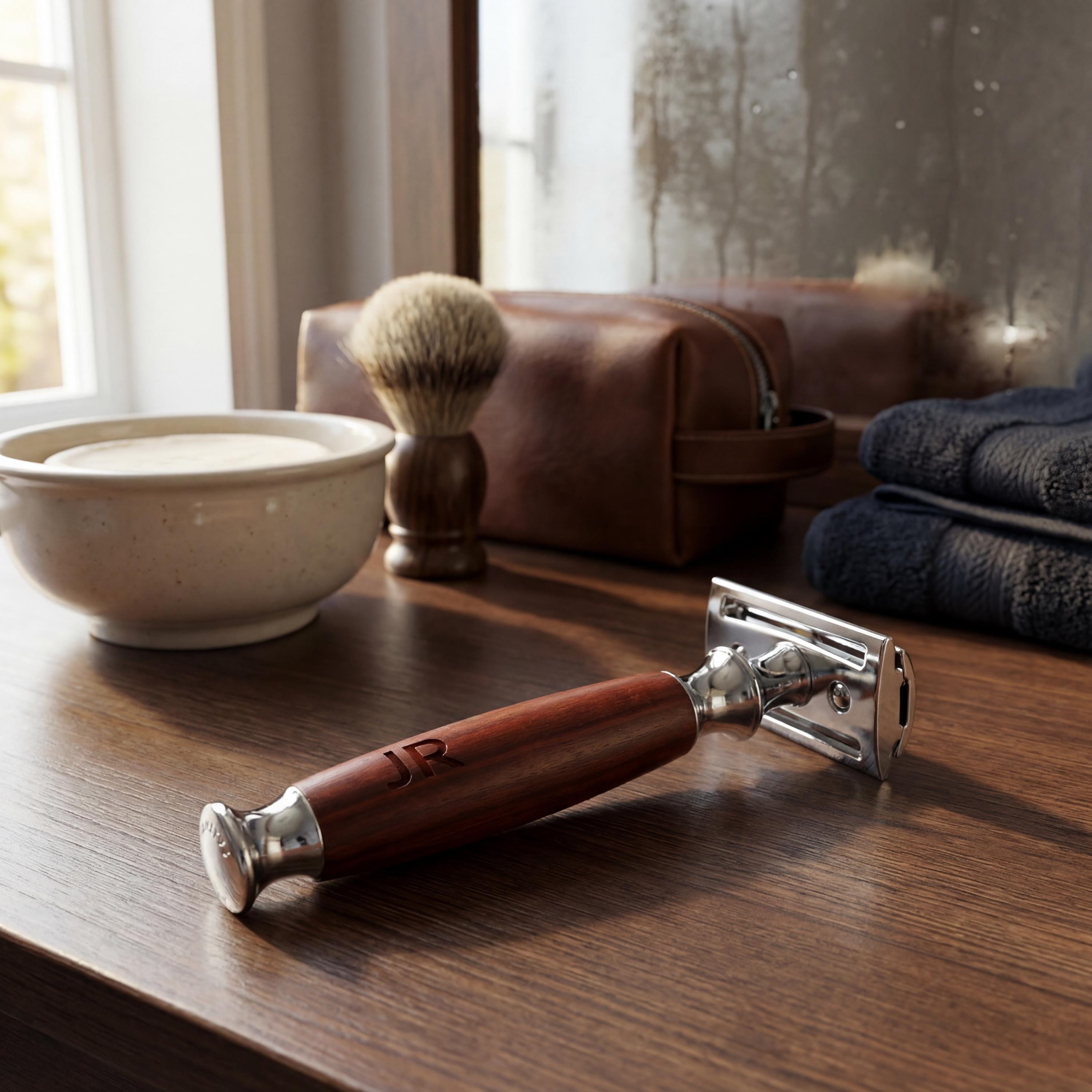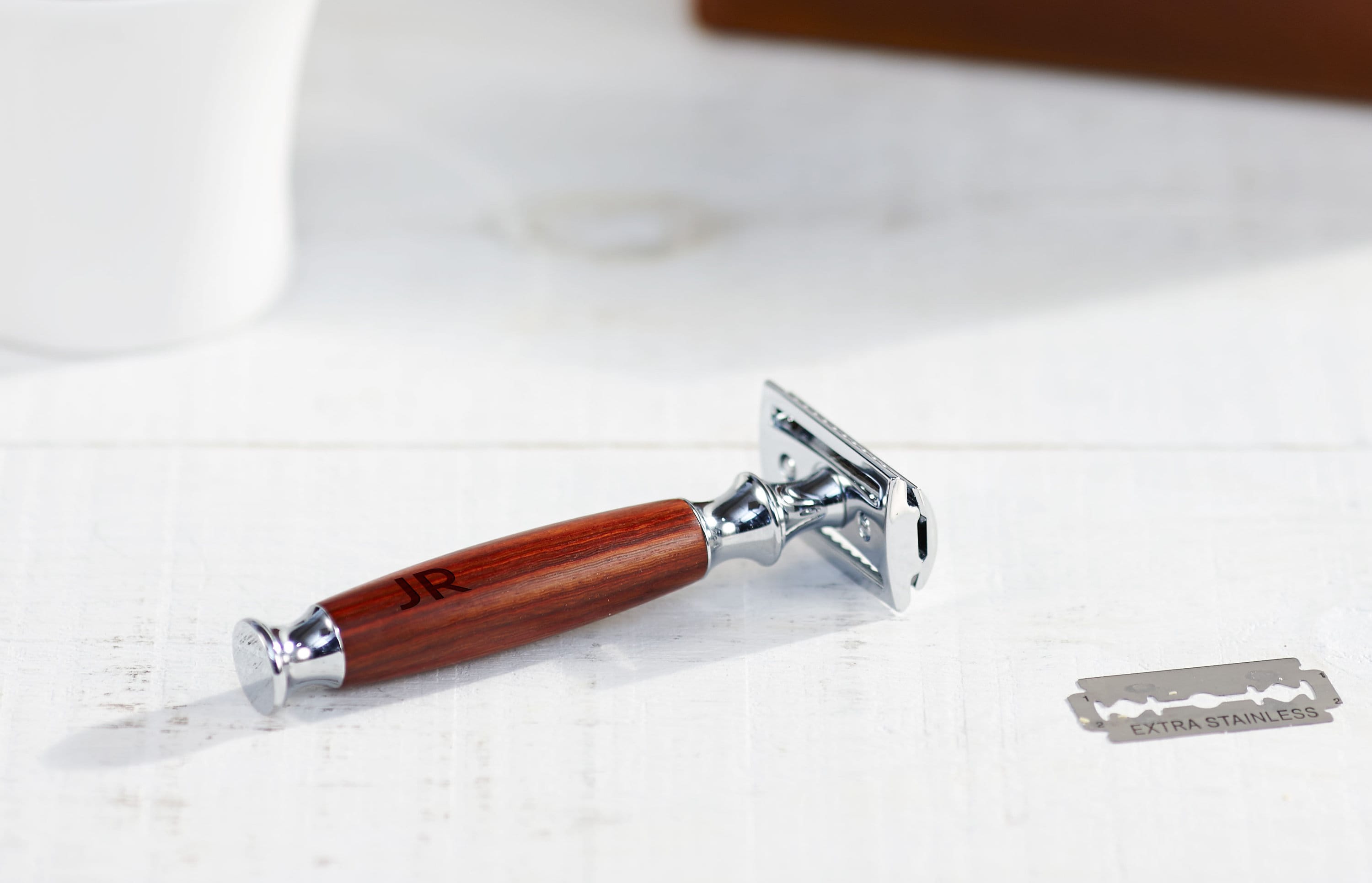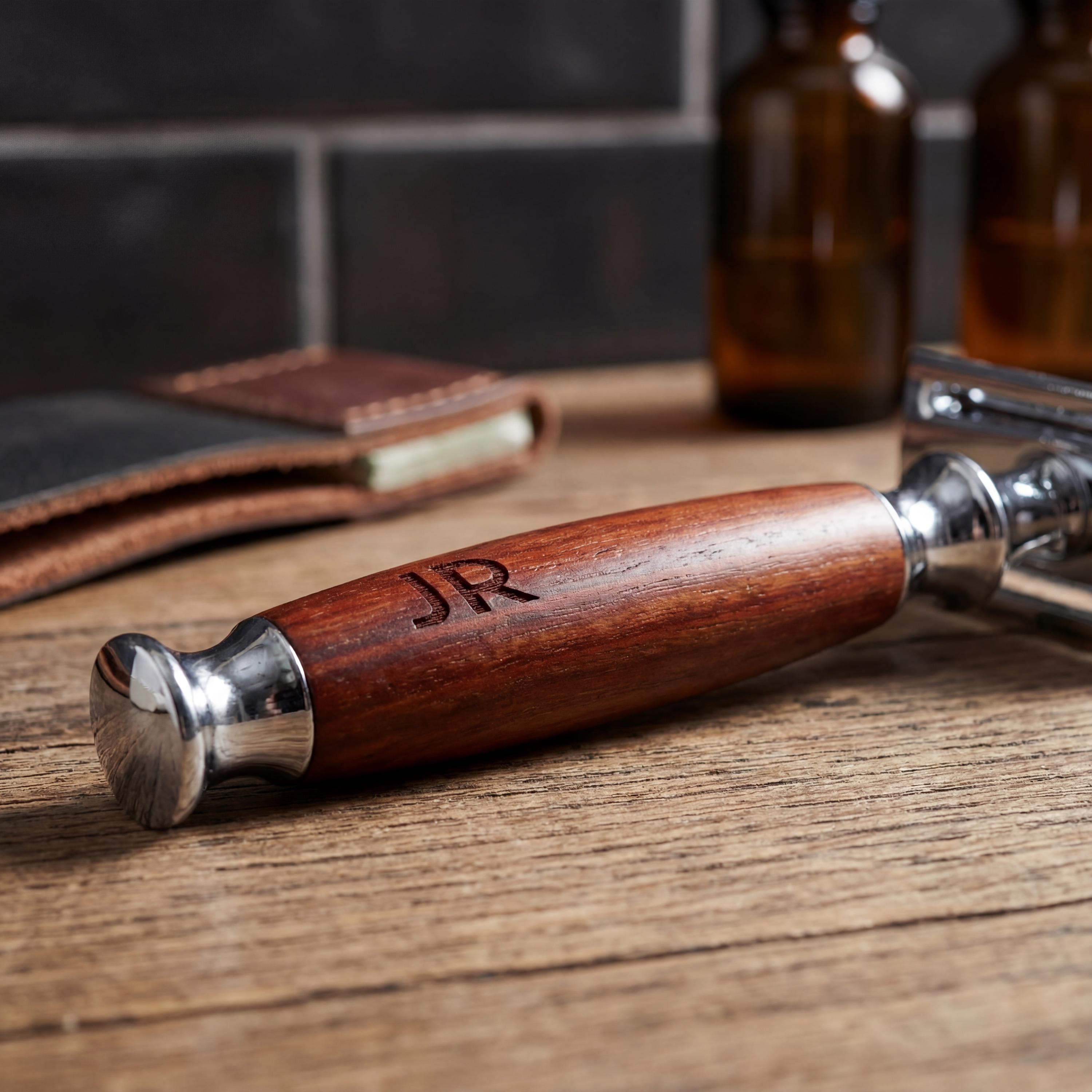Personalized Safety Razor with Sandalwood Handle, Custom Engraved Double Edge Shaving Tool