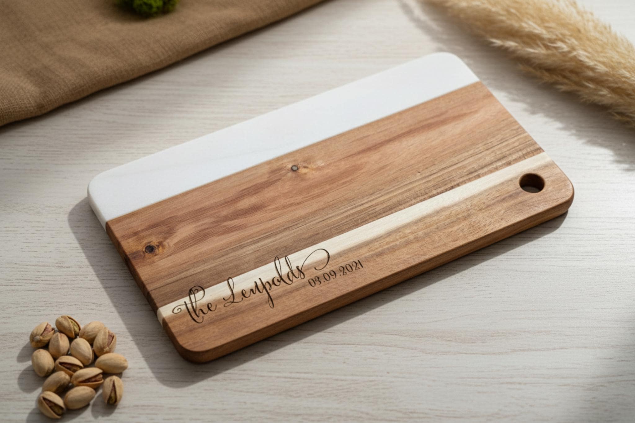 Searching for the perfect gift to commemorate special occasions like weddings, bridal showers, engagements, and housewarming parties? Look no further than our exquisite Personalized Acacia Wood and White Marble Cheese Board.