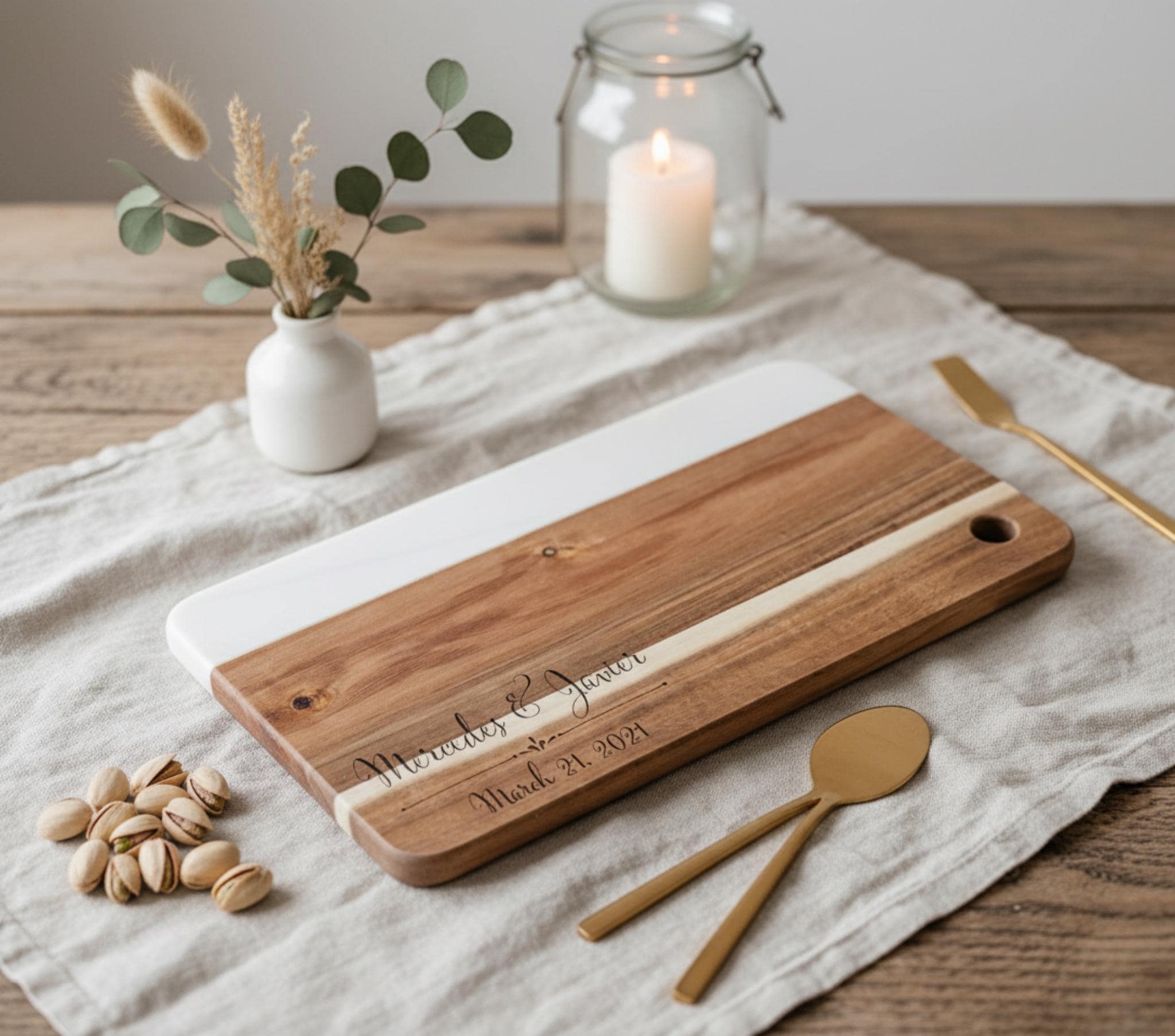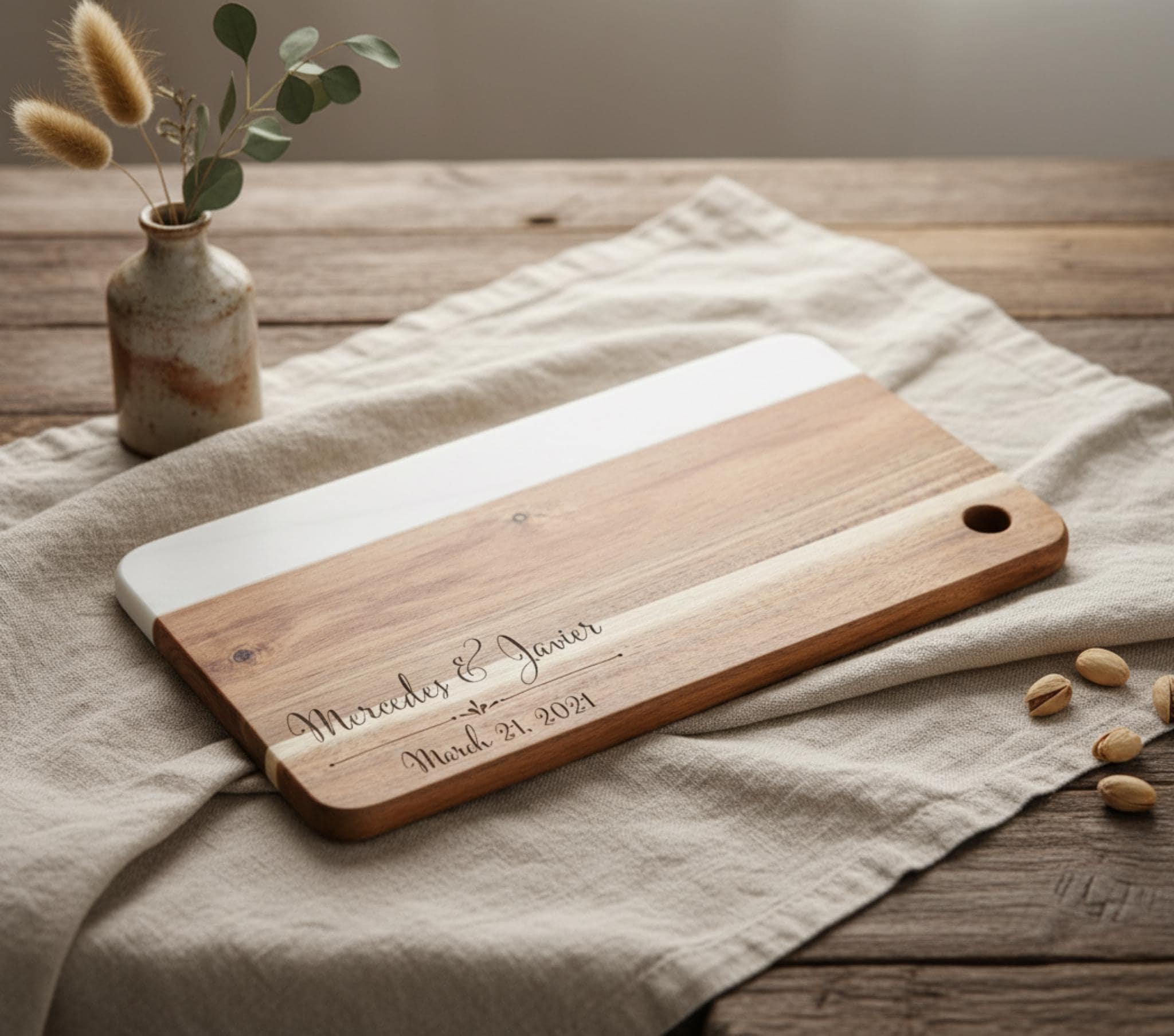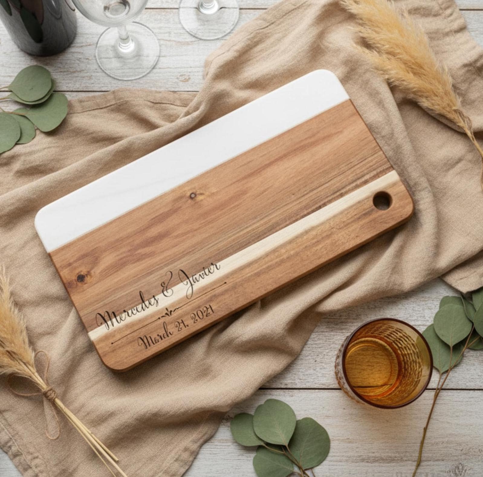 Looking for the perfect gift for your loved ones or friends? Look no further than our personalized Acacia wood and white marble cheese board! This unique and elegant cheese board is an ideal gift for weddings, bridal showers, engagements, and housewarming parties.