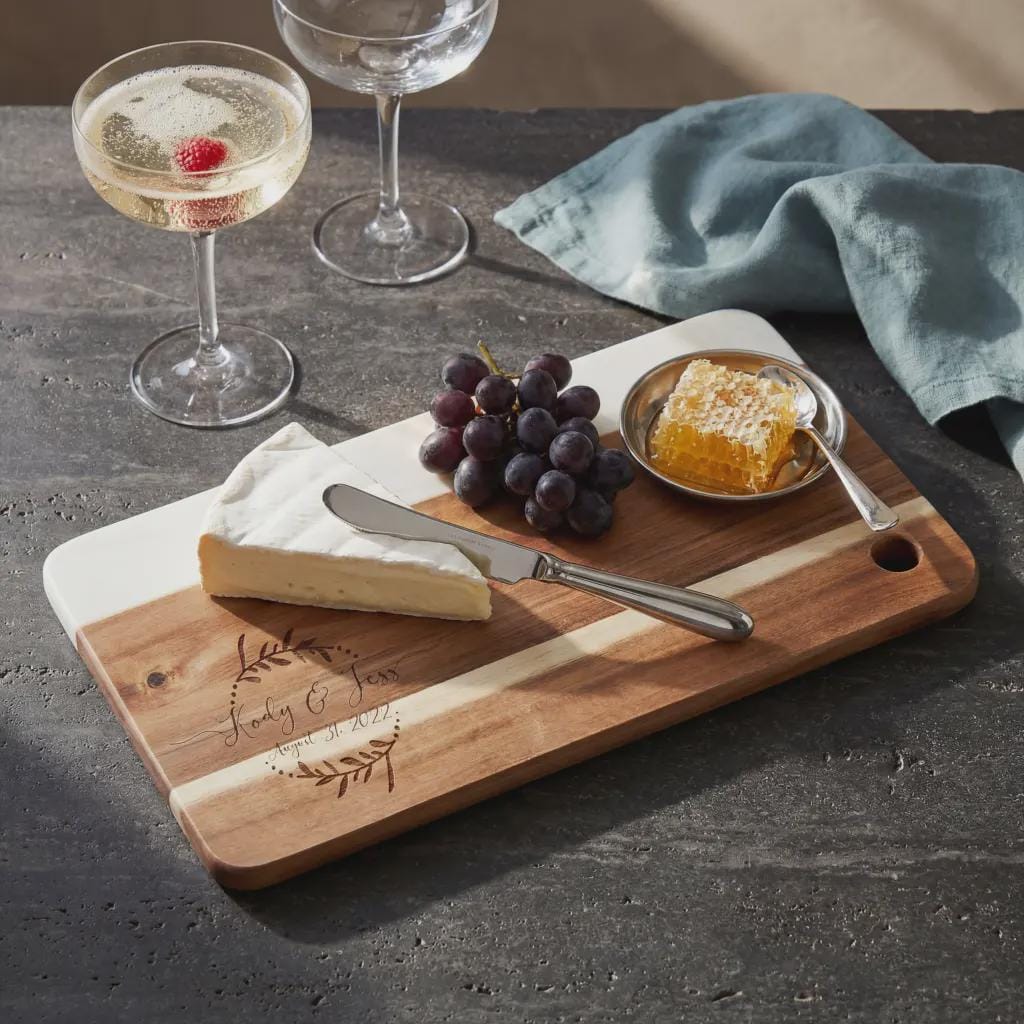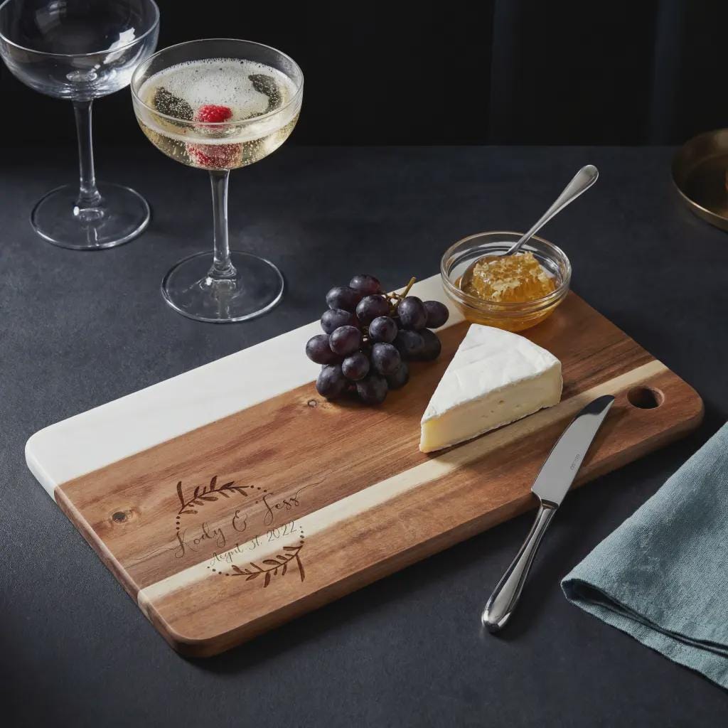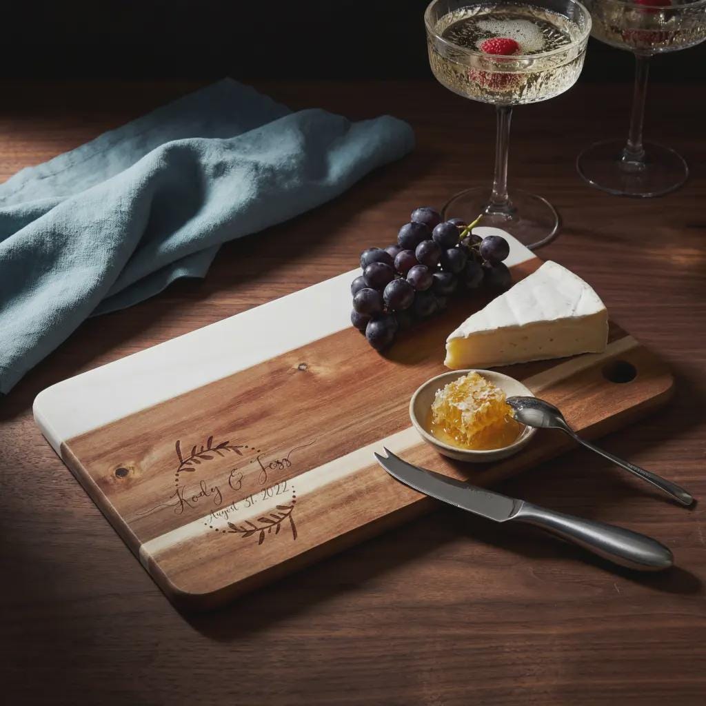 Host with elegance using this handcrafted acacia wood and white marble serving board, personalized with a delicate laser-etched laurel wreath and your custom names. This premium mixed-material charcuterie tray provides a stunning backdrop for wine and cheese pairings, making it a sophisticated centerpiece for any kitchen or dining table. It serves as a meaningful keepsake for a couple's engagement, a unique housewarming surprise, or a timeless anniversary memento that combines modern style with personalized charm.