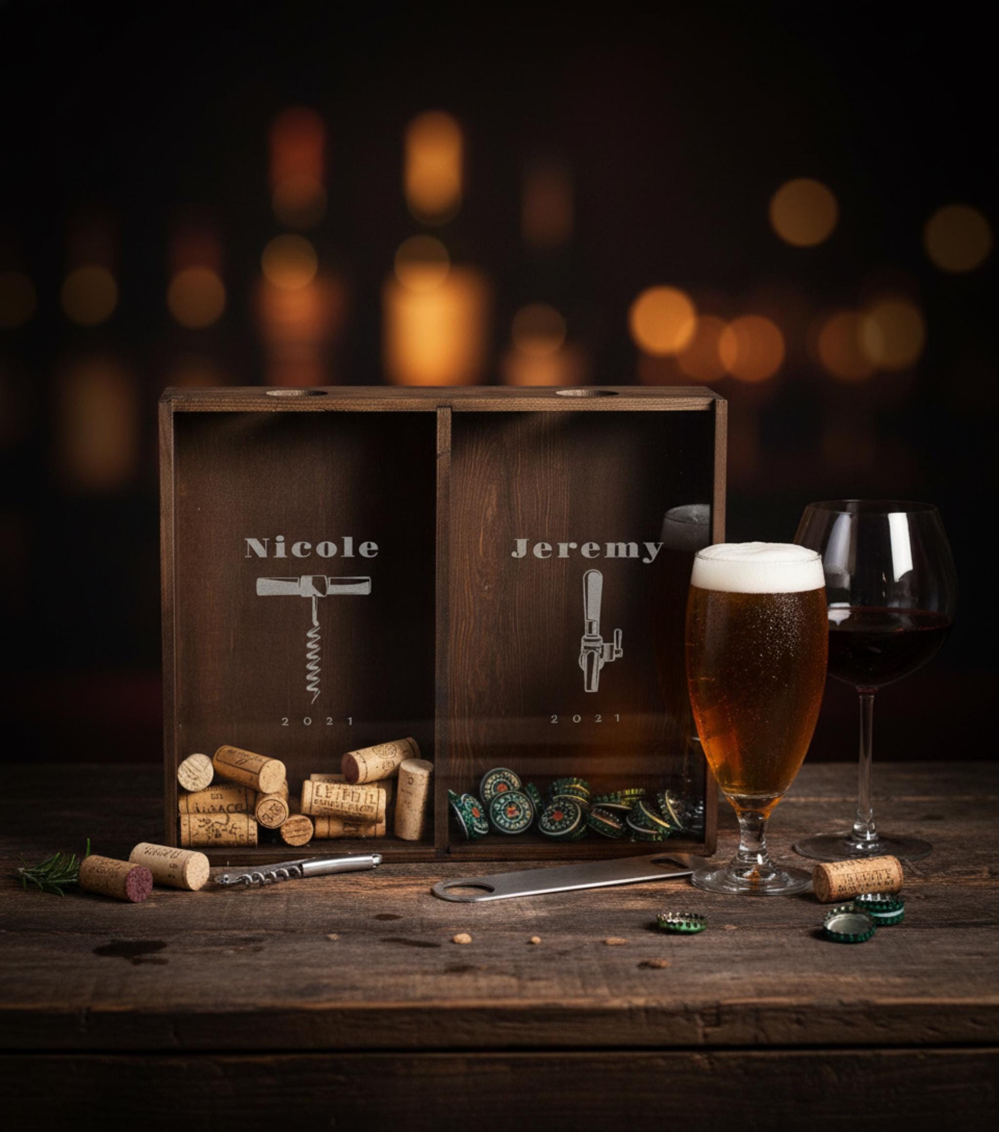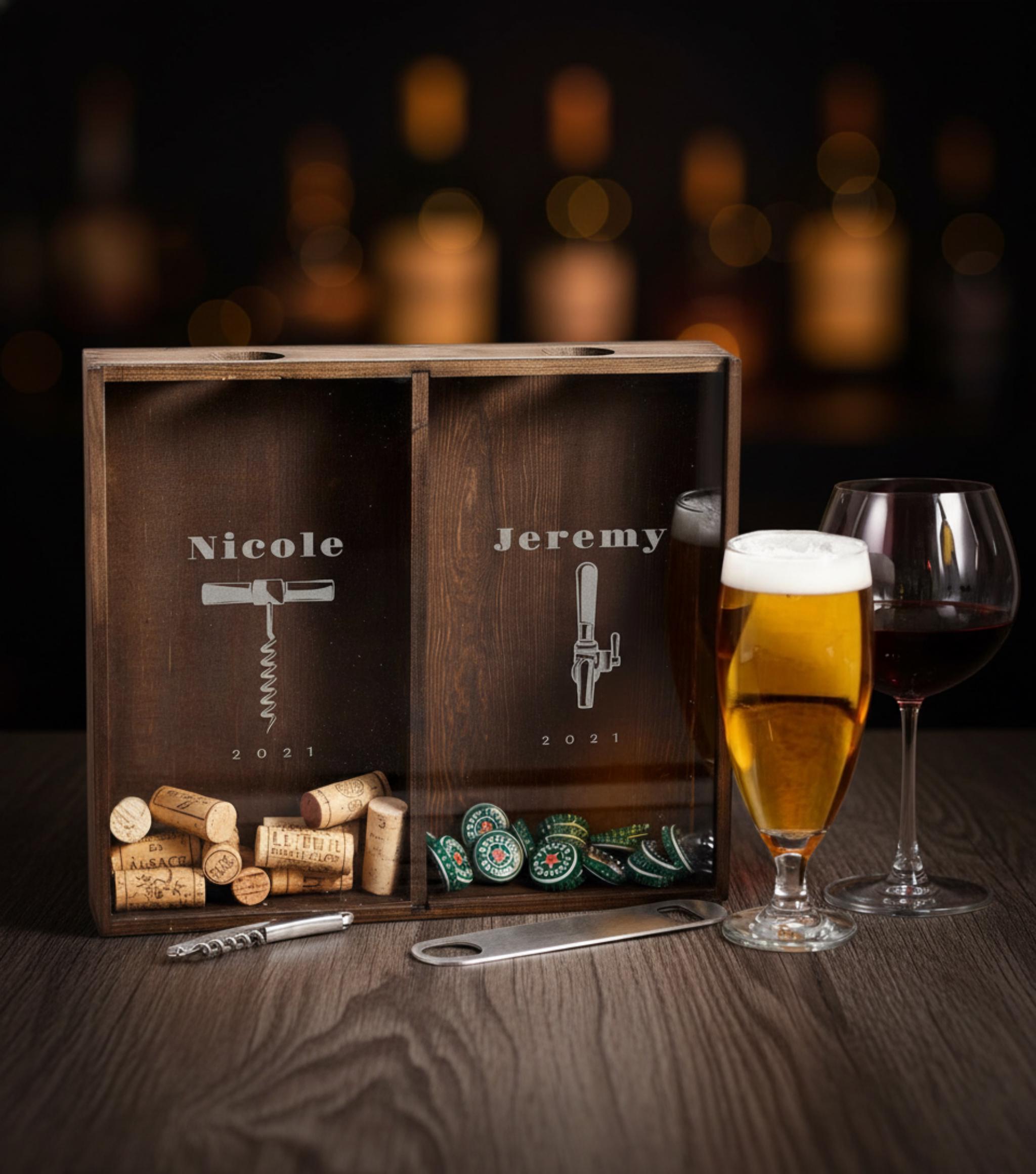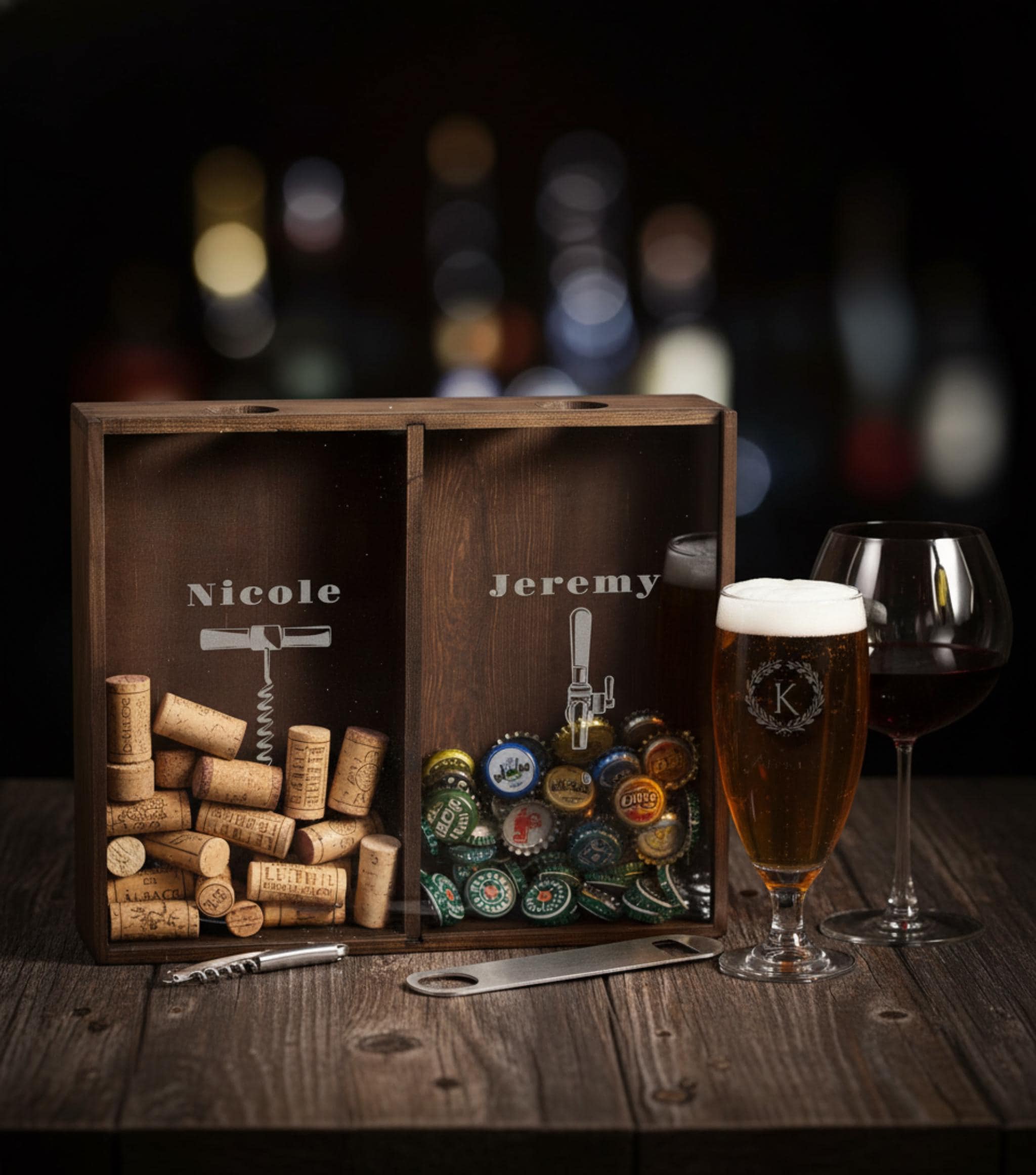 Personalized Beer Cap and Wine Cork Holder: Engraved Dark Walnut Shadow Box