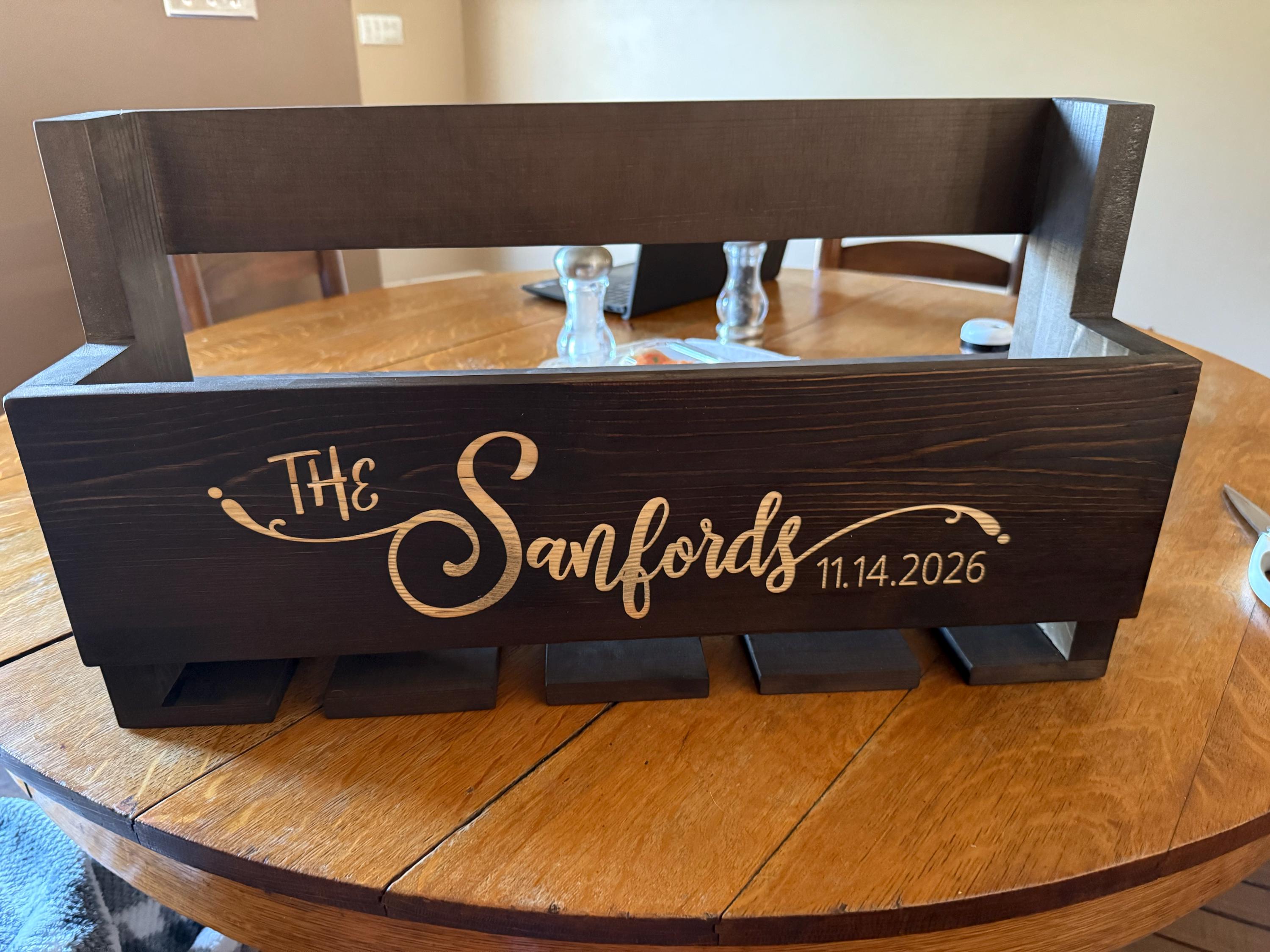 This came out so beautifully! The customized name and quality of rack was perfect; exactly as shown here. My mom and step dad really loved it