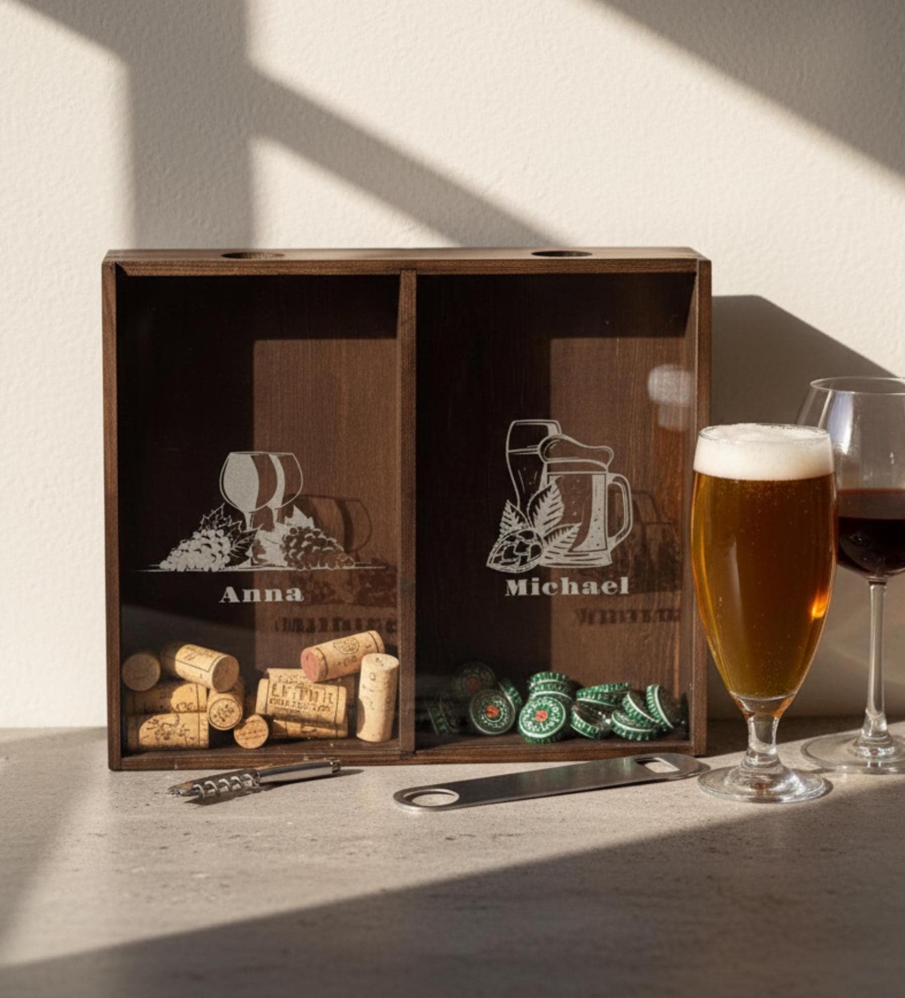 Personalized Beer Cap holder, Wine Cork Holder, Custom Engraved Rustic Wooden Shadow Box, Gift For The Couple, Home Decor, Housewarming Gift