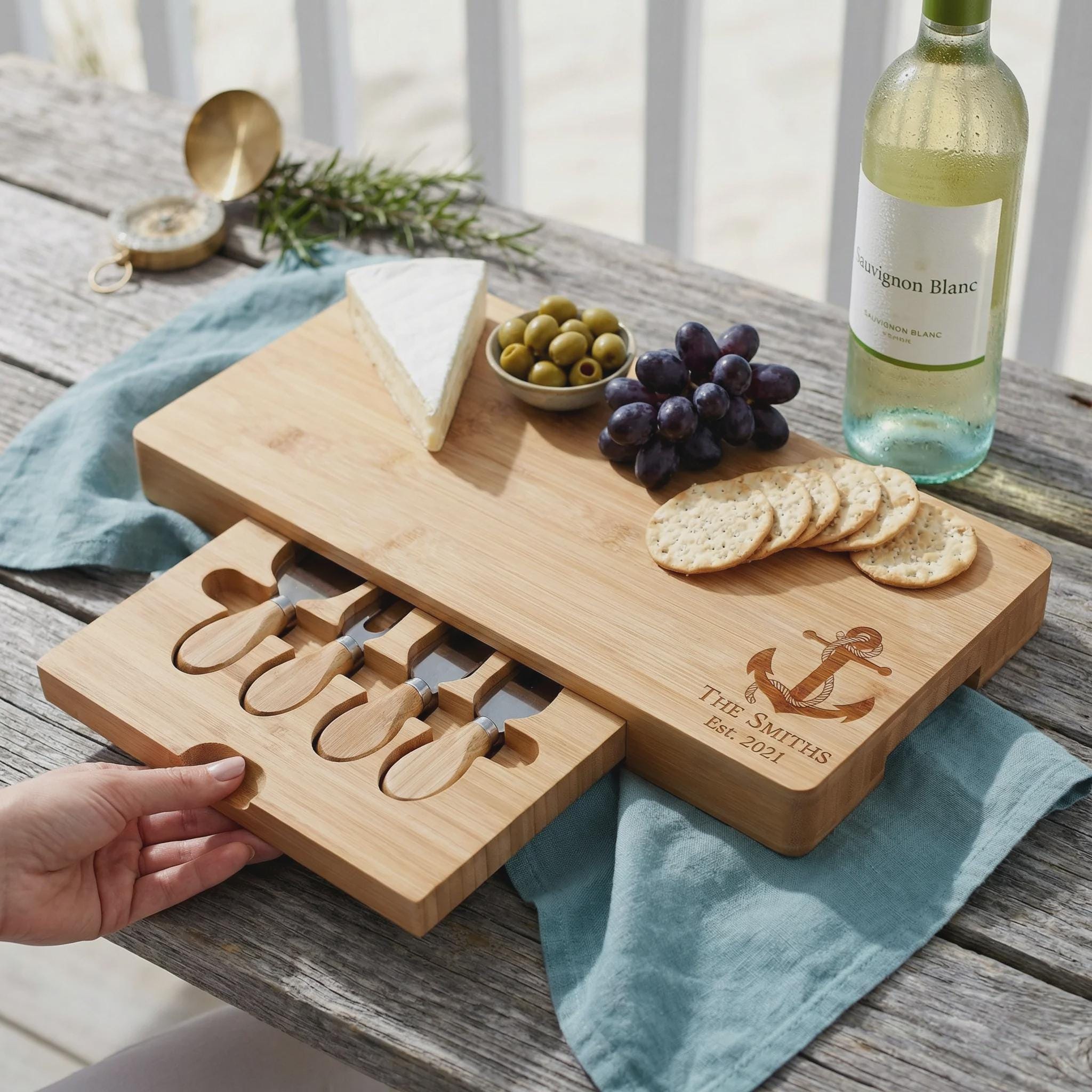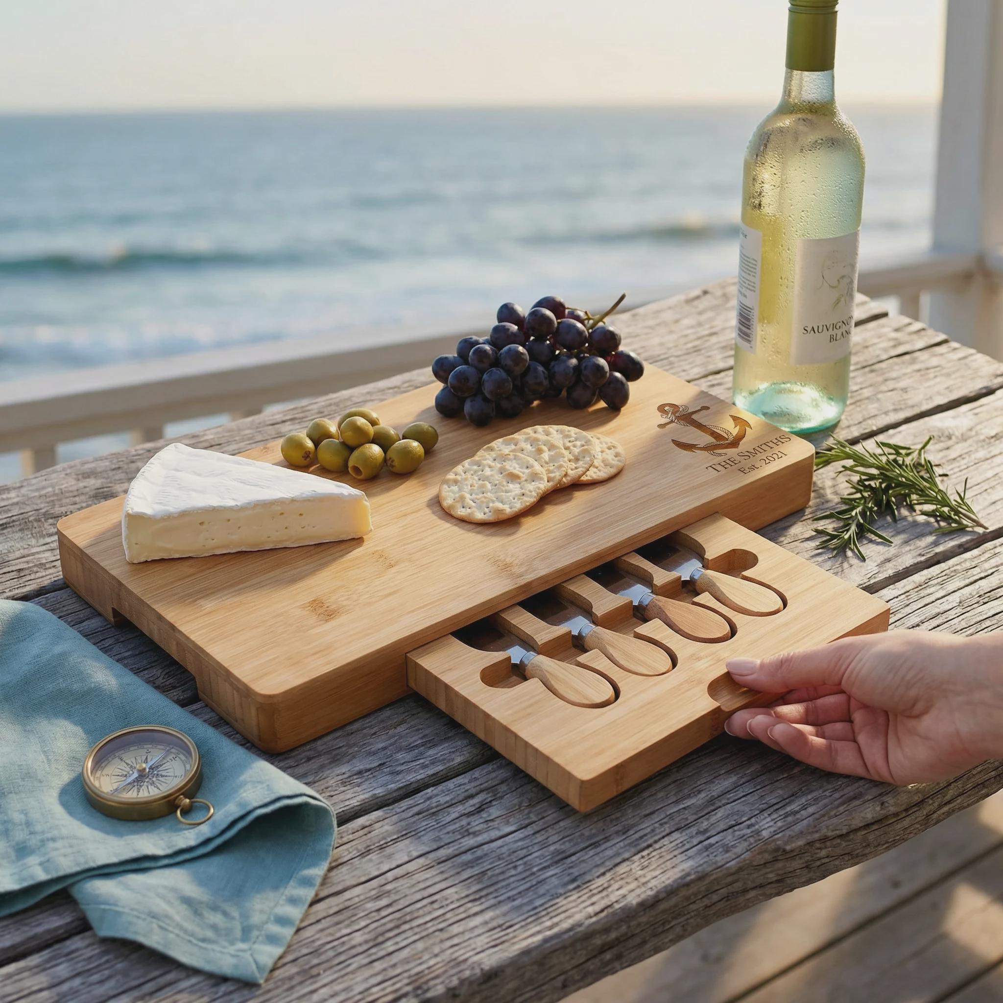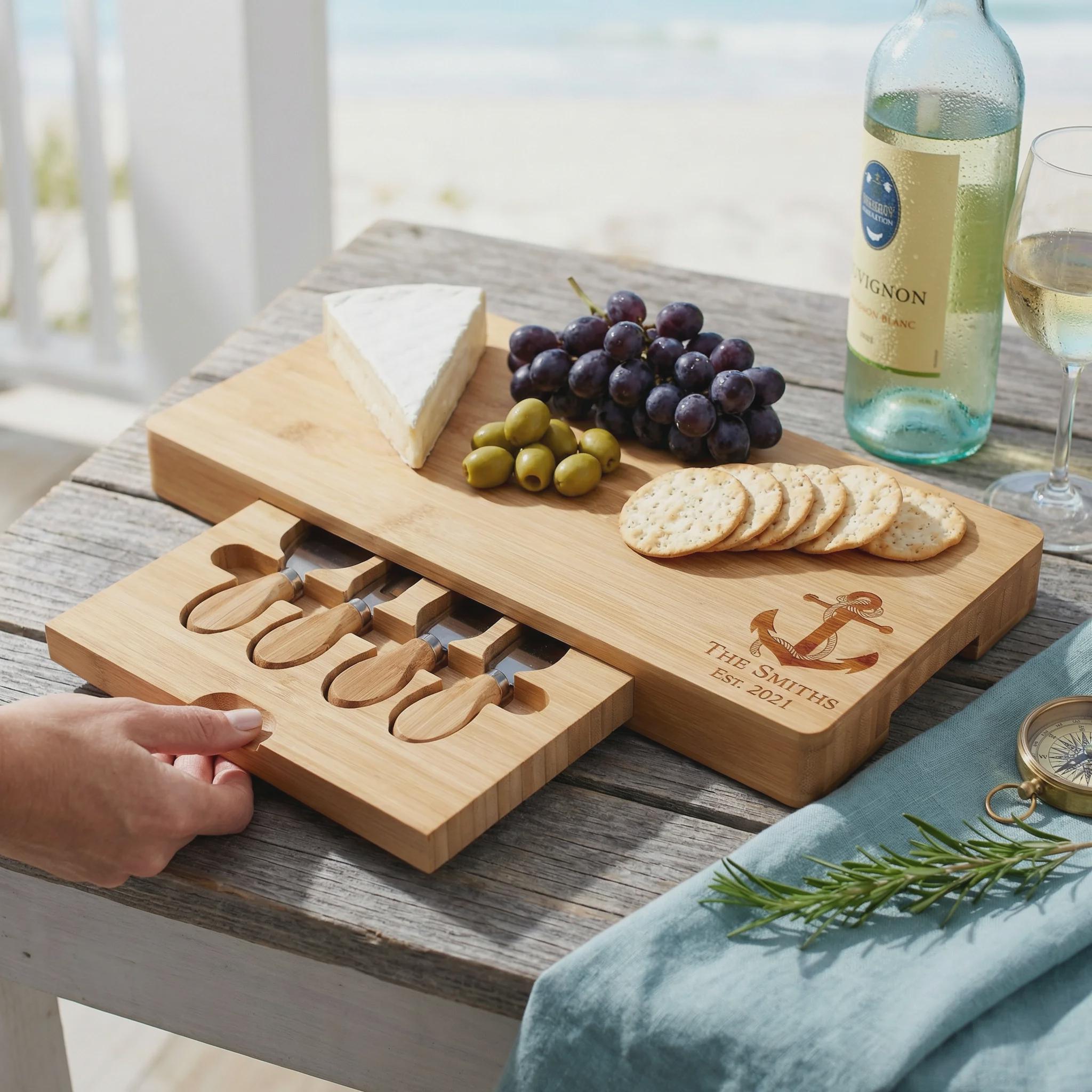Host your next gathering in maritime style with this elegant anchor bamboo charcuterie board, personalized with your family name and established date. This premium cheese set features a hidden slide-out drawer with four professional stainless steel tools, making it a functional and beautiful centerpiece for beach house entertaining. It is a thoughtful 5th-anniversary surprise, a unique nautical housewarming gift, or a custom wedding keepsake for couples who love the sea.