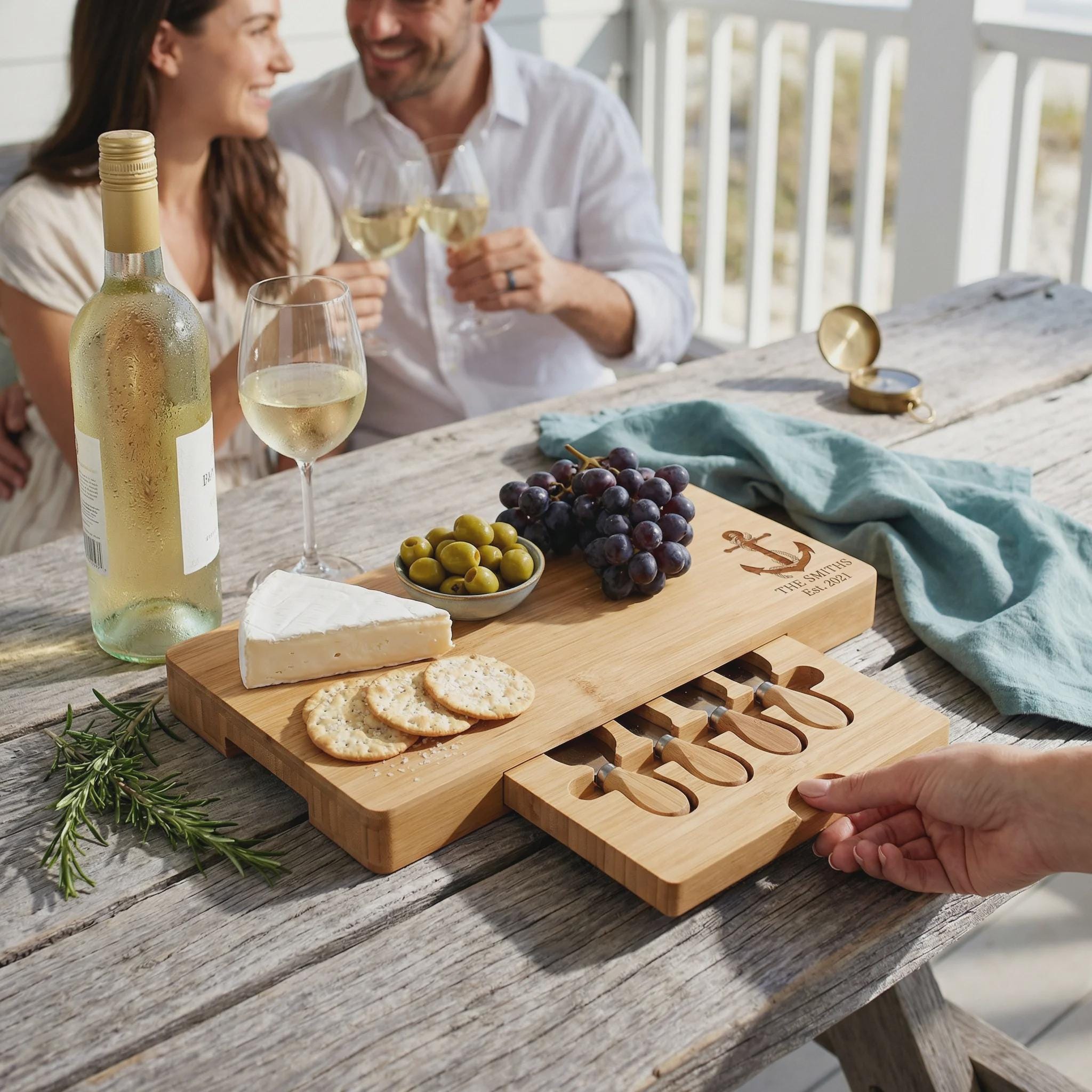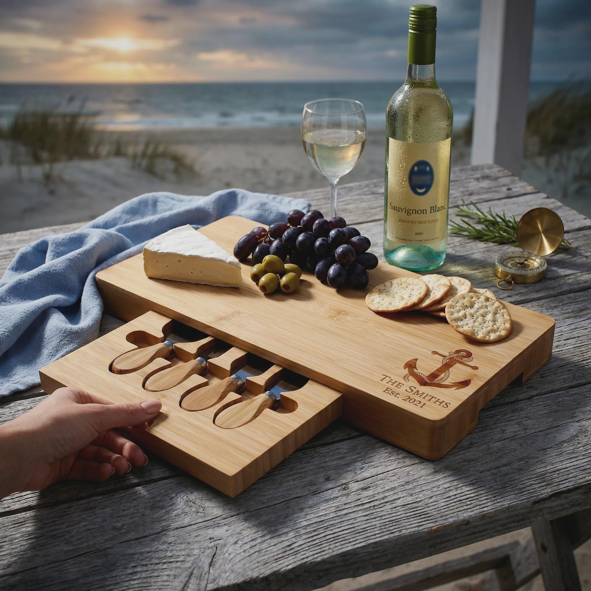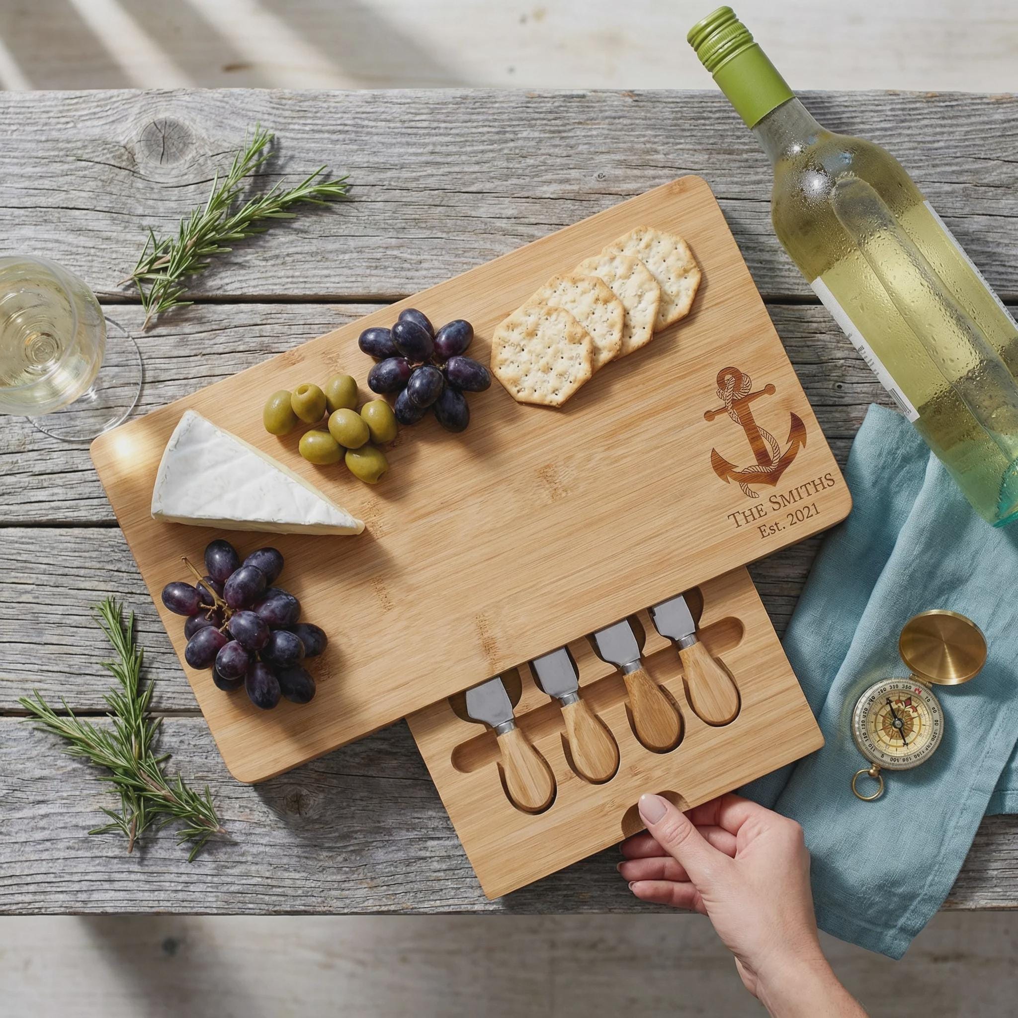 Host your next gathering in maritime style with this elegant anchor bamboo charcuterie board, personalized with your family name and established date. This premium cheese set features a hidden slide-out drawer with four professional stainless steel tools, making it a functional and beautiful centerpiece for beach house entertaining. It is a thoughtful 5th-anniversary surprise, a unique nautical housewarming gift, or a custom wedding keepsake for couples who love the sea.