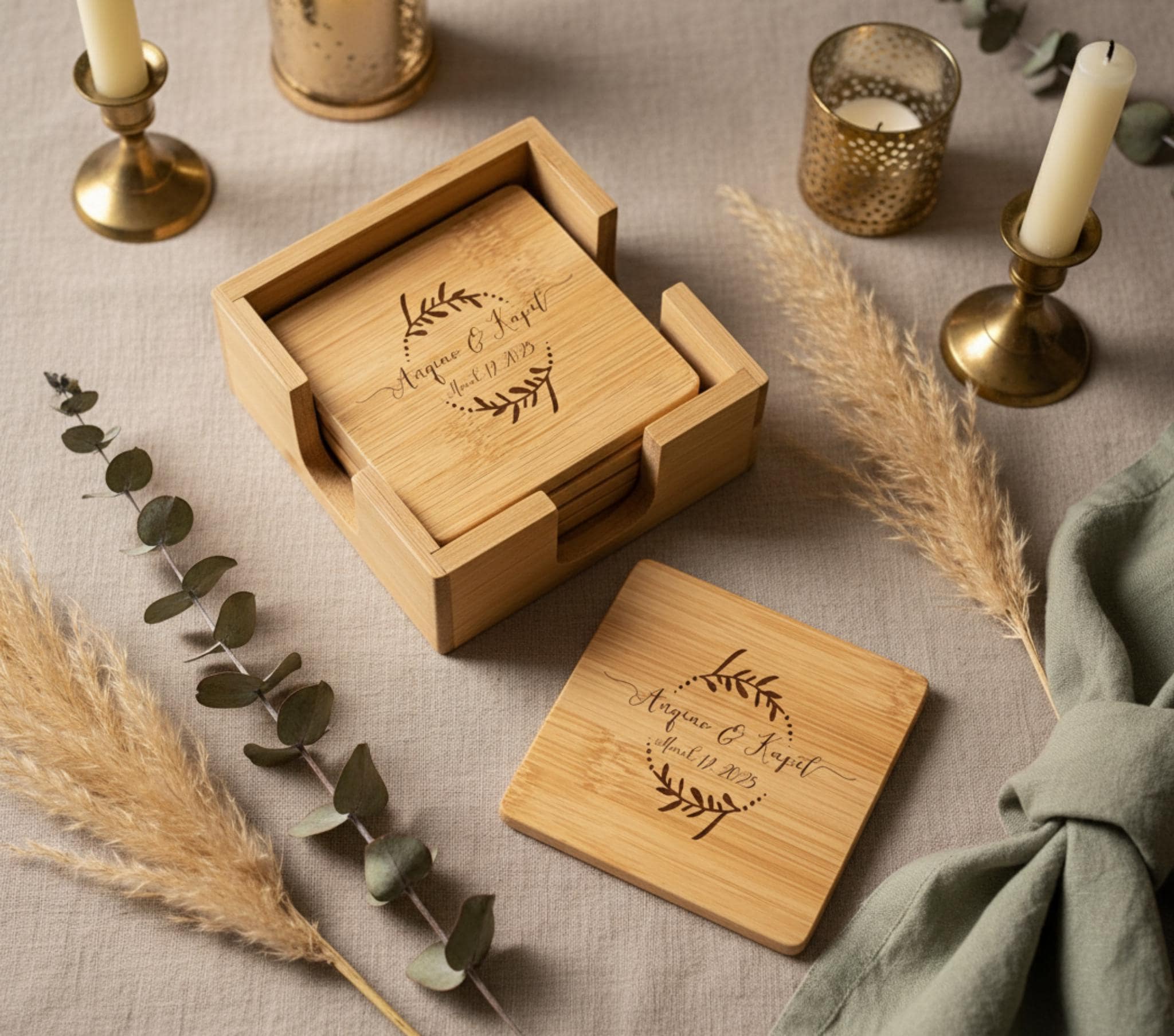 Chic & Functional: Enjoy a set of five custom-engraved coasters designed to protect your surfaces in style.