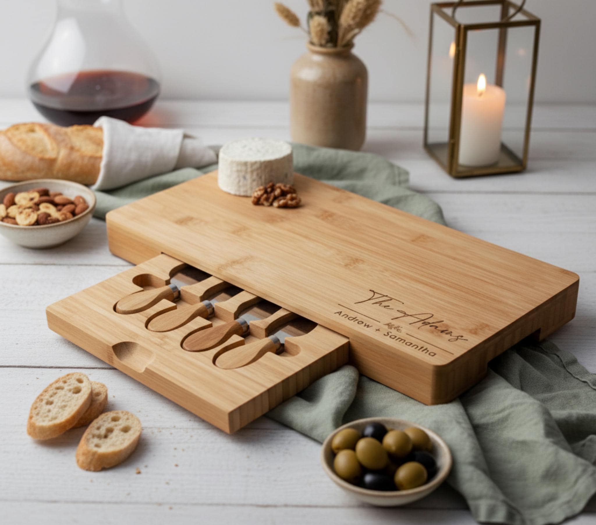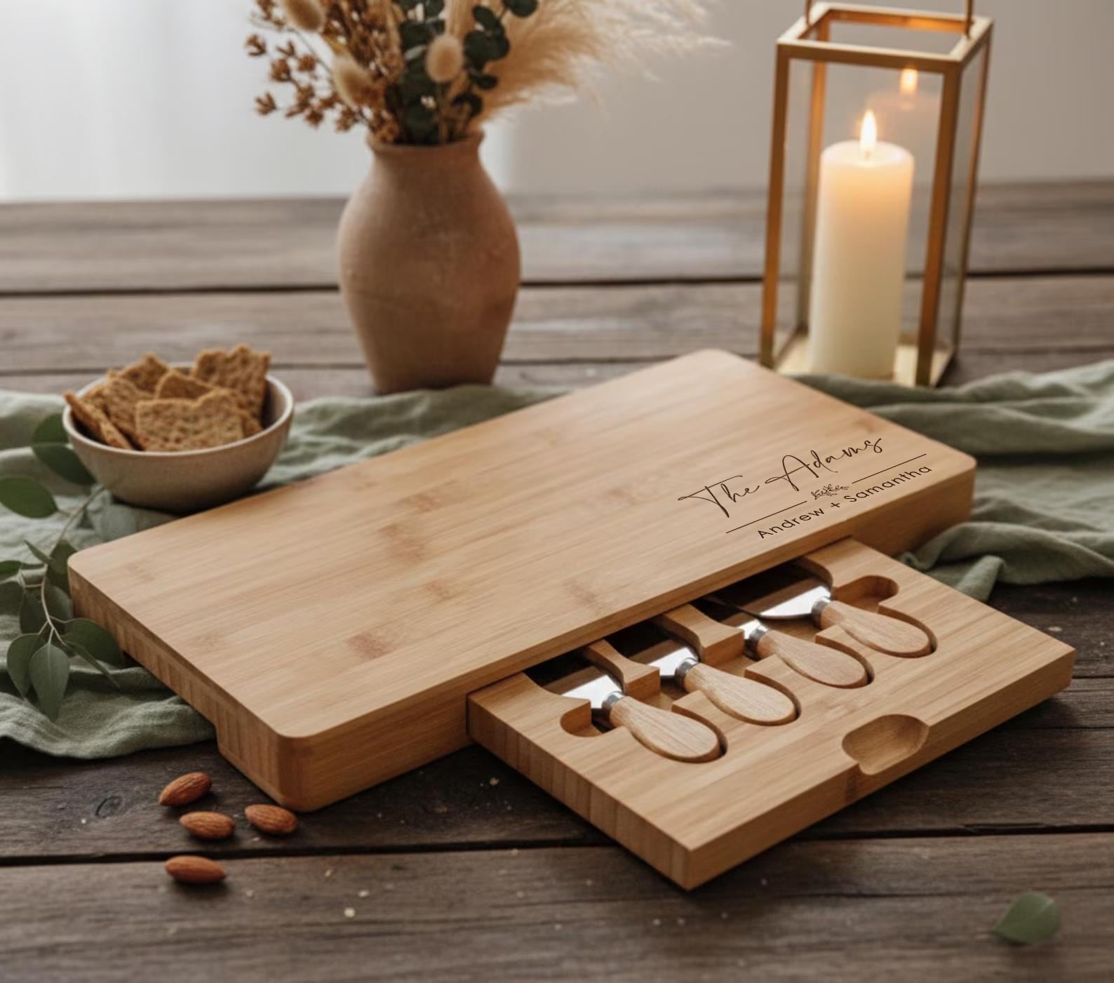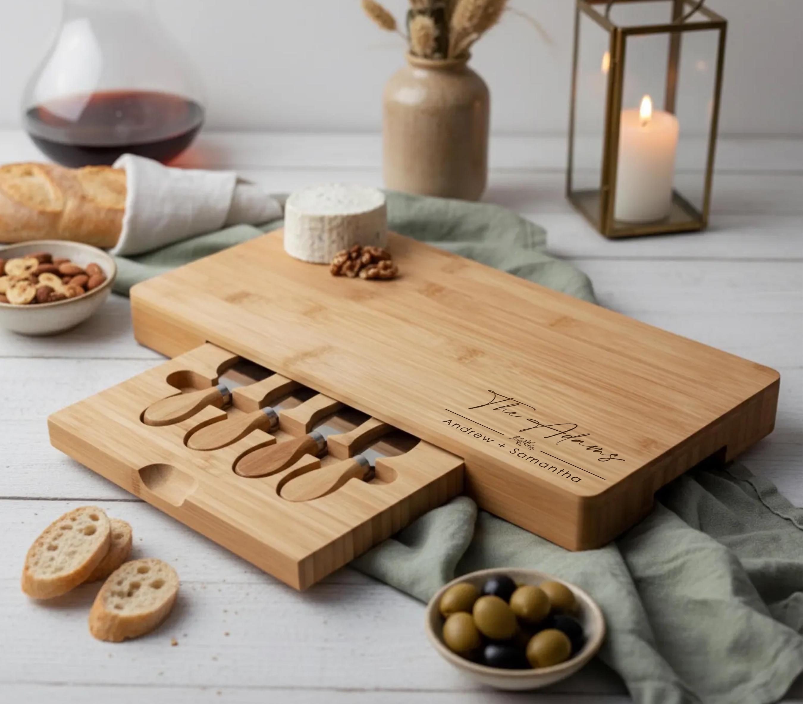 Personalized Bamboo Cheese Board Set with Drawer and Utensils - Custom Engraved Charcuterie Board - Wedding, Housewarming Gift