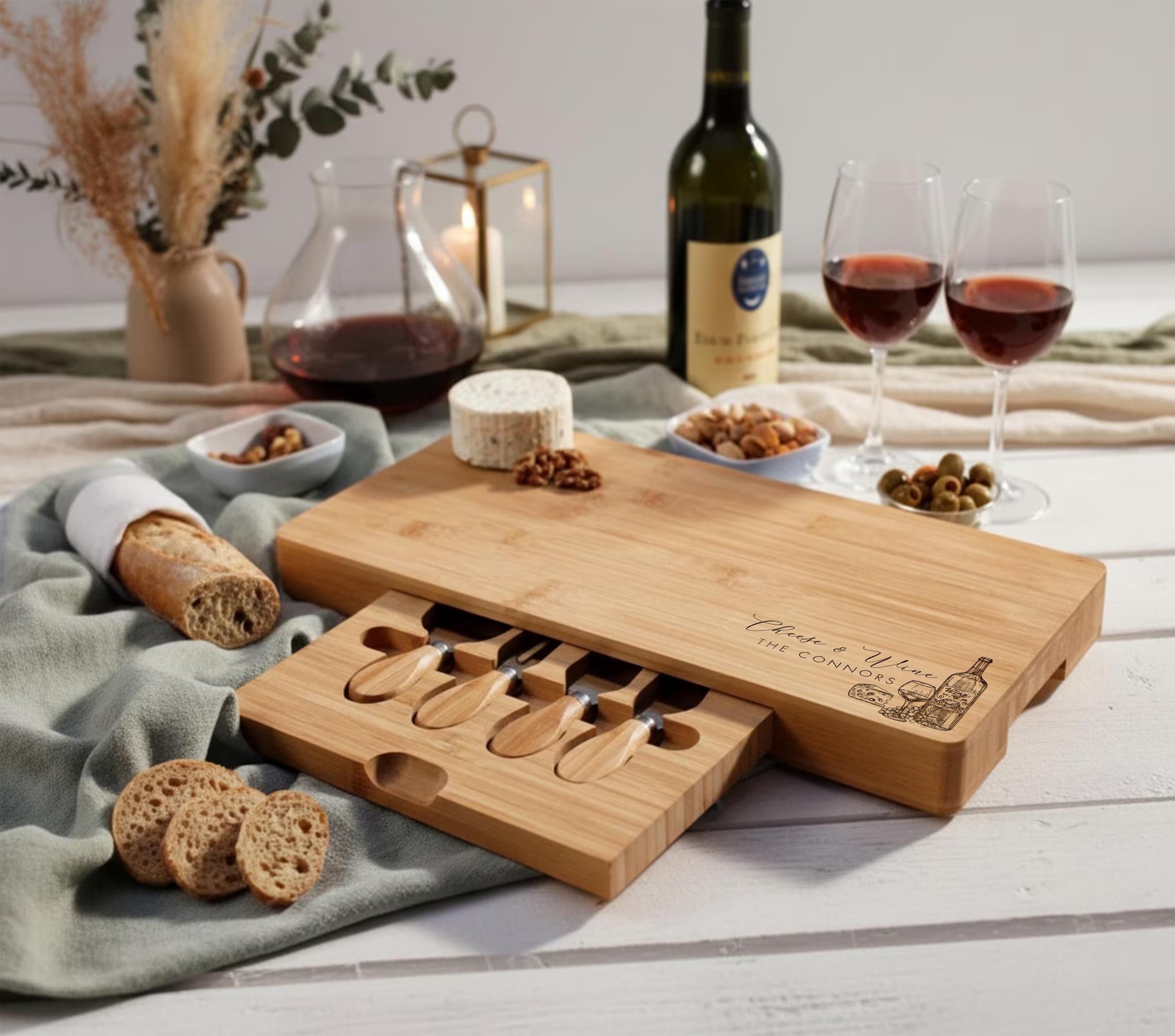 Cheese Board Set: Enjoy the custom engraved cheese board, showcasing your love story with its integrated utensil storage—perfect for gourmet spreads and intimate celebrations.