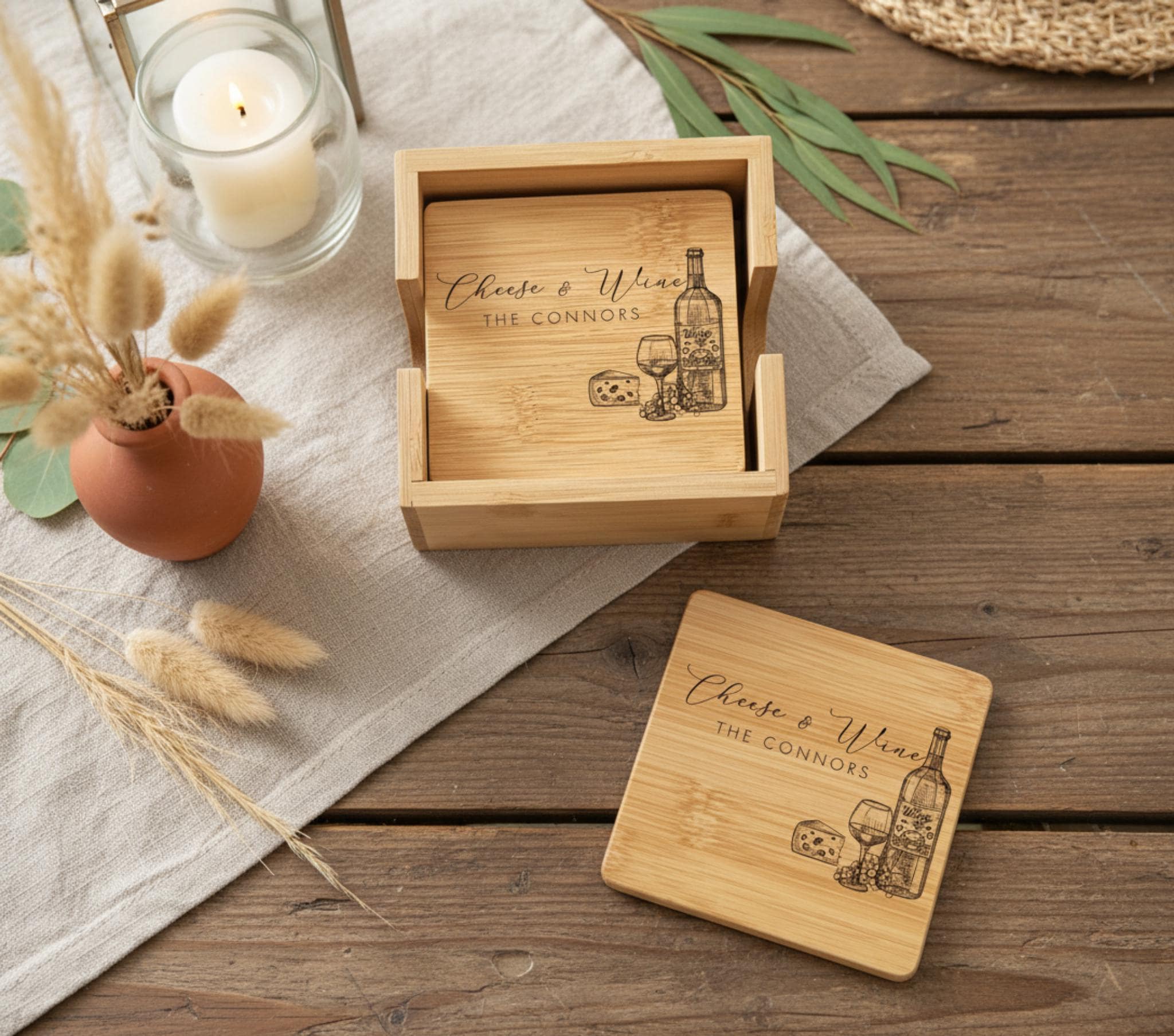 Combo Set: For a complete serving experience, opt for the combo set which combines the custom engraved cheese board with the matching 5-piece coaster set—offering a comprehensive solution for refined entertaining.