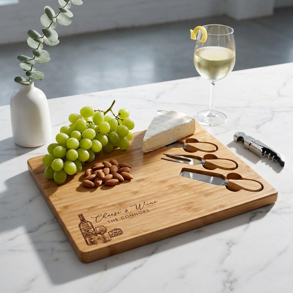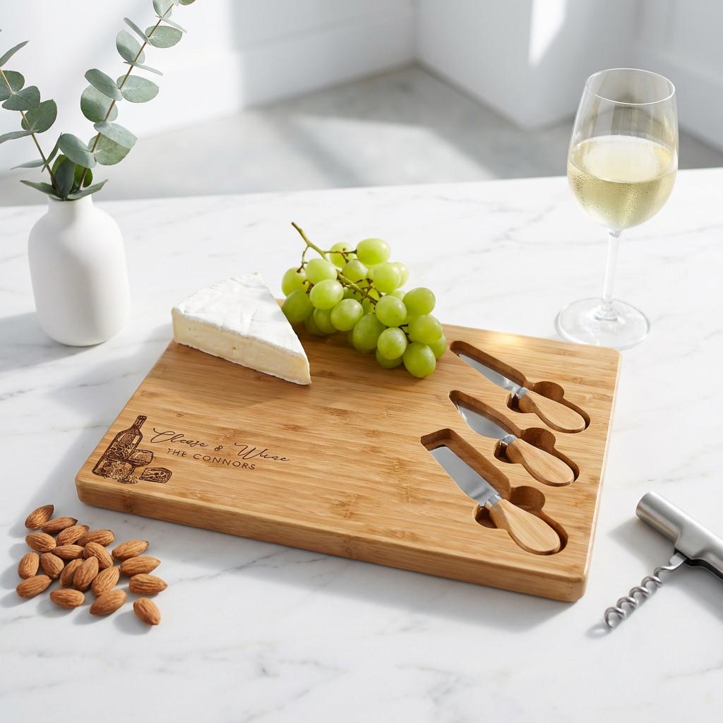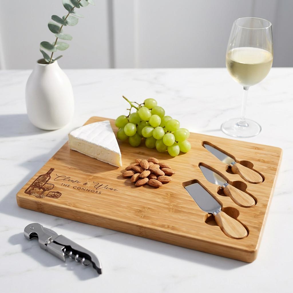 Make hosting easy (and beautiful) with a personalized bamboo cheese board set—engraved with a name, family title, or short message. This charcuterie board is perfect for date nights, wine-and-cheese evenings, and entertaining guests, and it also makes a meaningful keepsake for weddings and new homes.
