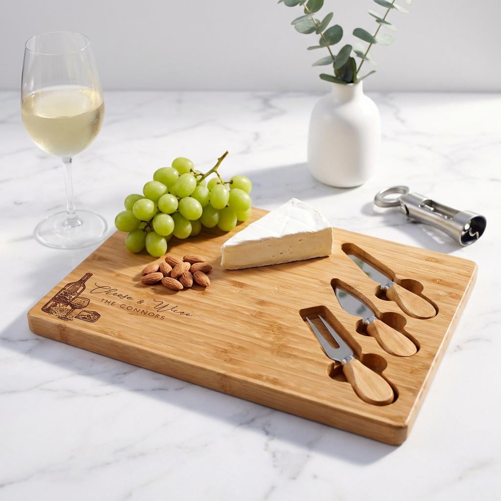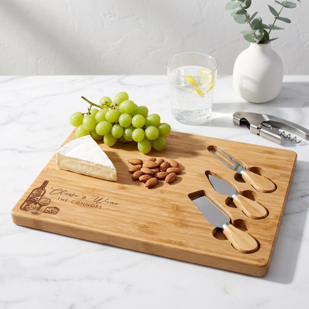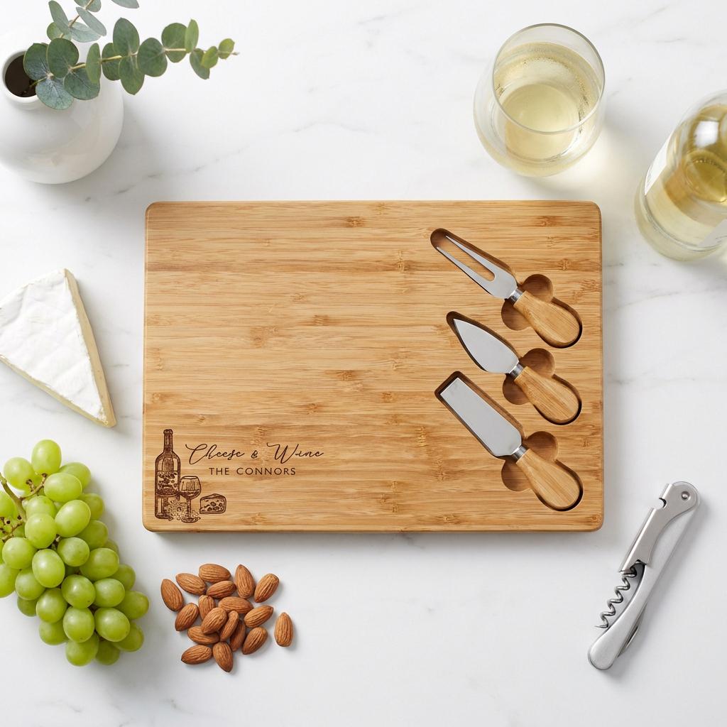 Make hosting easy (and beautiful) with a personalized bamboo cheese board set—engraved with a name, family title, or short message. This charcuterie board is perfect for date nights, wine-and-cheese evenings, and entertaining guests, and it also makes a meaningful keepsake for weddings and new homes.