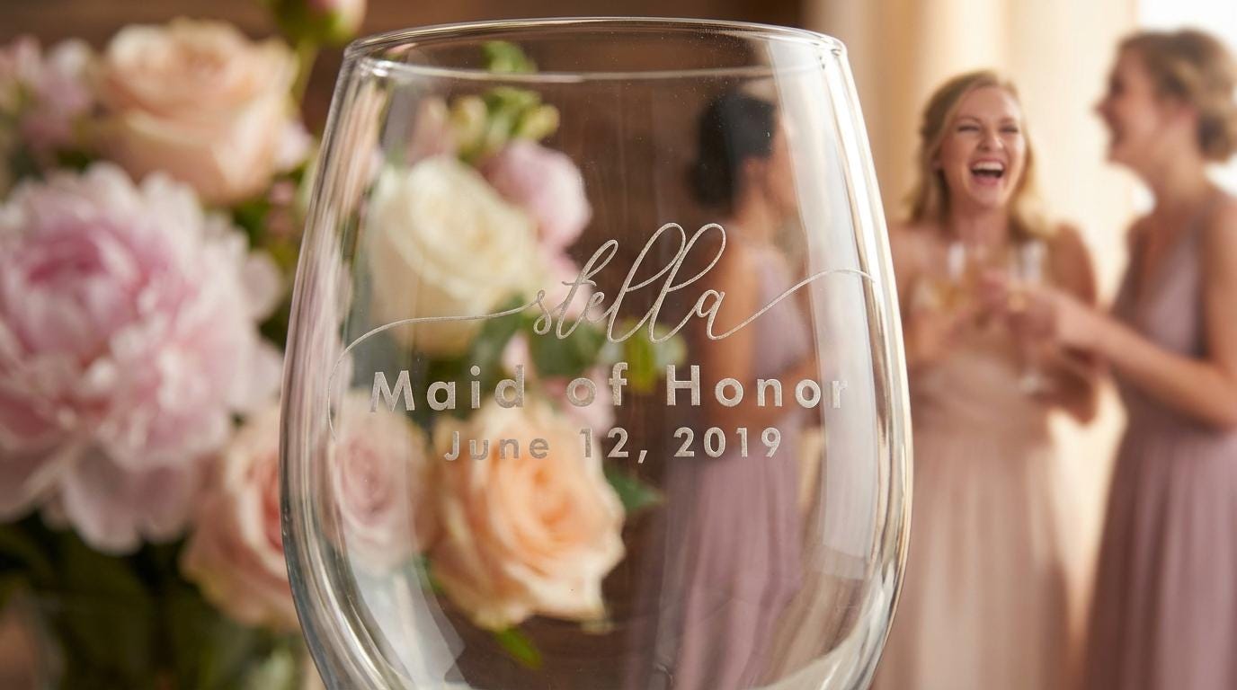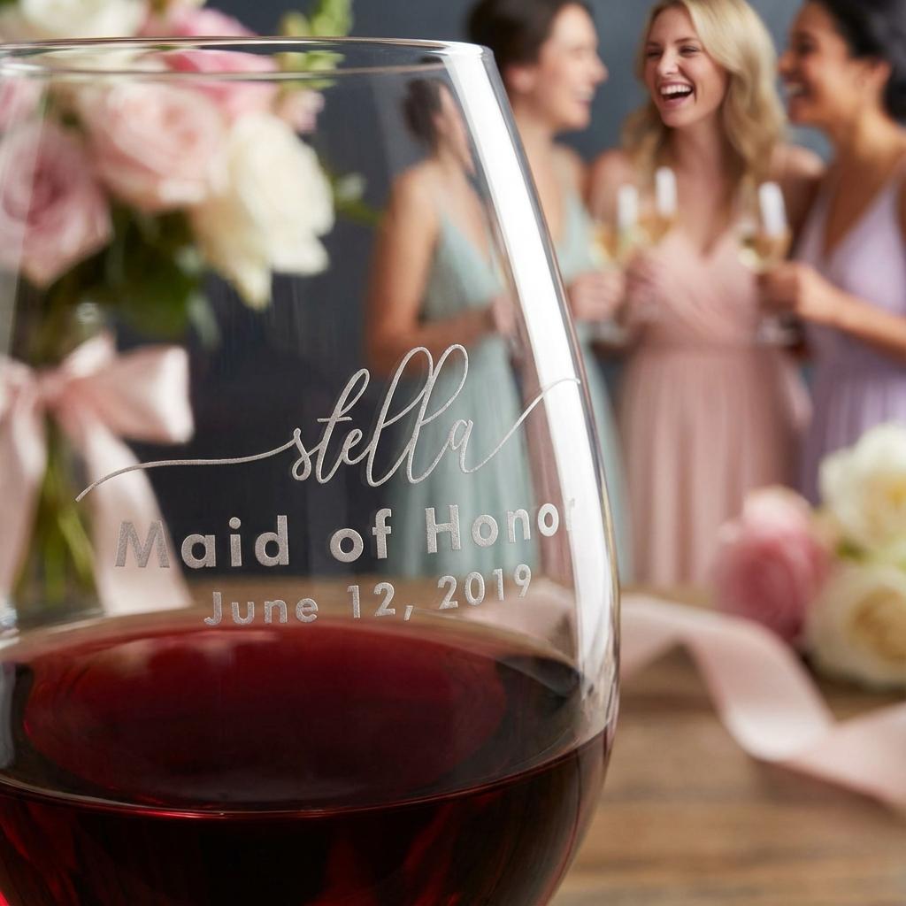 Cheers to your bride tribe with this personalized bridesmaid wine glass. Featuring a custom Maid of Honor engraving and wedding date, this elegant stemmed glass is the perfect bridesmaid proposal gift or bachelorette party favor.