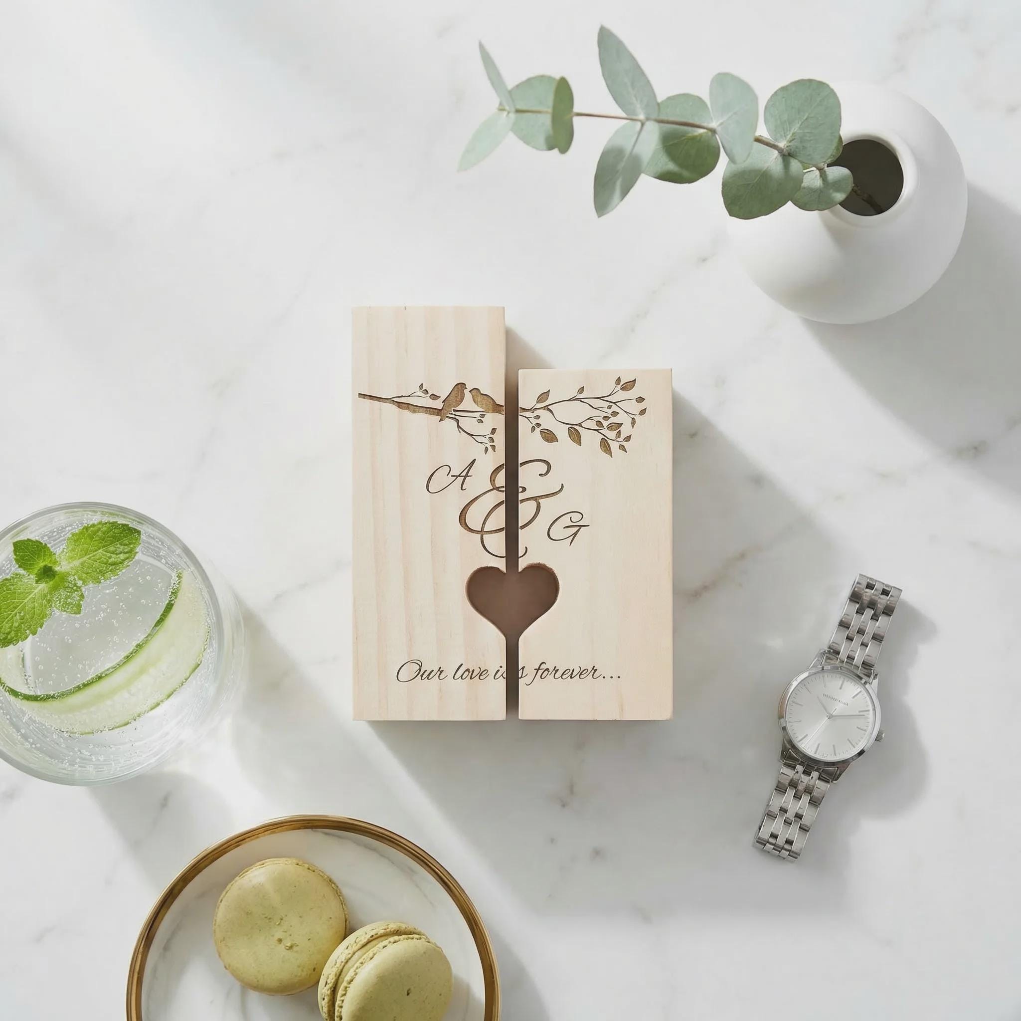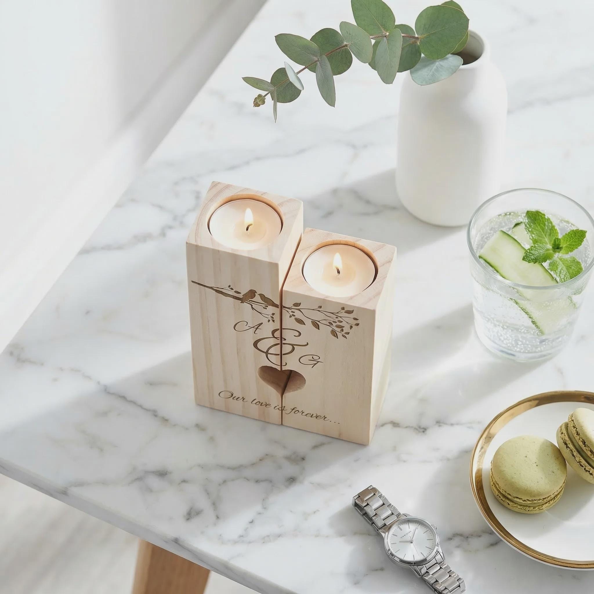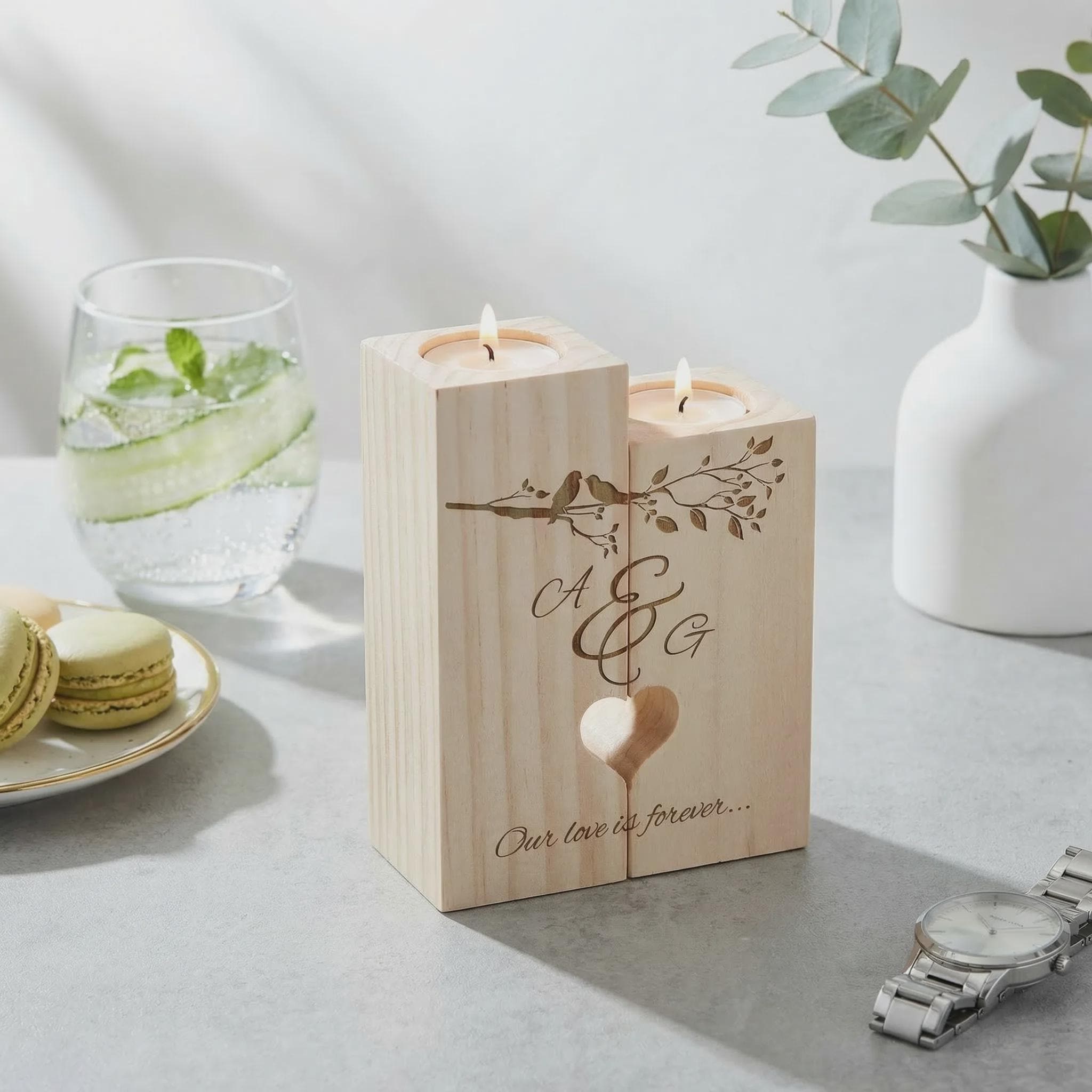 Celebrate a special bond with this personalized pine wood candle holder set. Hand-crafted by our in-house carpenter, this two-piece set features a precision-cut heart silhouette that appears when the blocks are placed side-by-side. Laser engraved with a "Love Birds" design and your custom names, it serves as a meaningful centerpiece for home decor and a permanent milestone keepsake.
