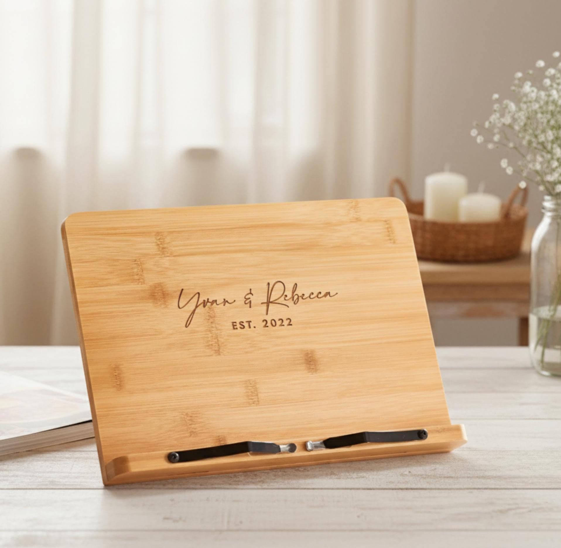 Personalized Bamboo iPad and Recipe Holders-The Perfect Gift for Couples, Custom cookbook stand, Engraved recipe and iPad stand, Chef easel