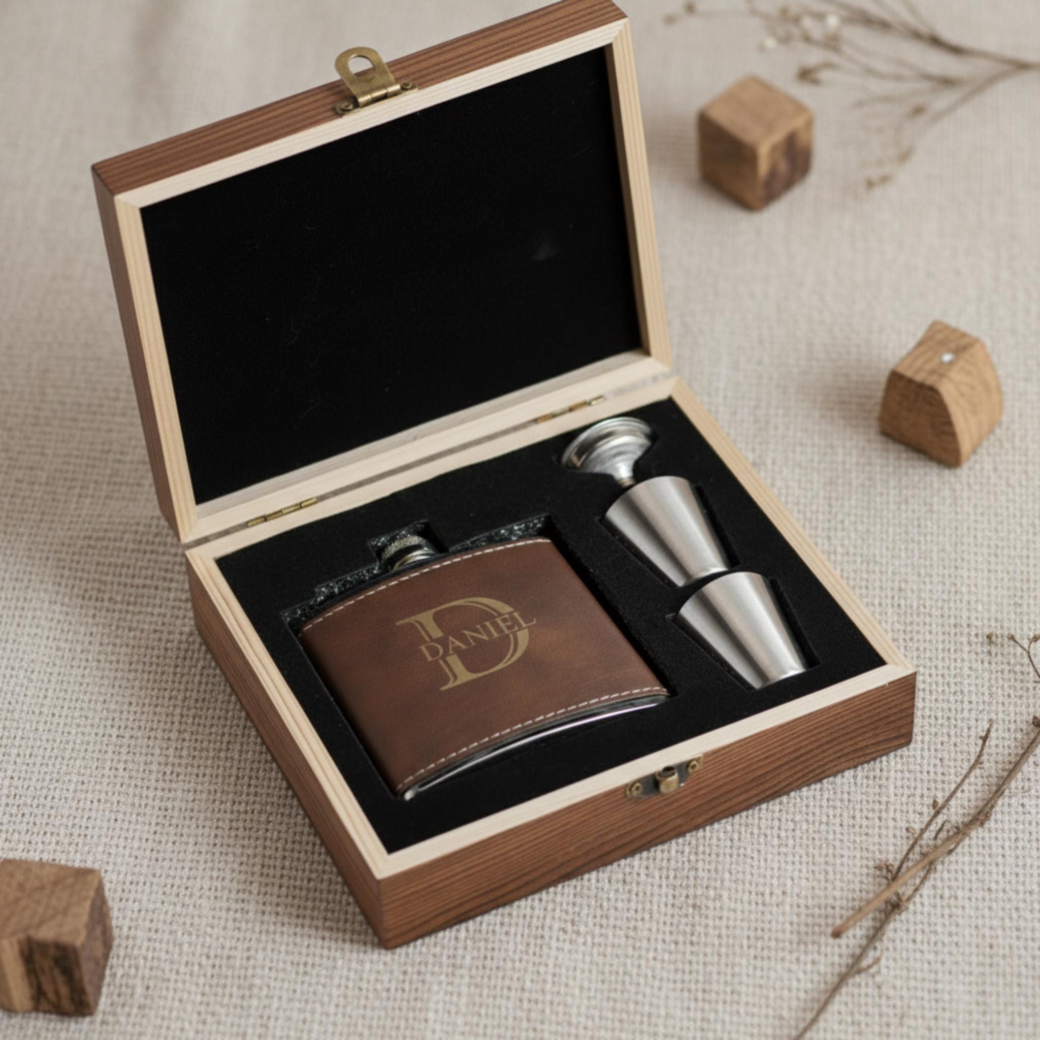 For those who want a complete set, we offer a brown leatherette flask set that comes in a beautiful wooden gift box. The set includes one flask, two shot glasses, and a filling funnel, making it a perfect gift for any occasion.