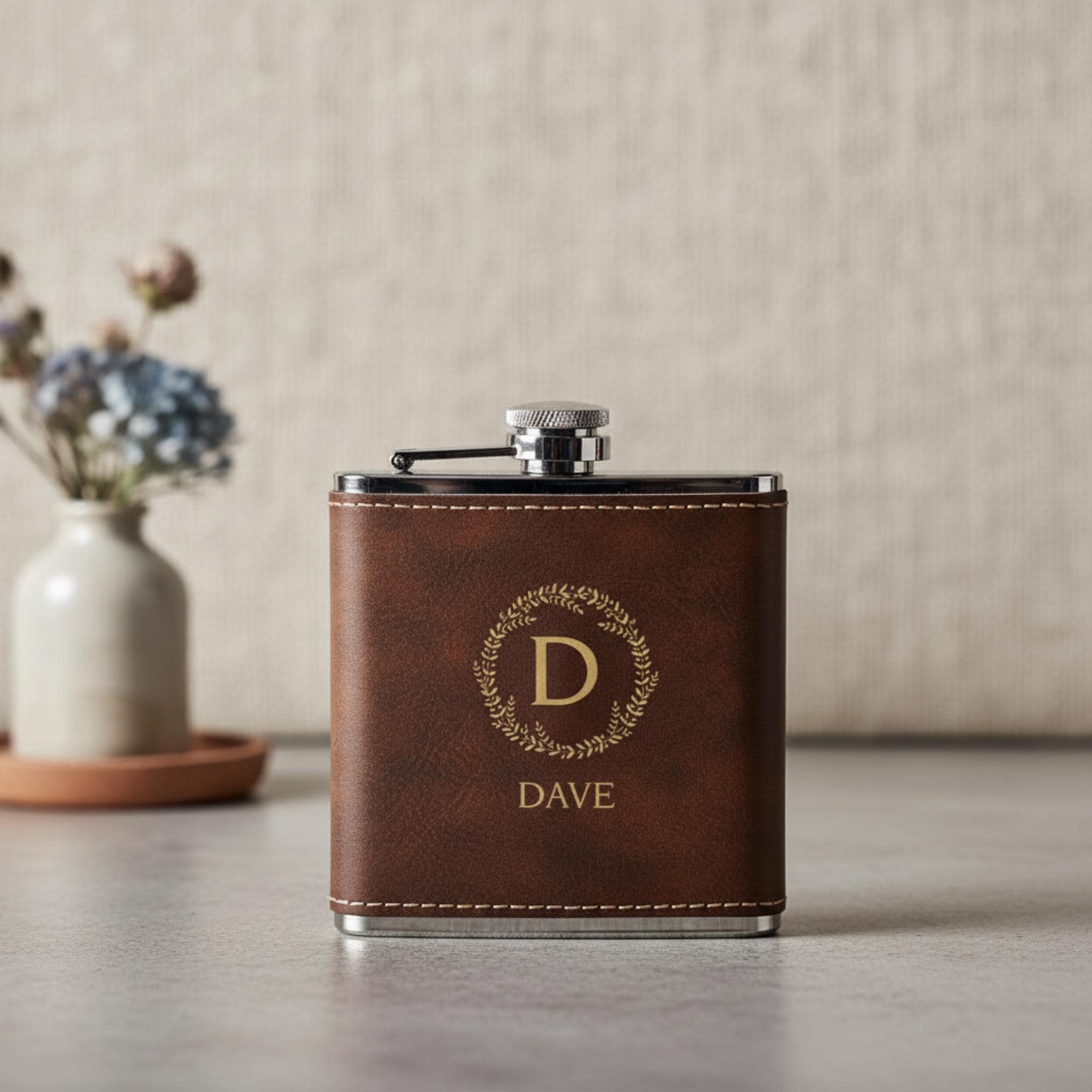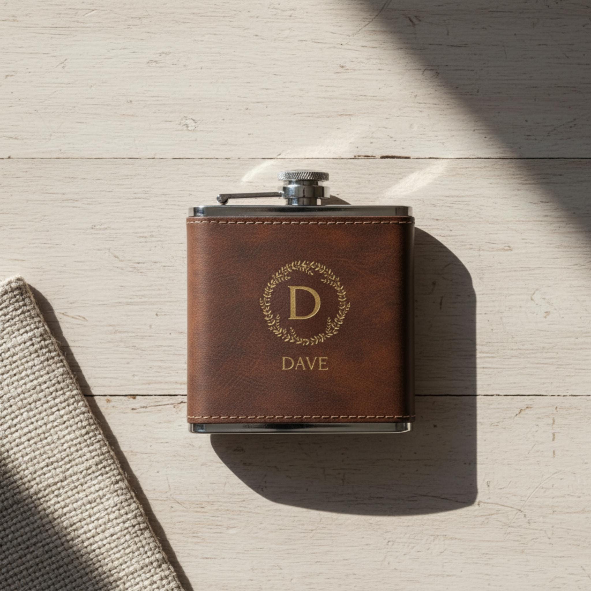 Our brown leatherette flask is beautifully designed and can be personalized with a golden engraving of your choice. Whether it's a name, a date, or a special message, our laser engraving process ensures that your flask will be one-of-a-kind and truly unique.