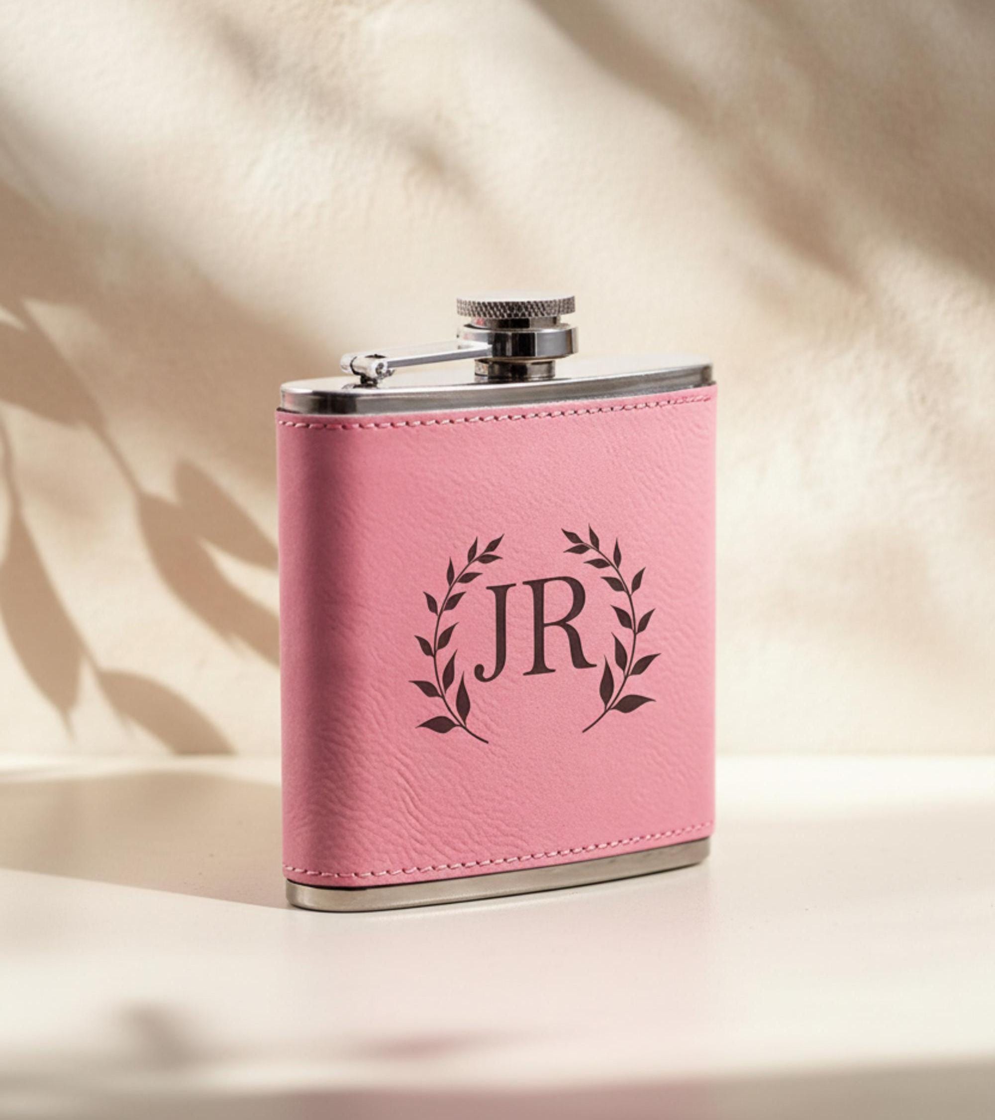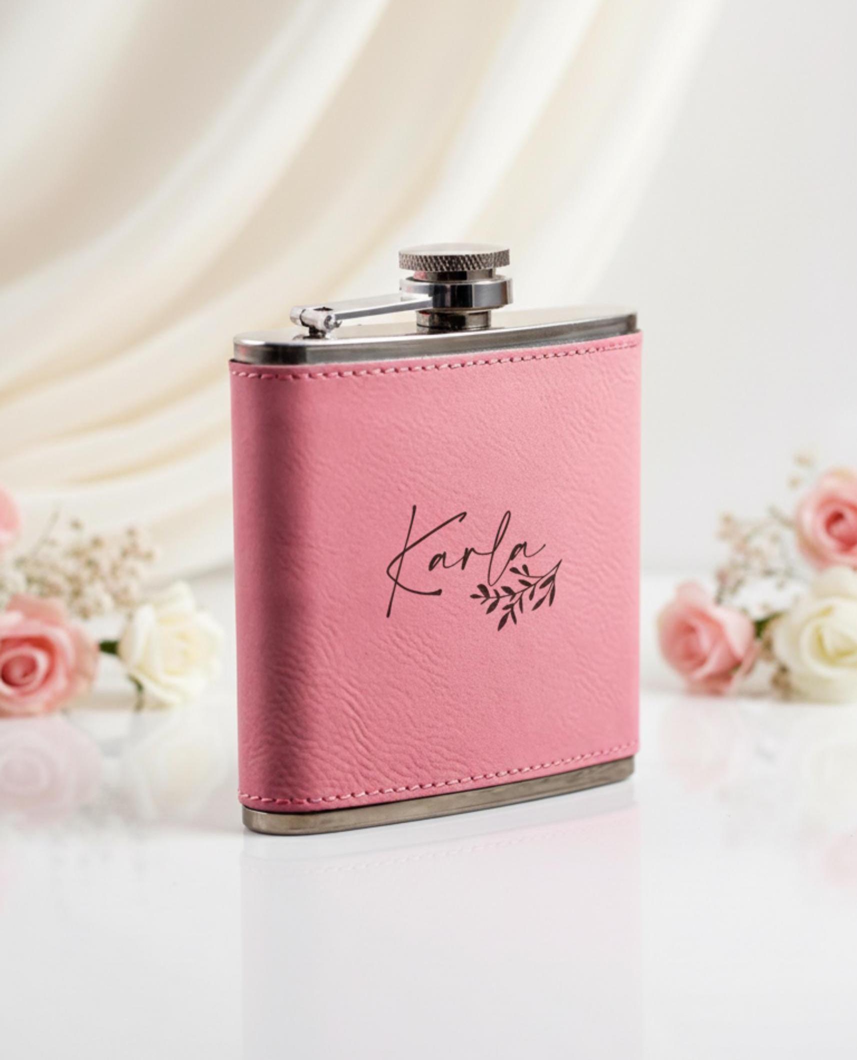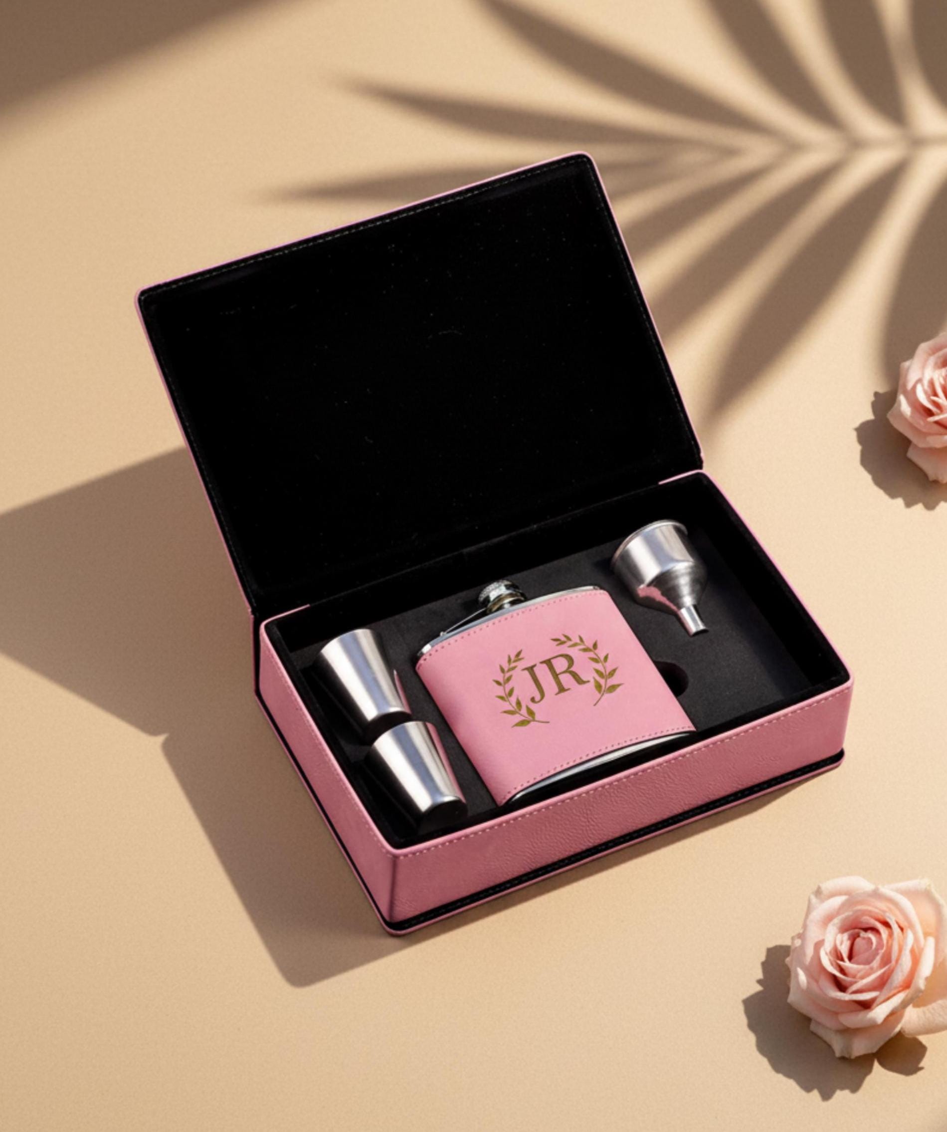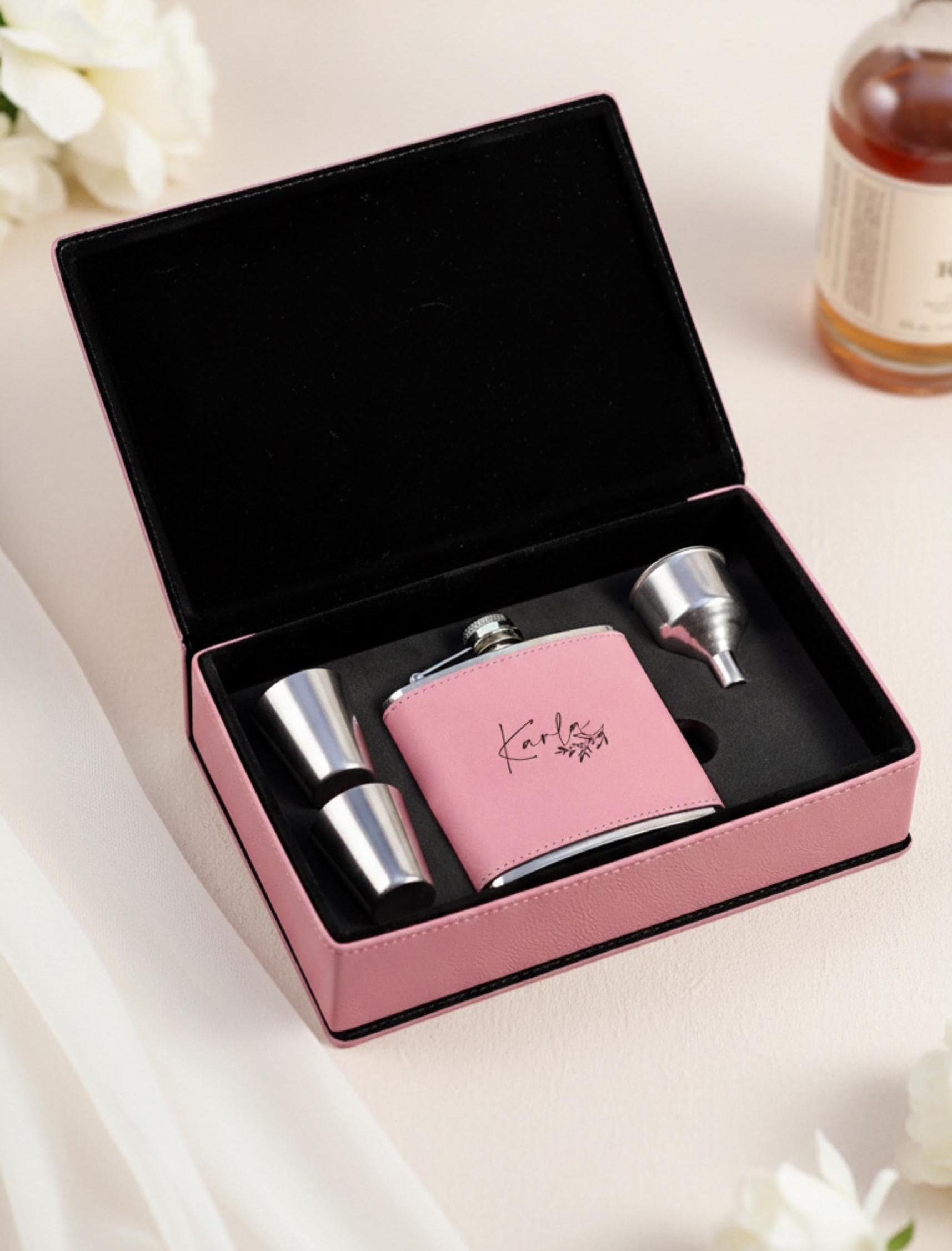 You can purchase just the flask or a complete set with a pink leatherette gift box, one flask, two shot glasses, and a filling funnel.