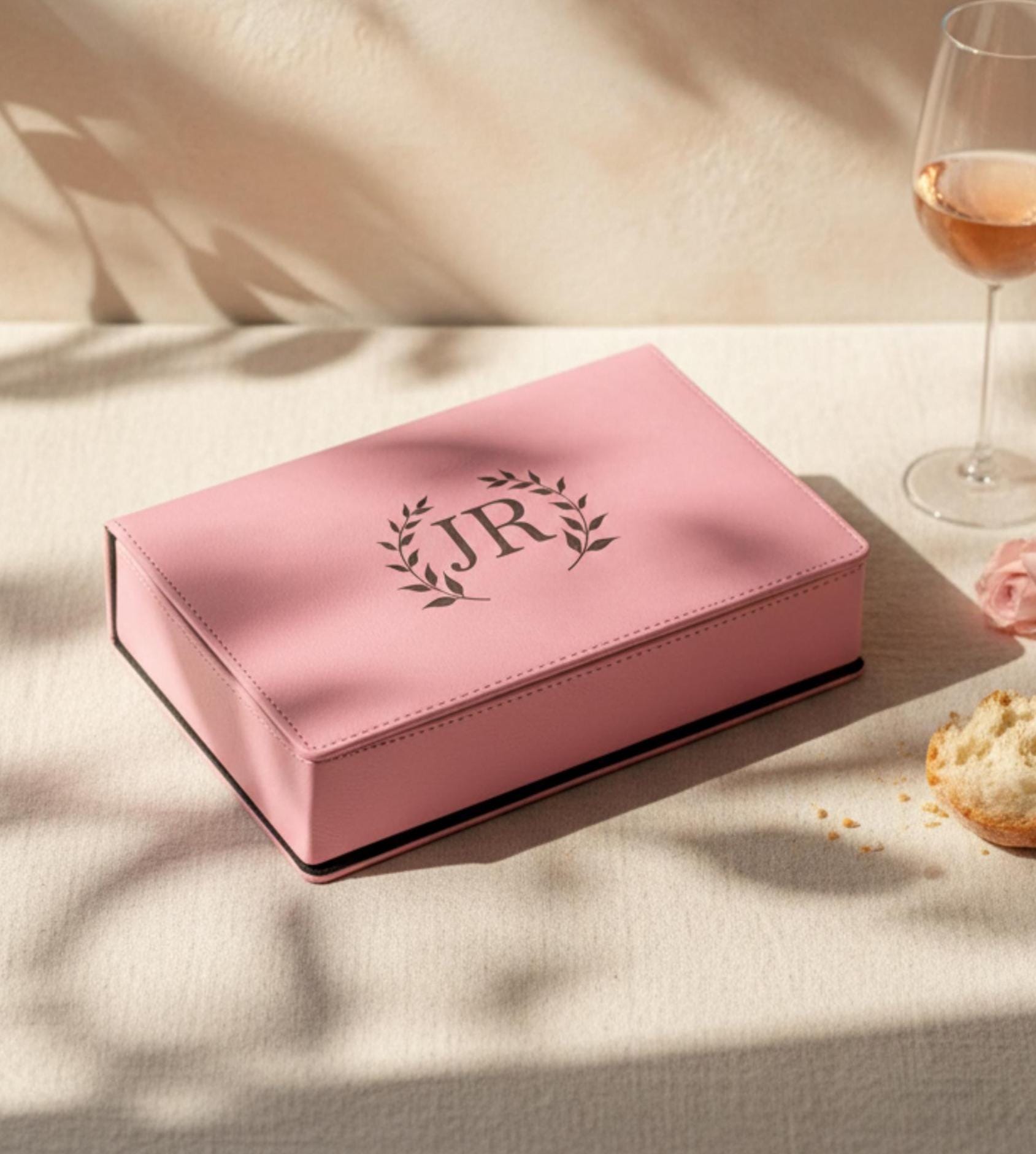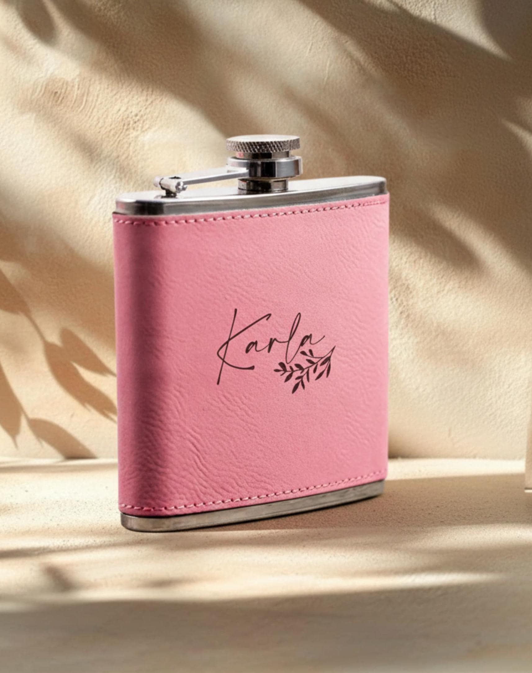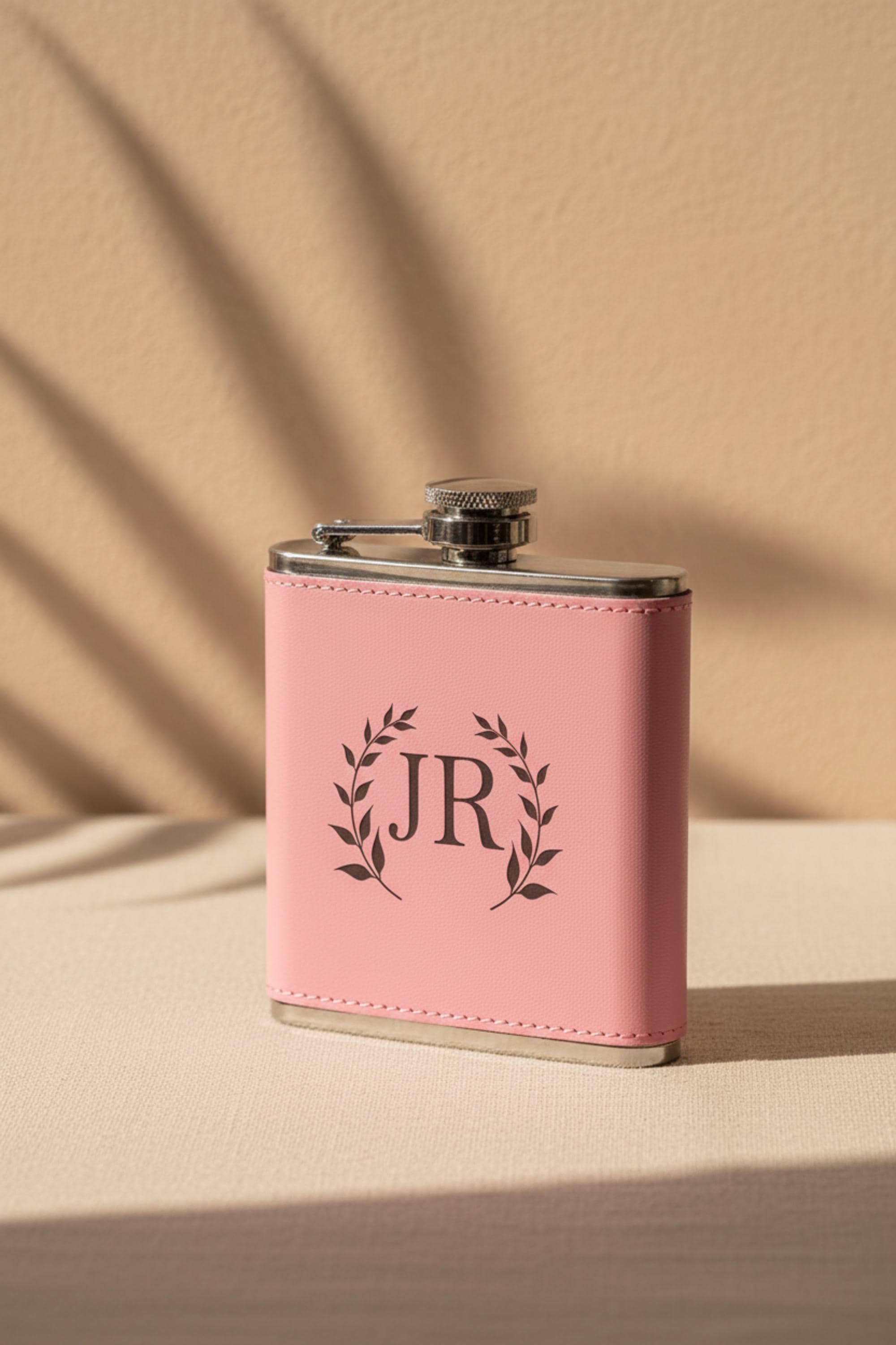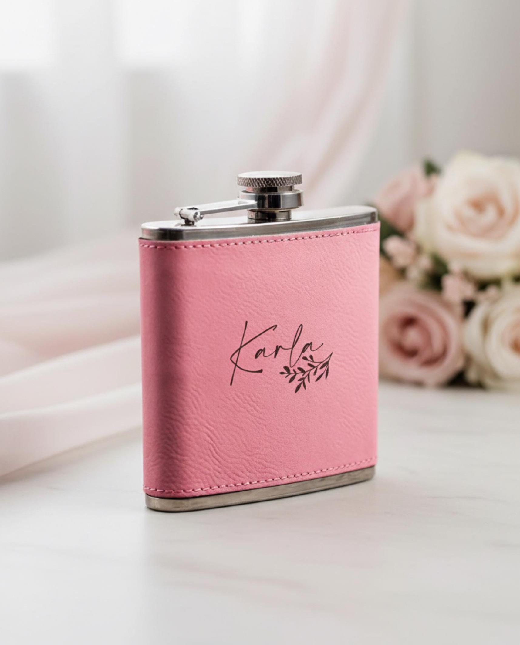You can purchase just the flask or a complete set with a pink leatherette gift box, one flask, two shot glasses, and a filling funnel.