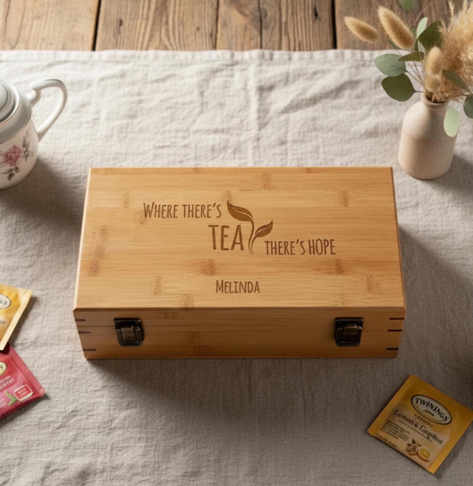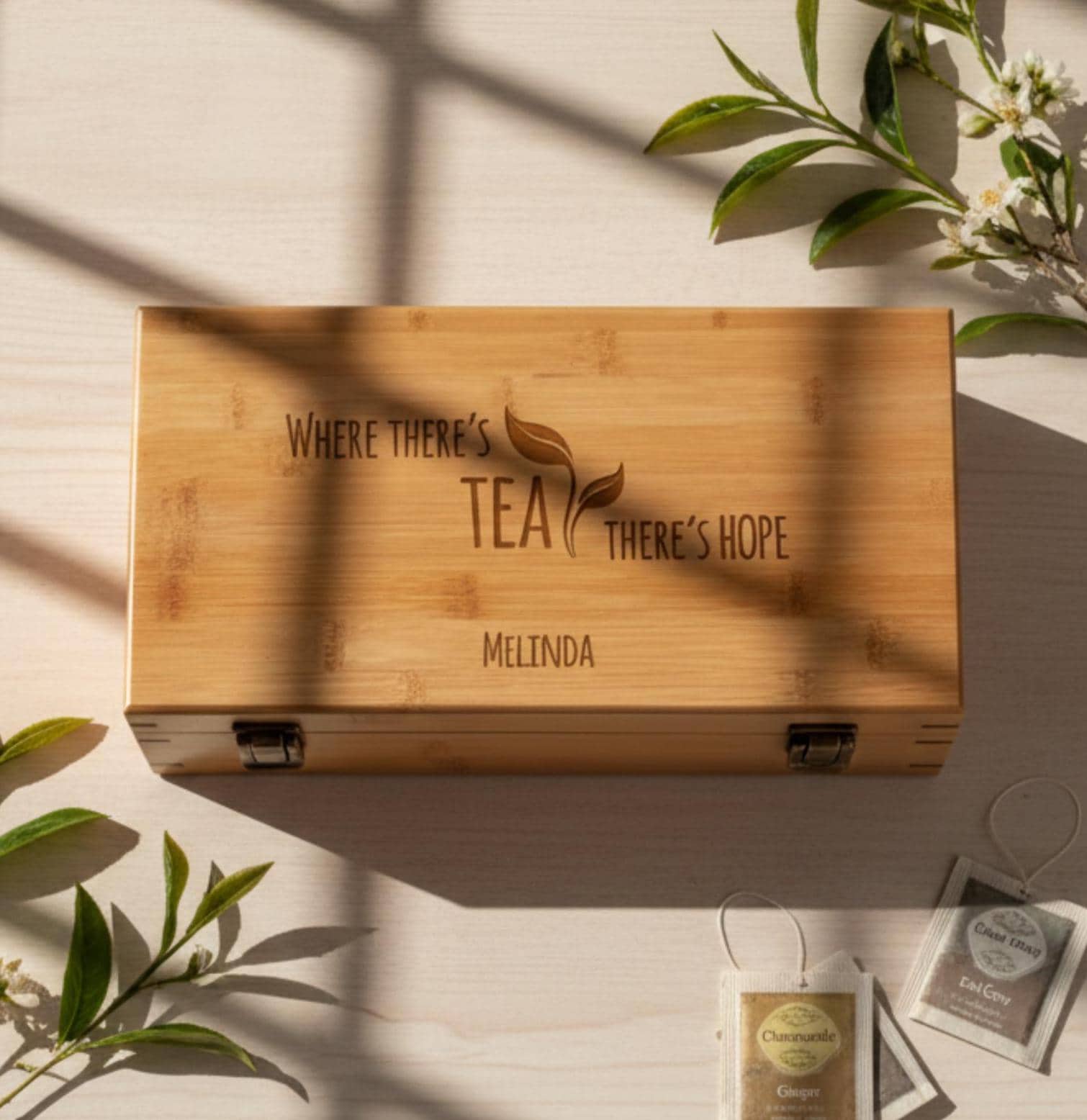 Elevate your tea ritual with our Personalized Bamboo Tea Box – the perfect custom tea organizer for tea lovers and those who appreciate unique, personalized kitchen decor. This tea box is engraved with the inspiring phrase "Where There's Tea There's Hope" alongside your custom name, making it a thoughtful, one-of-a-kind gift for moms, grandmas, or anyone who adores tea.