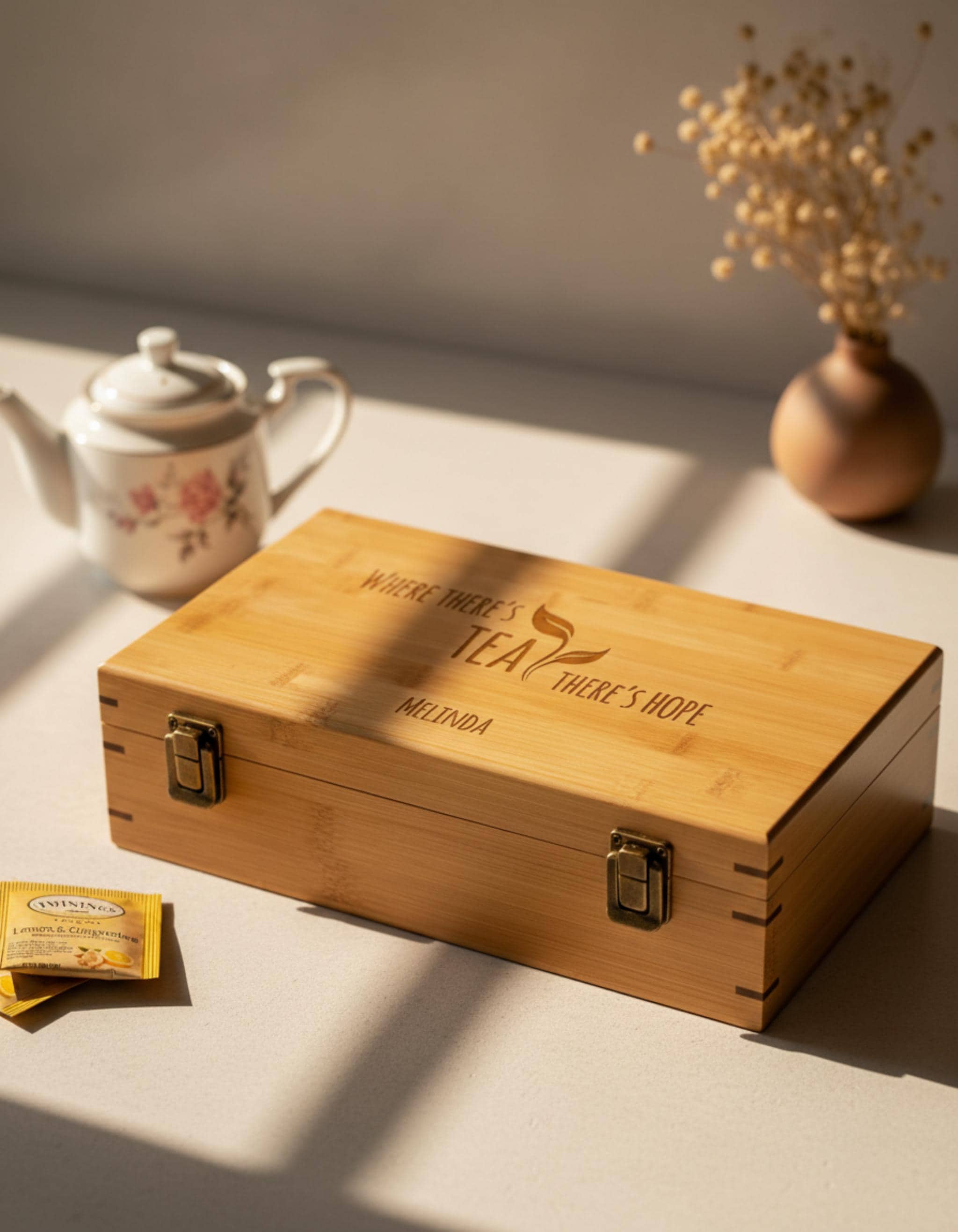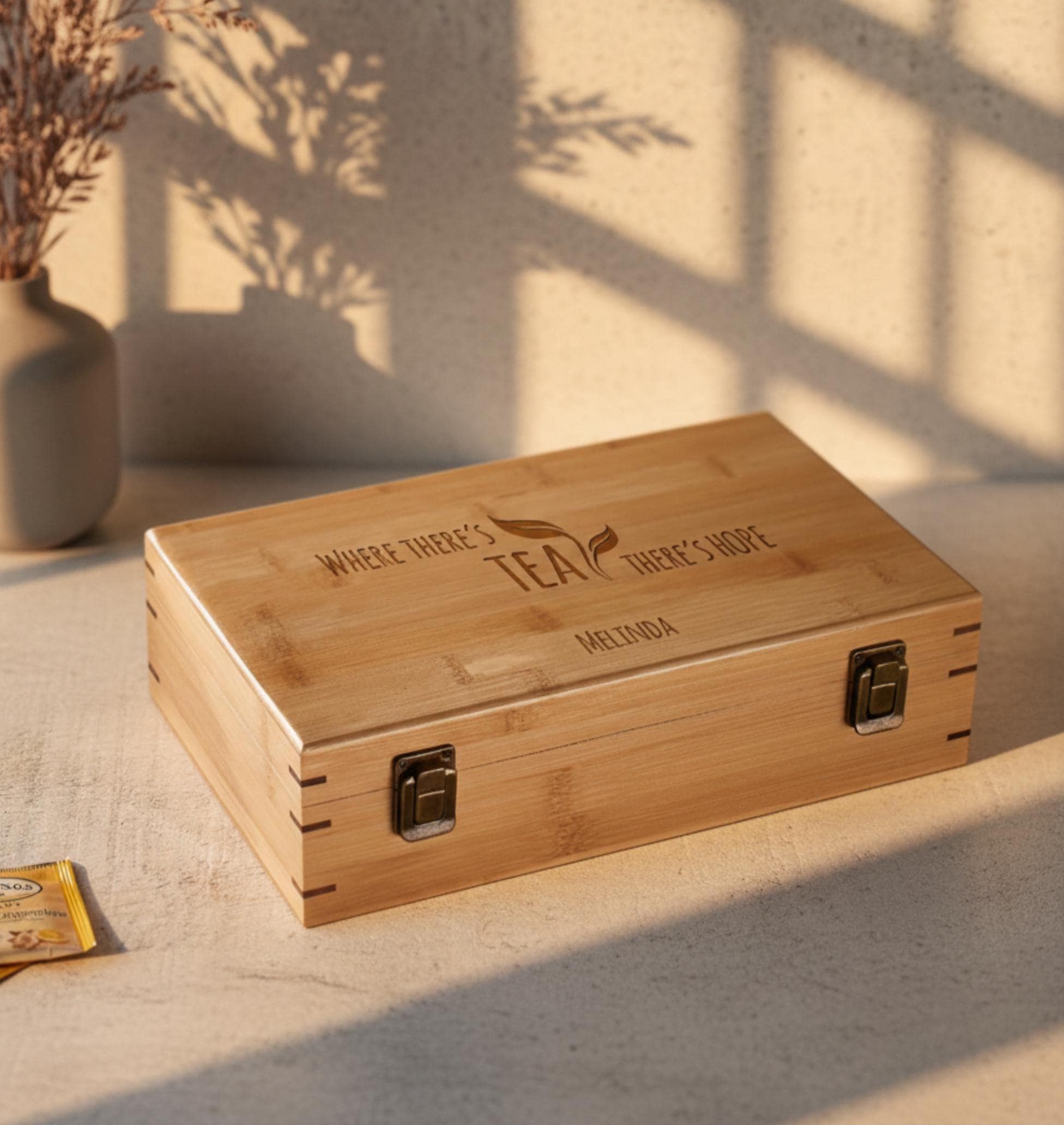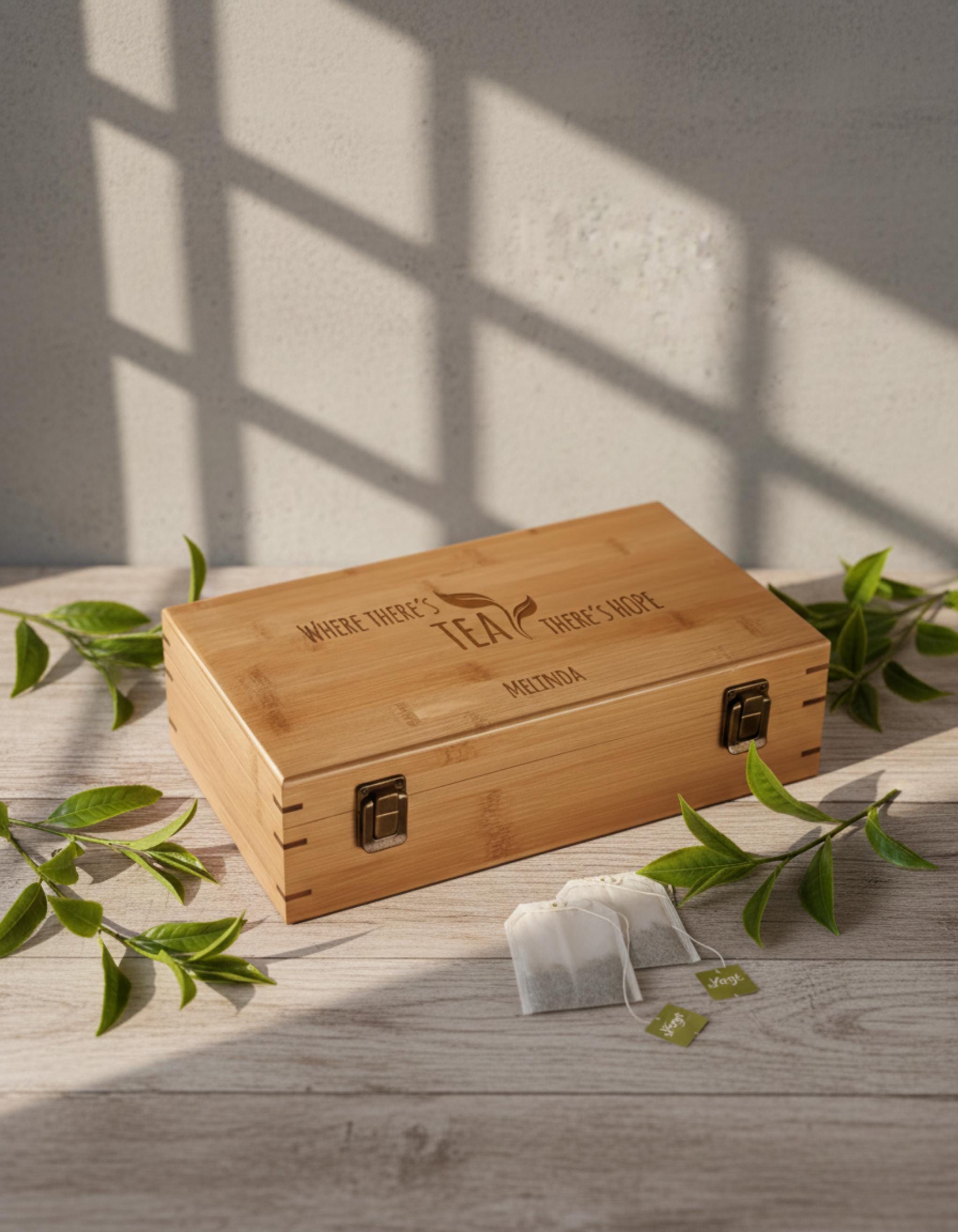 • Custom Engraving: Personalize with your name or special message for a truly unique touch on this bamboo tea box.
