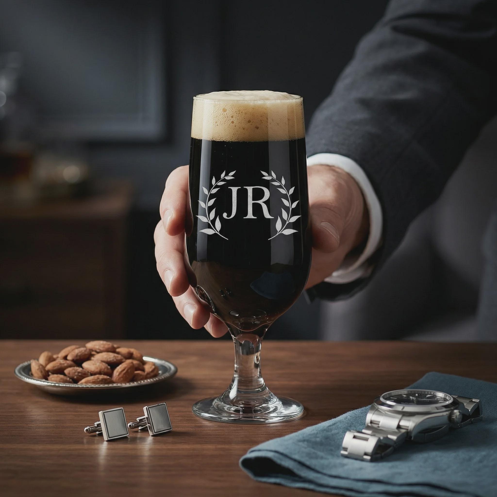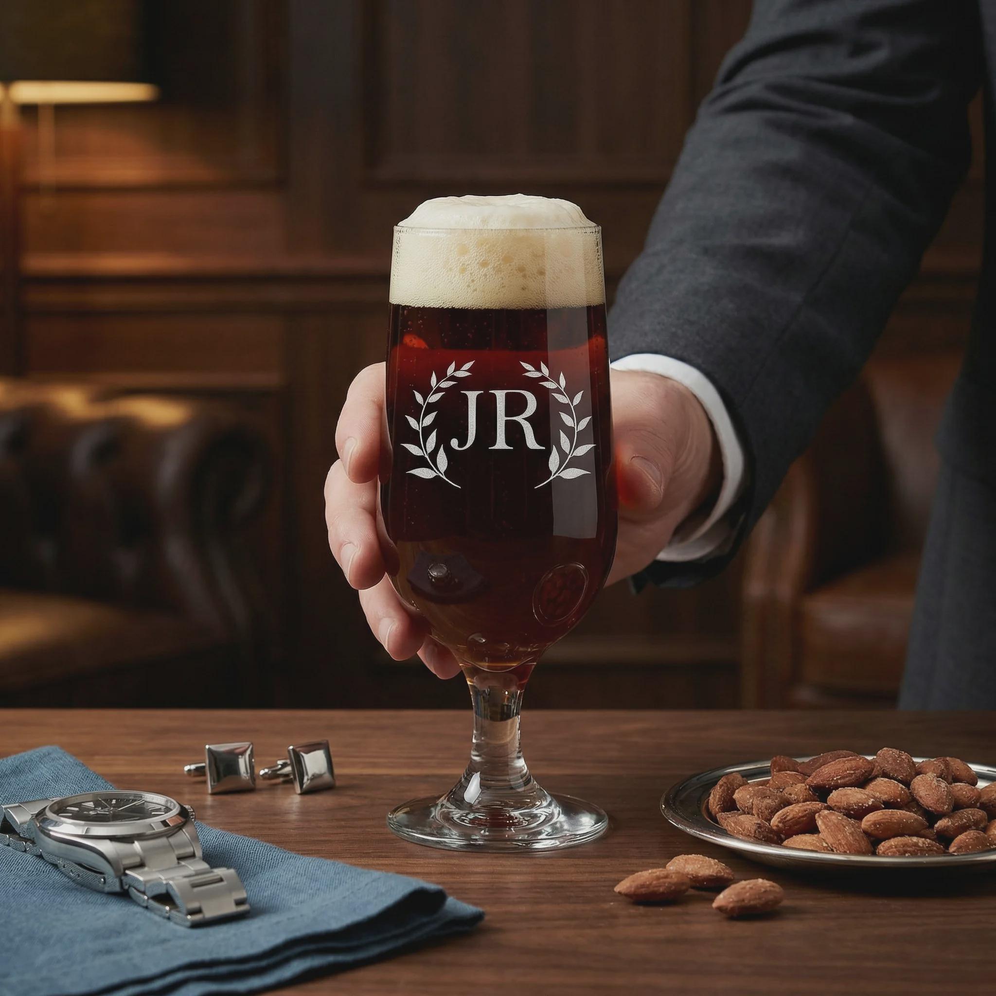 Raise a toast with our Personalized Monogram Pilsner Beer Glass. High-quality lead-free glass with custom laser etching. Perfect groomsmen and wedding gifts.