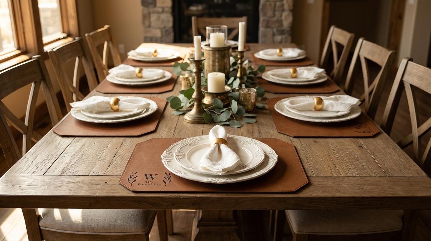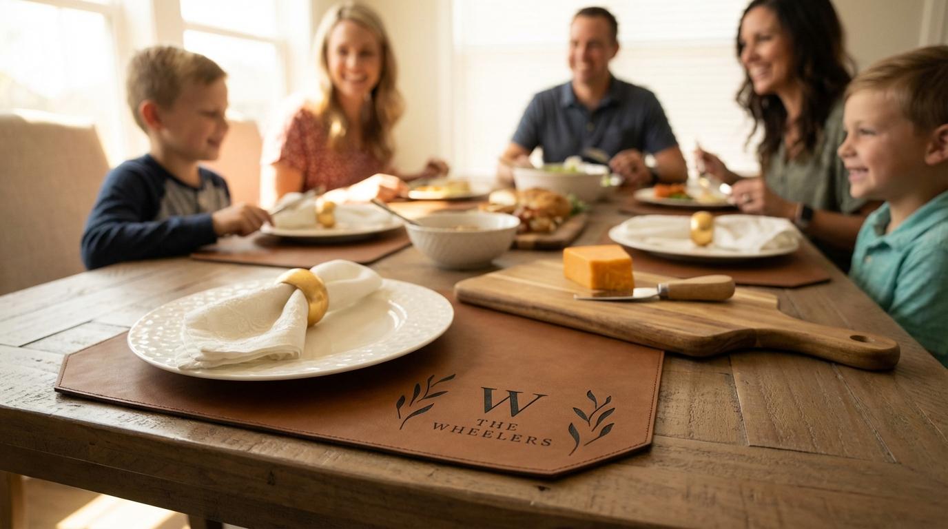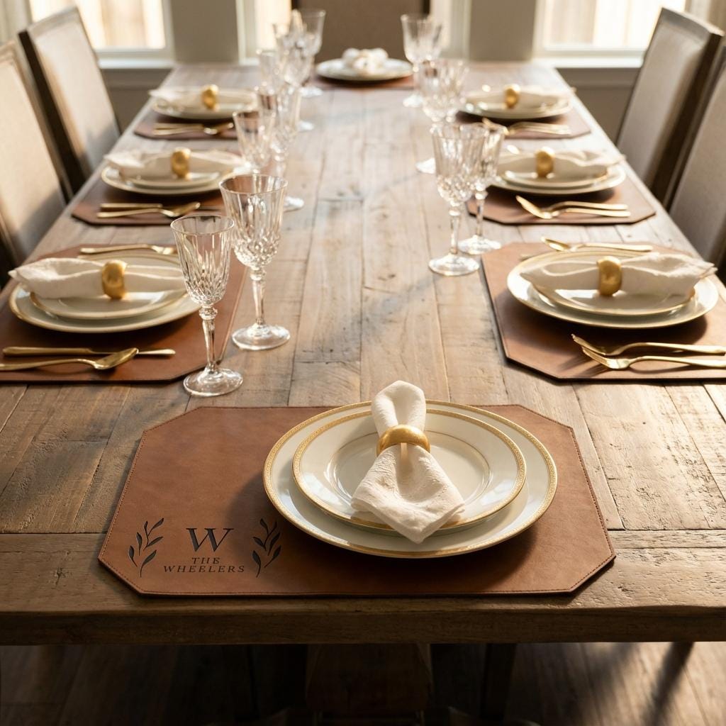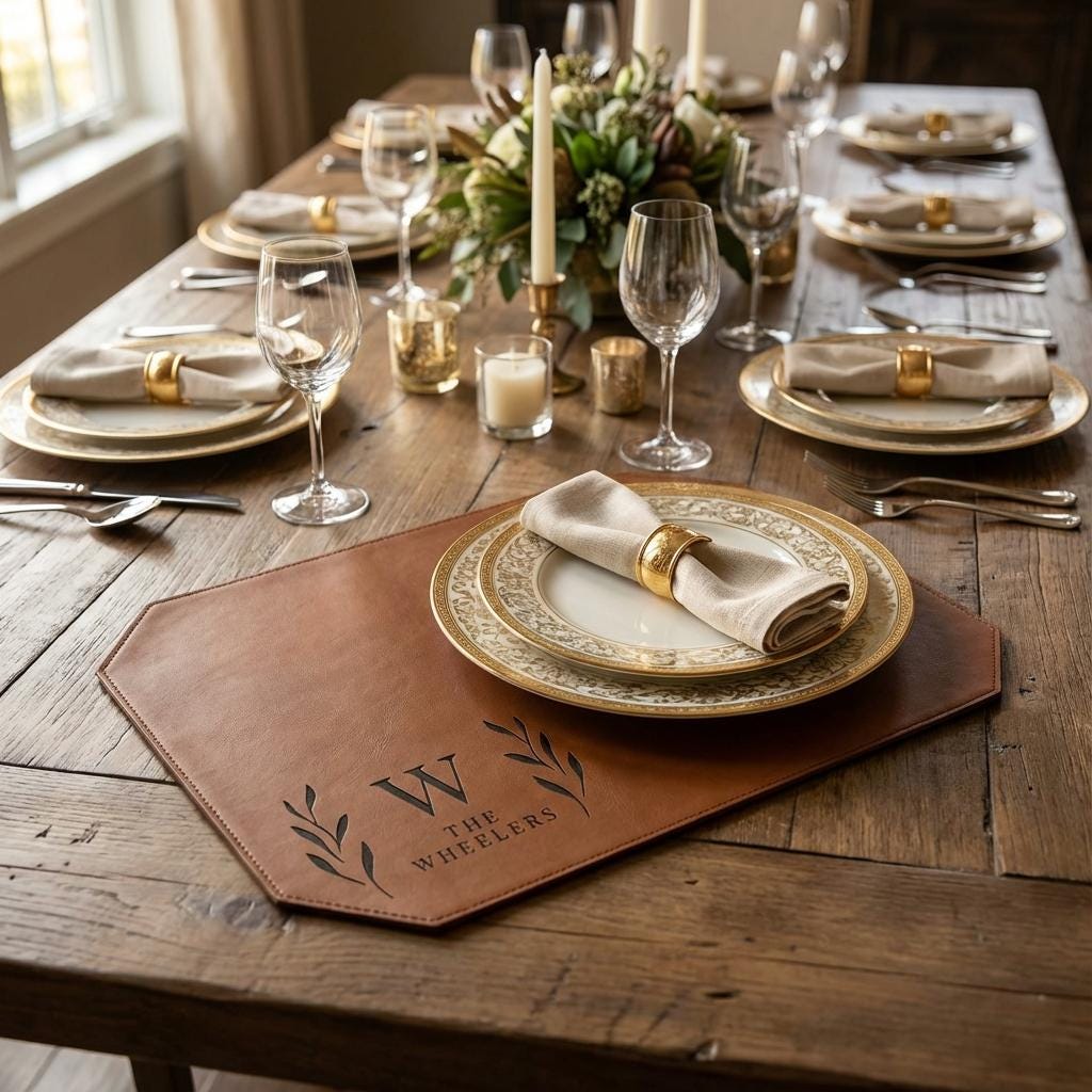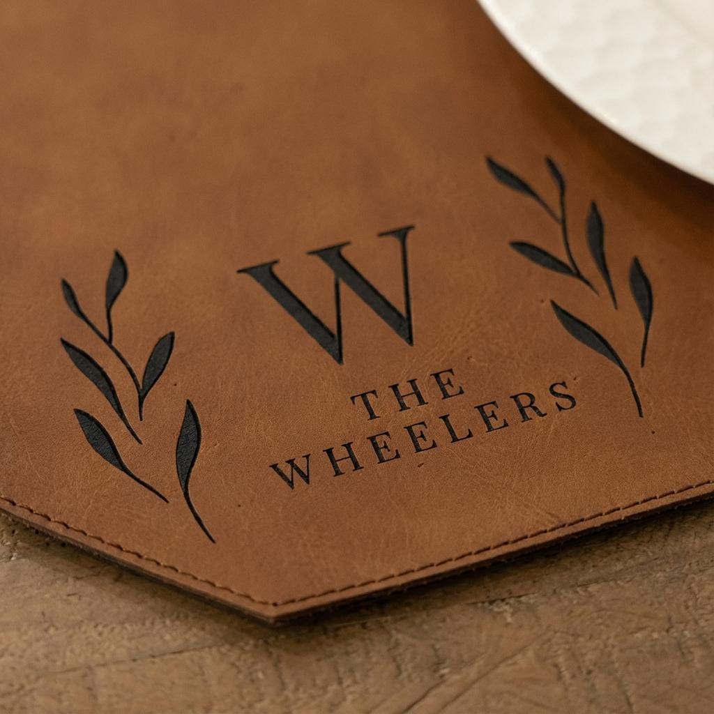 Our 12" x 17" laser engraved Leatherette Placemat is a synthetic material that offers the look and feels of genuine leather at a fraction of the price. This placemat is designed to be elegant and durable, making it ideal for daily use on your dining table.