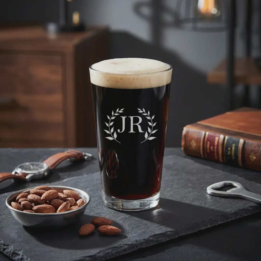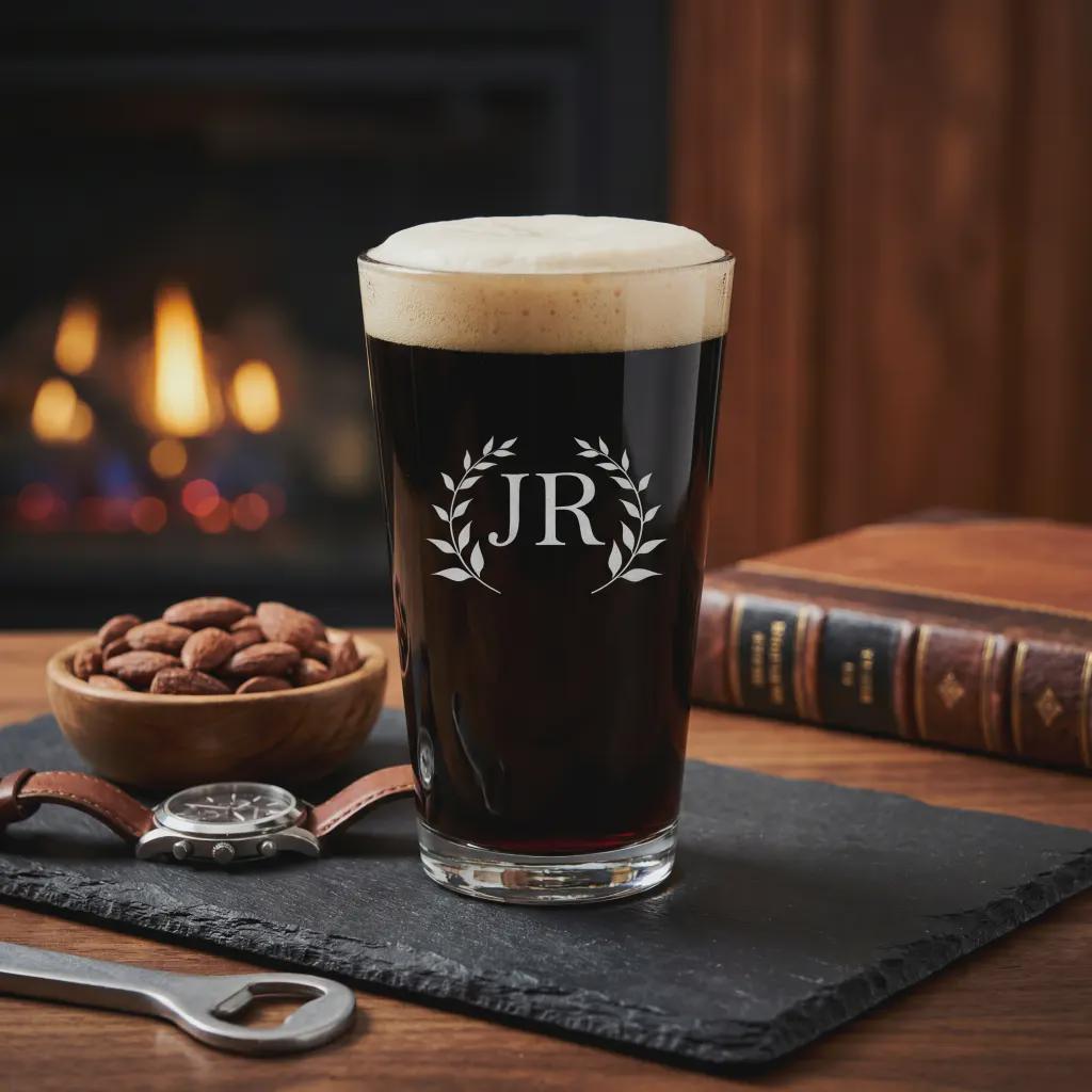 Celebrate his favorite brew with a touch of classic style using our Personalized Monogram Beer Glass. At JM la bonne impression, we transform premium barware into sophisticated keepsakes. This heavy-duty, classic shaker pint glass is professionally laser-engraved with an elegant wreath monogram and initials of your choice. Designed to feel comfortable in hand and look stunning on any home bar, it’s the ultimate way to elevate his next pour—whether it's a craft IPA, a smooth lager, or a rich amber ale.