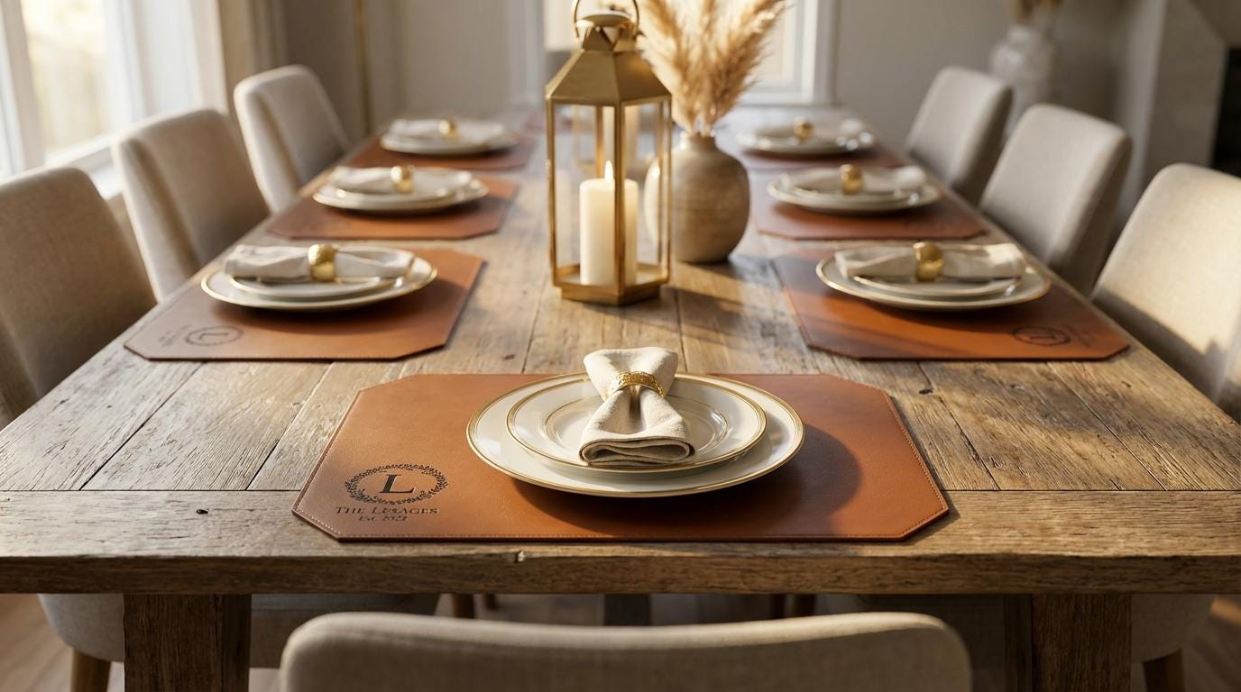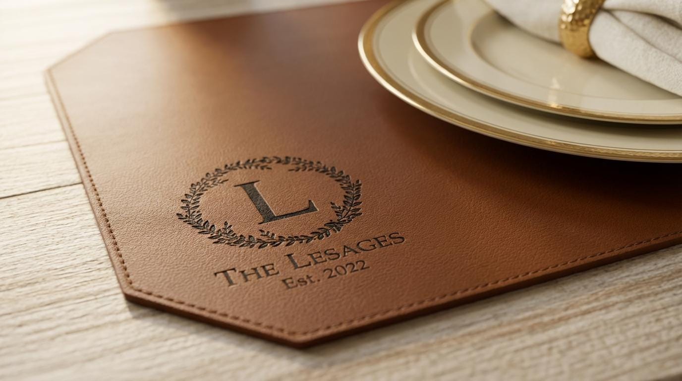 Our 12" x 17" laser engraved Leatherette Placemat is a synthetic material that offers the look and feels of genuine leather at a fraction of the price. This placemat is designed to be elegant and durable, making it ideal for daily use on your dining table.