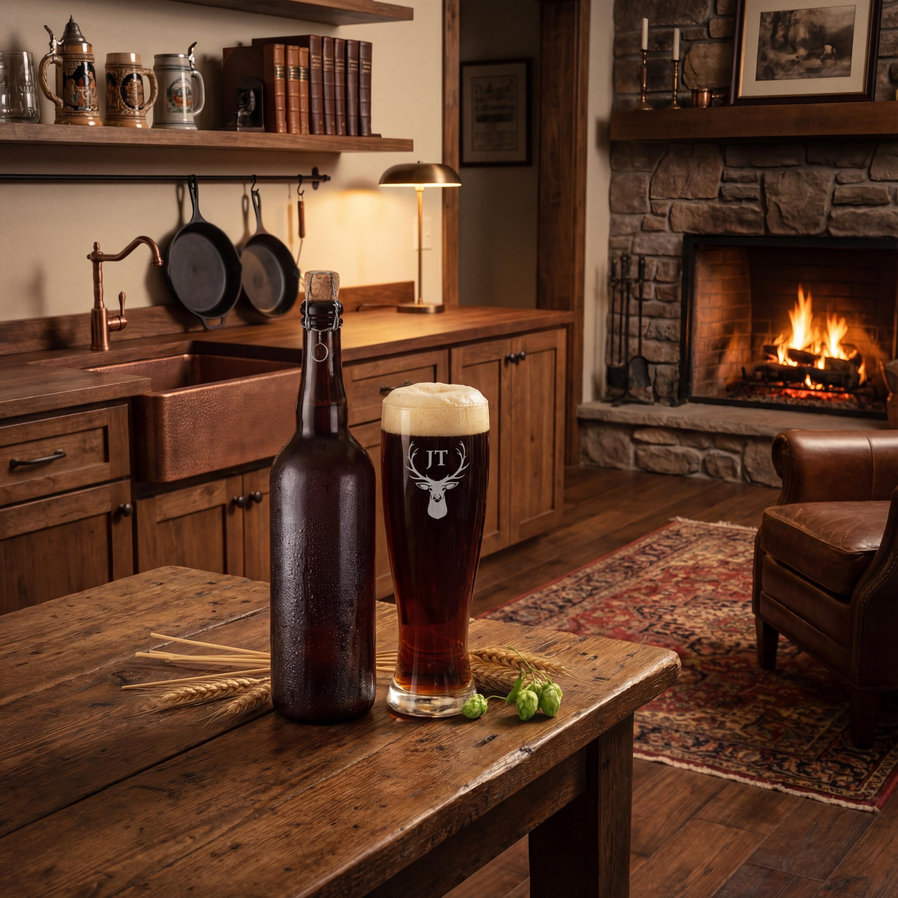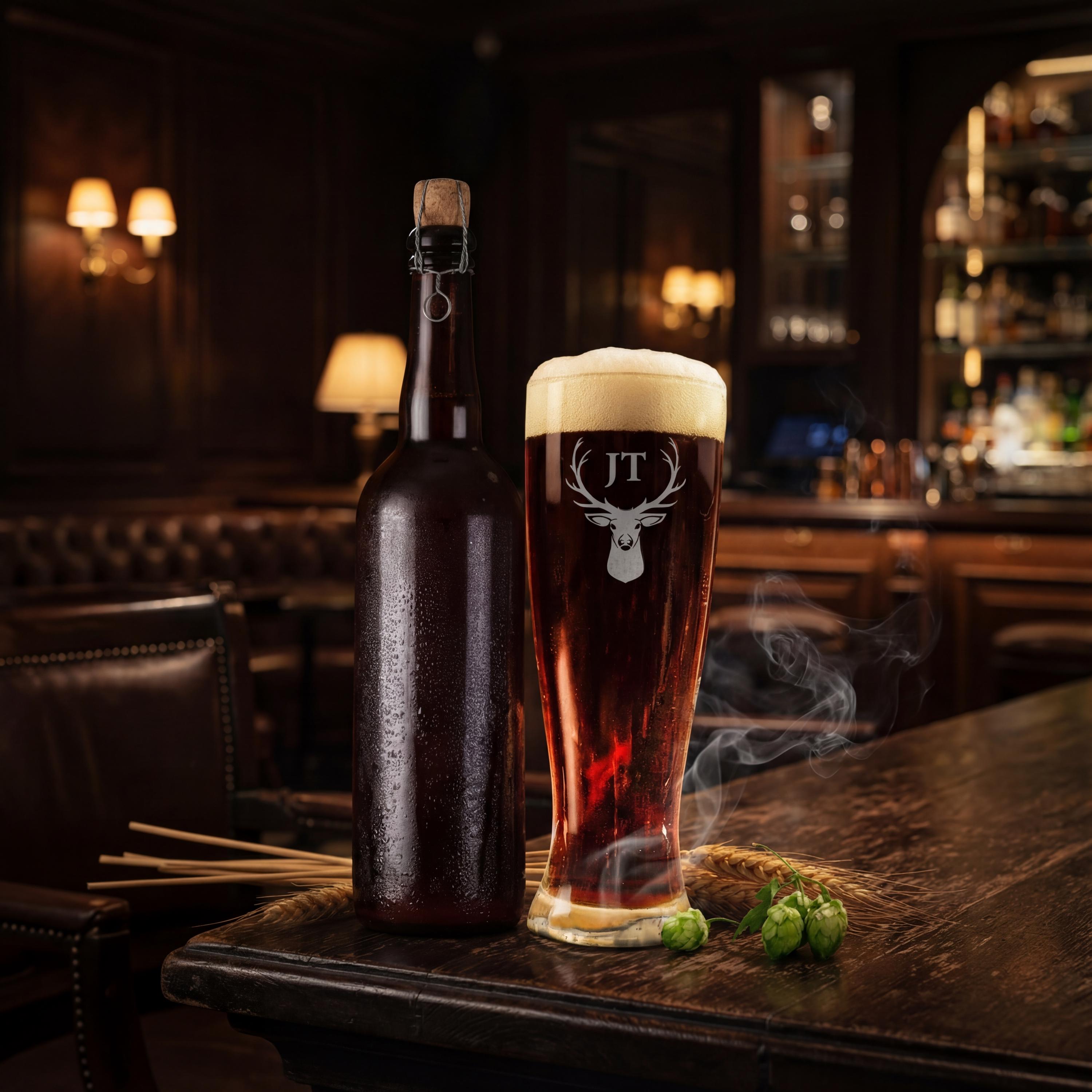 Toast to the big catch with this personalized elk beer glass. Featuring a rustic deer antler monogram and custom initials, this tall pilsner glass is the ultimate hunting gift for men, groomsmen, or Father's Day present.
