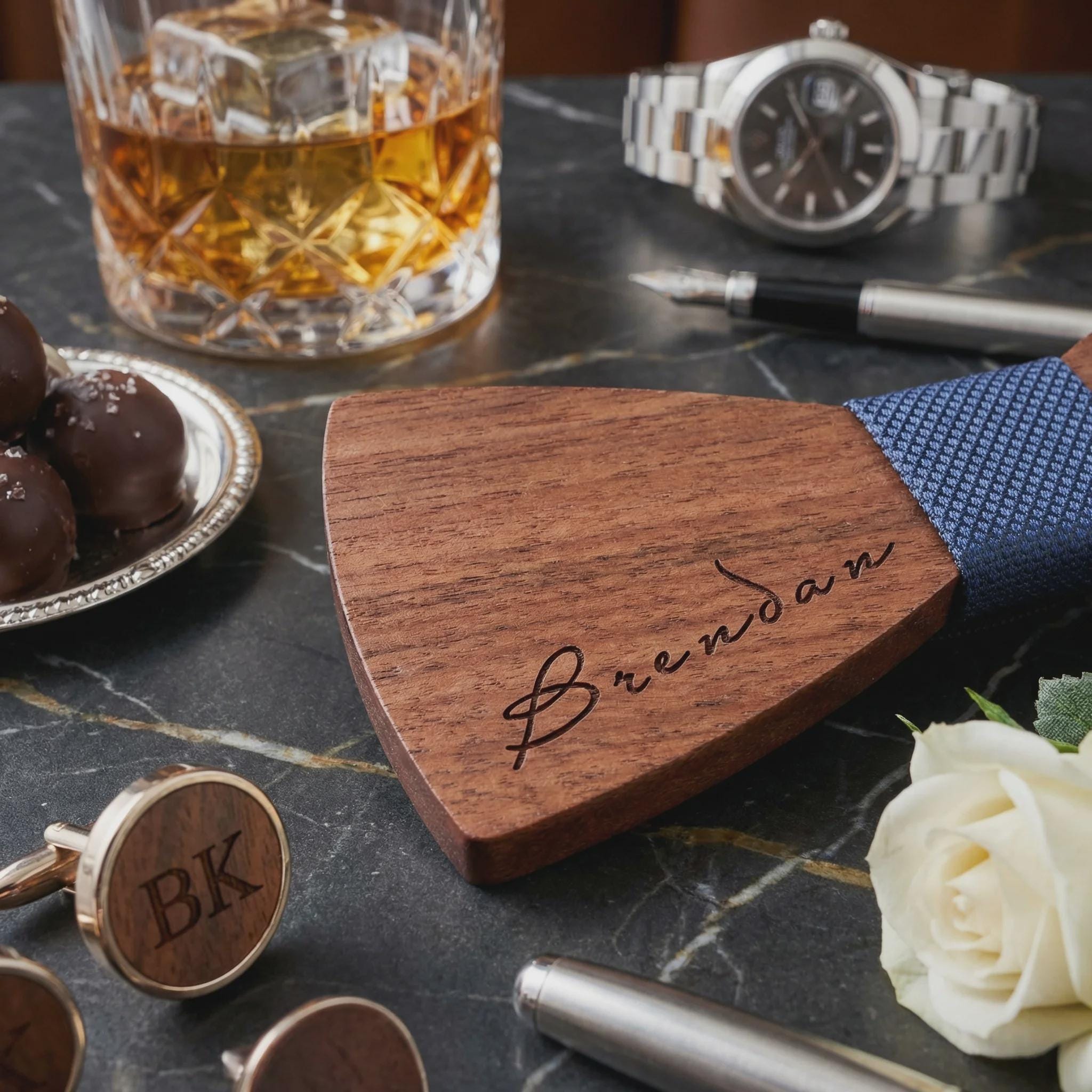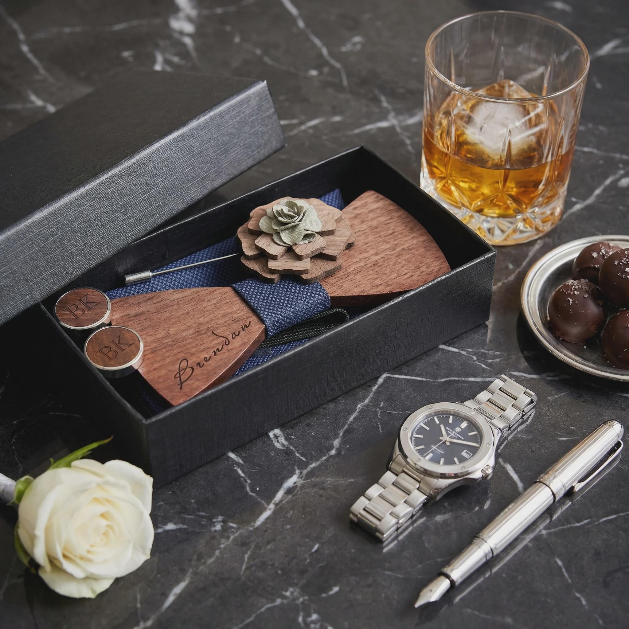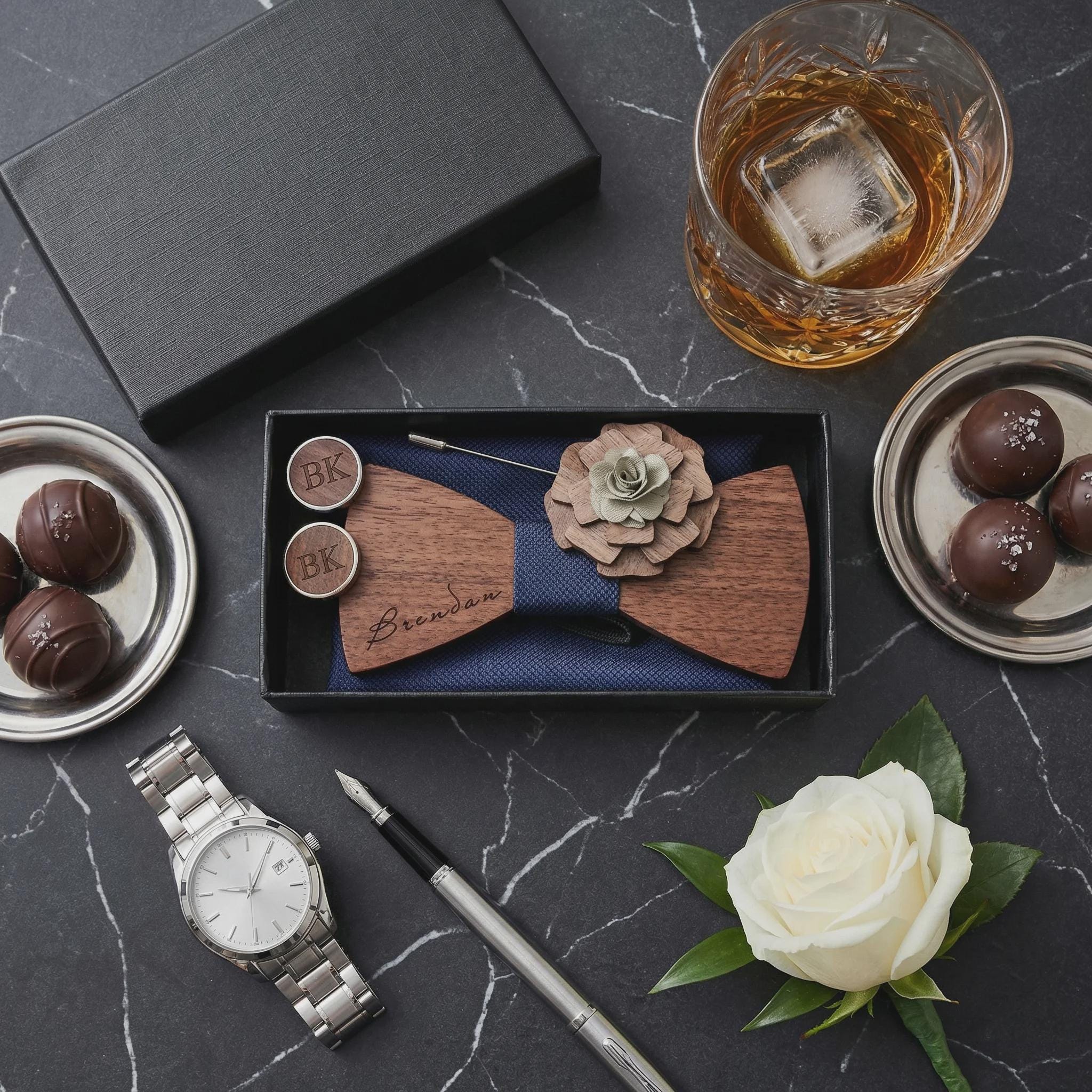 In addition to being the perfect accessory for any stylish individual, our personalized cufflinks and bowtie set also make an ideal gift for your groomsmen. Show your appreciation and elevate their style on your big day with this sophisticated set.