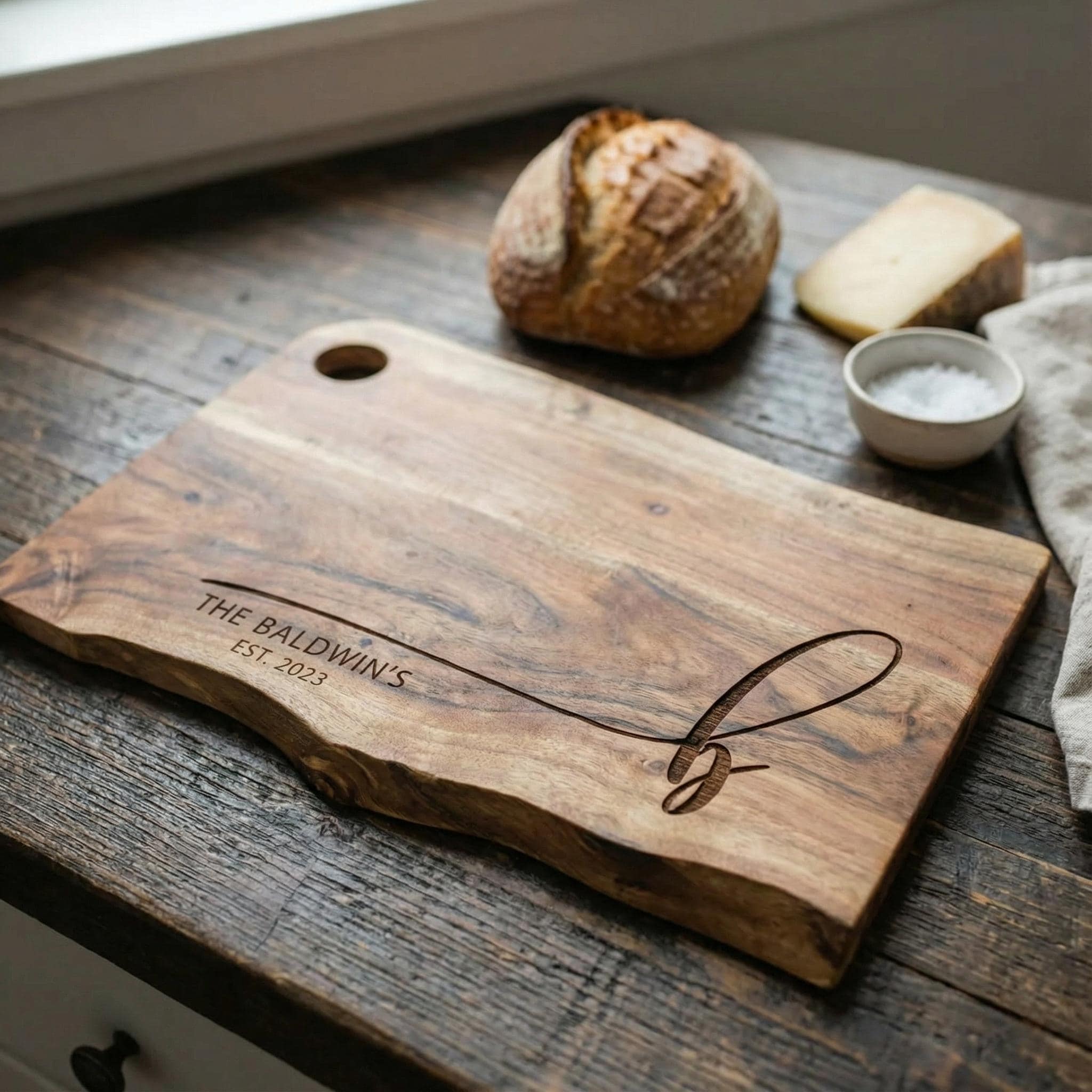 Make this cutting board truly special by adding a personalized touch. The initial and family name of your choice, along with their special date, can be laser-engraved onto the cutting board for a lasting and meaningful gift. Simply enter your desired text in the personalization section at checkout.