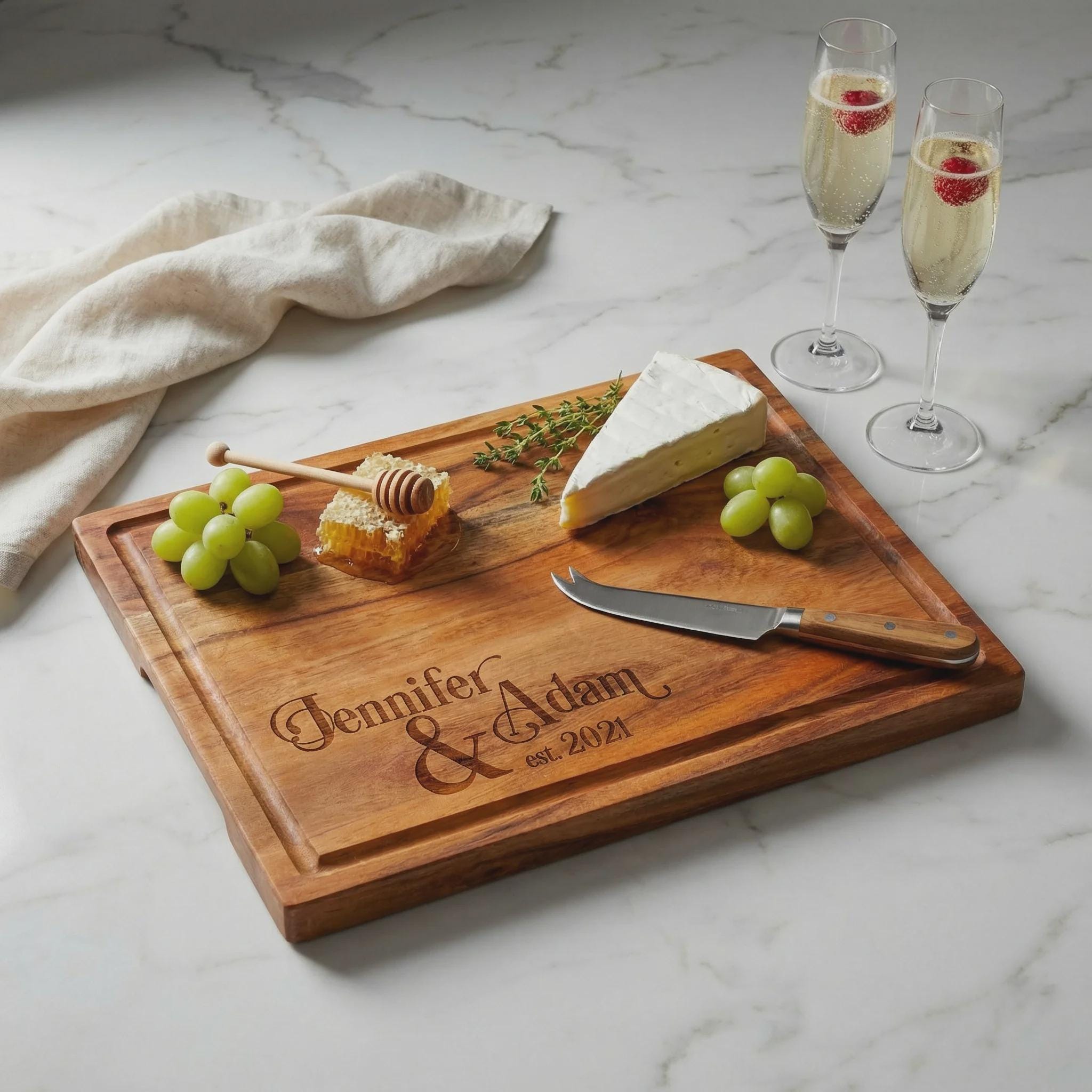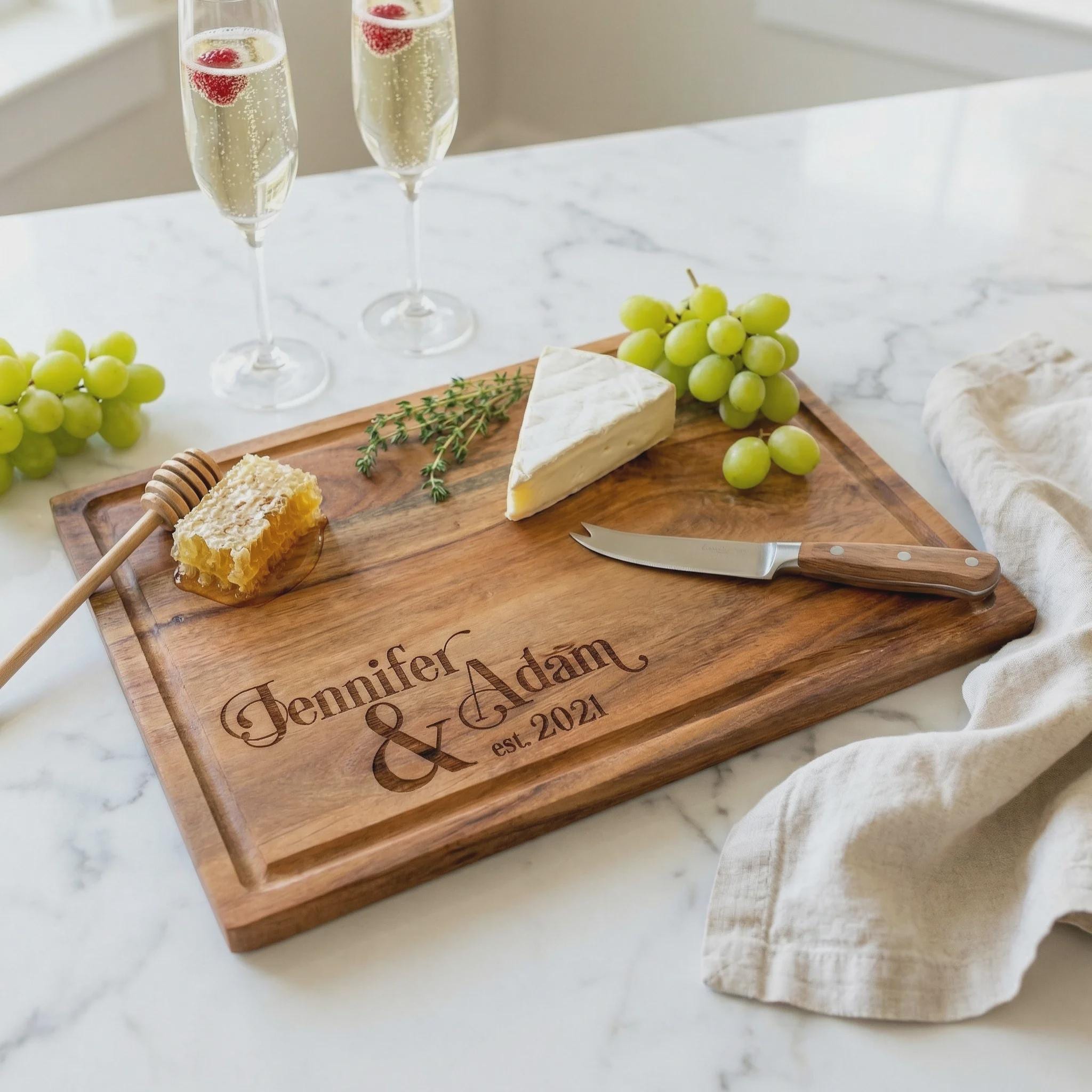 Personalized Acacia cutting board With Juice Groove, Engraved Serving Platter: Wedding gifts
