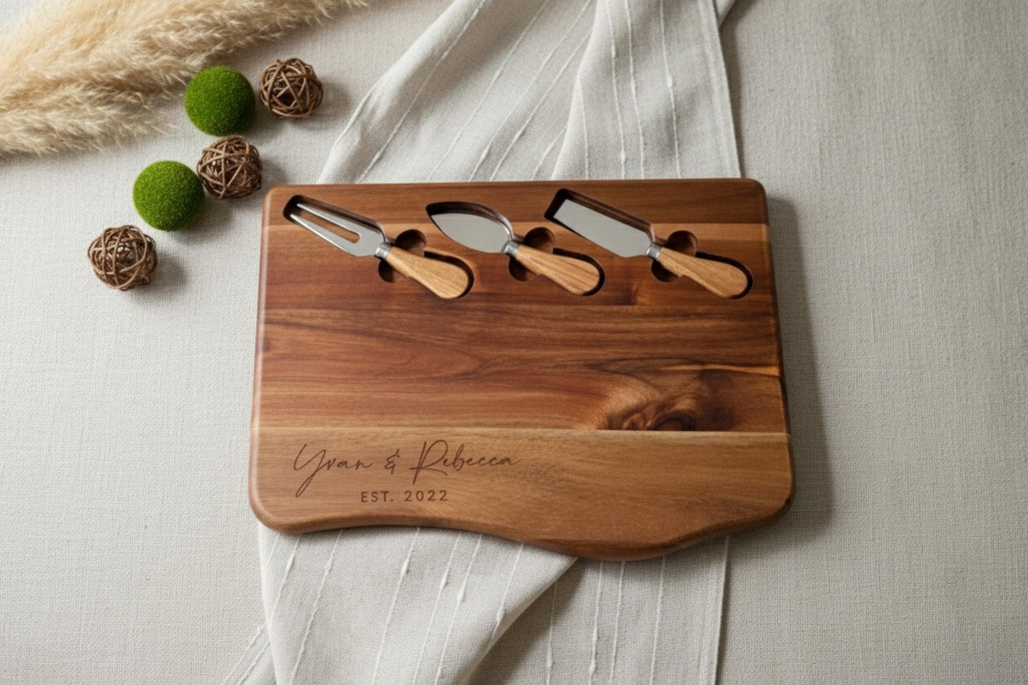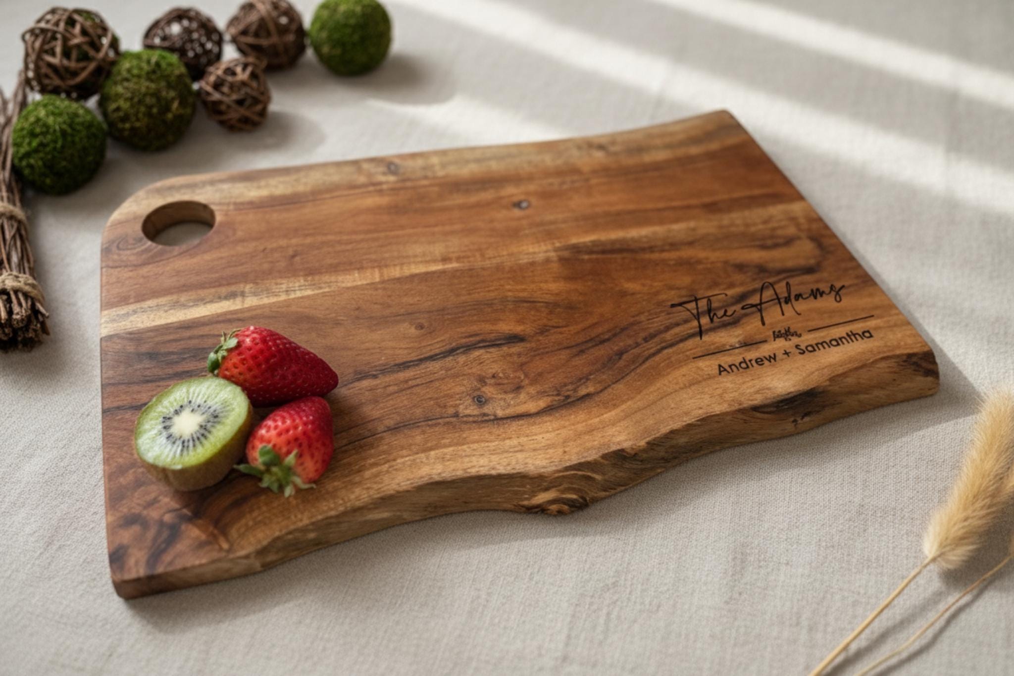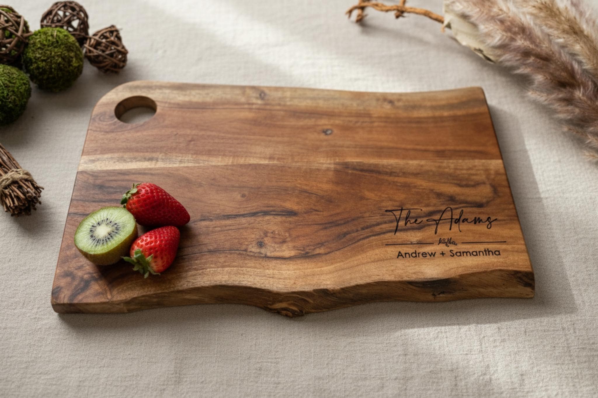 Elevate your kitchen with a handcrafted, live-edge cutting board, personalized just for you! Made from durable Acacia or Mango wood, each custom engraved board is a unique statement piece. Perfect as a wedding gift, a housewarming present, or a special treat for yourself. Imagine it displayed and bringing character to any kitchen!