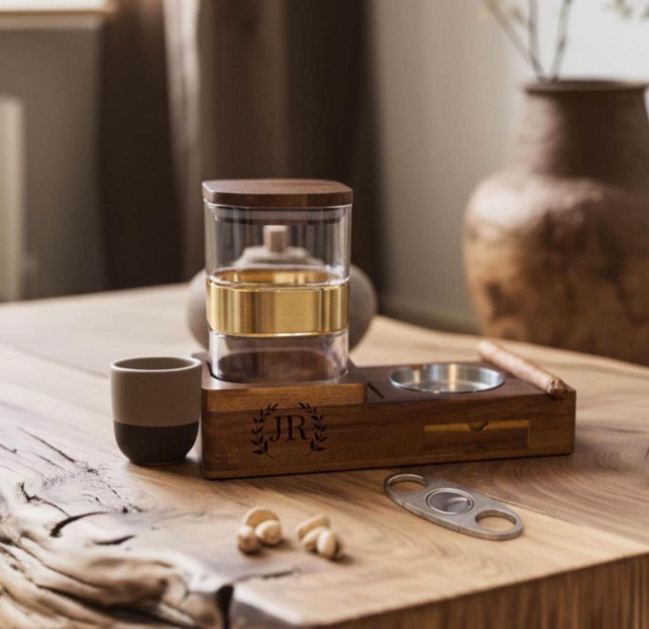 Looking for a stylish and functional cigar set that's perfect for your next smoke session? Our custom-engraved cigar jar, ashtray, cutter, dropper, and hygrometer set are just what you need!