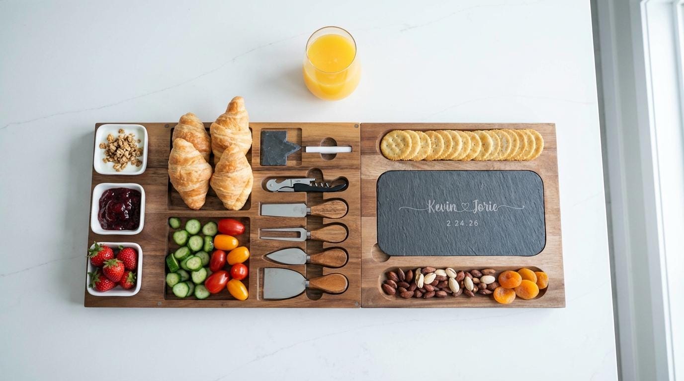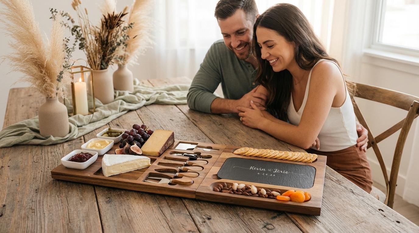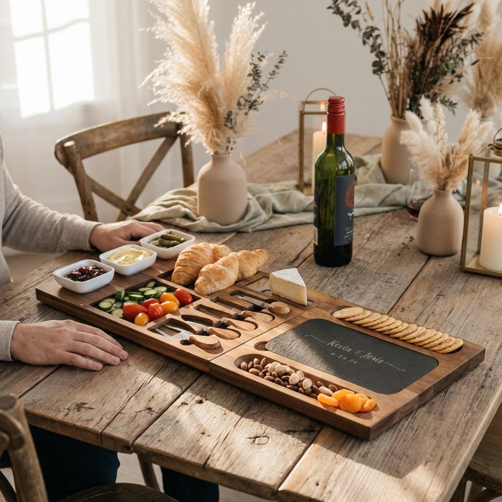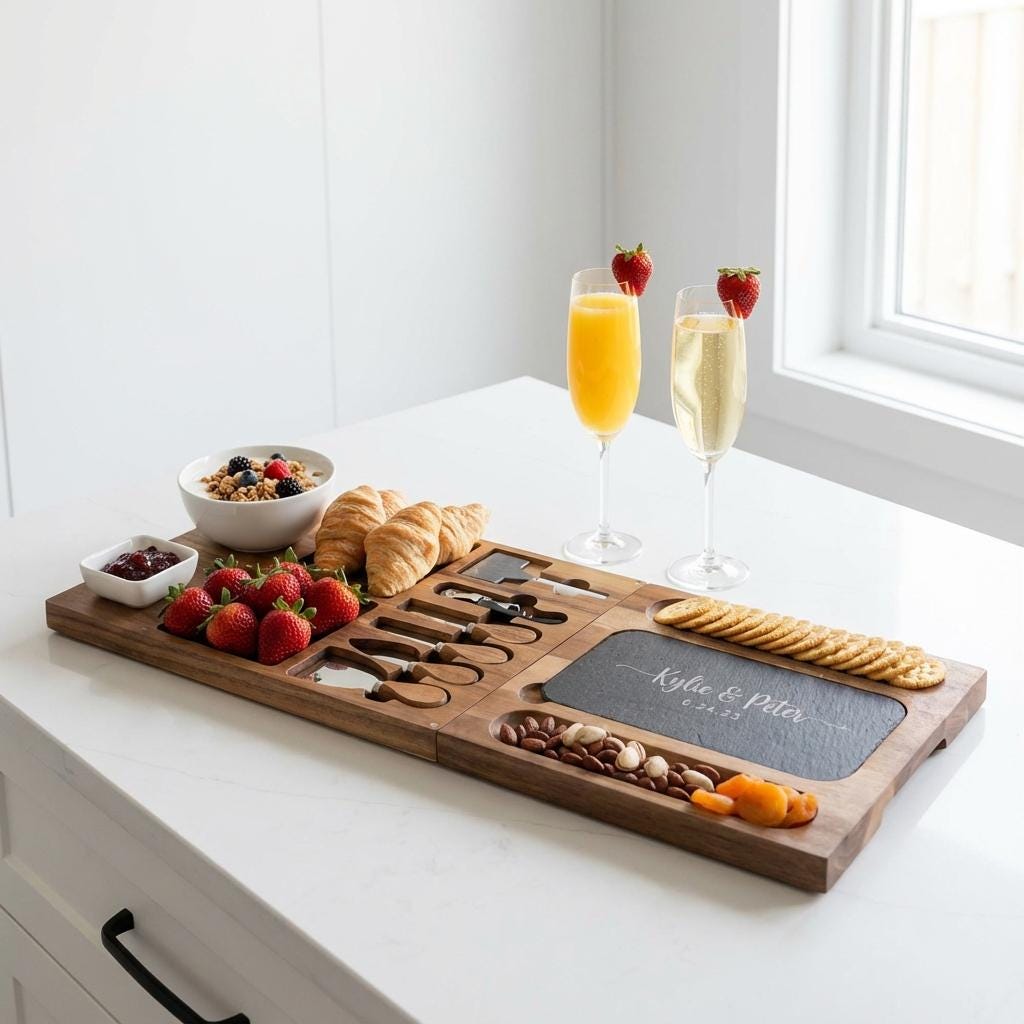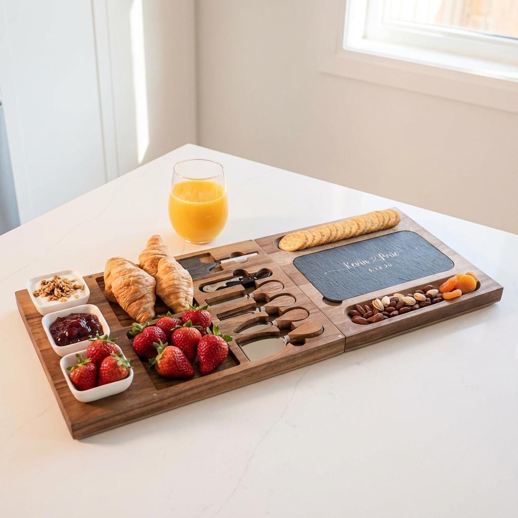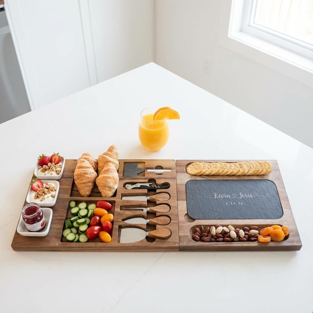 Elevate their hosting game with this personalized charcuterie board set. Featuring a custom-engraved slate insert and expandable acacia trays, this luxury cheese board is the ultimate wedding gift or 5th anniversary present for couples.