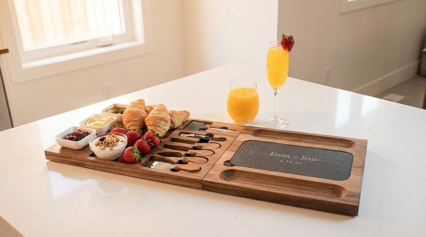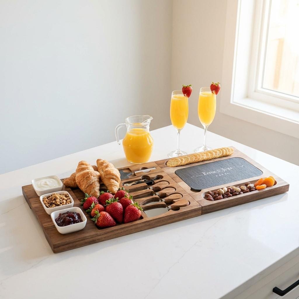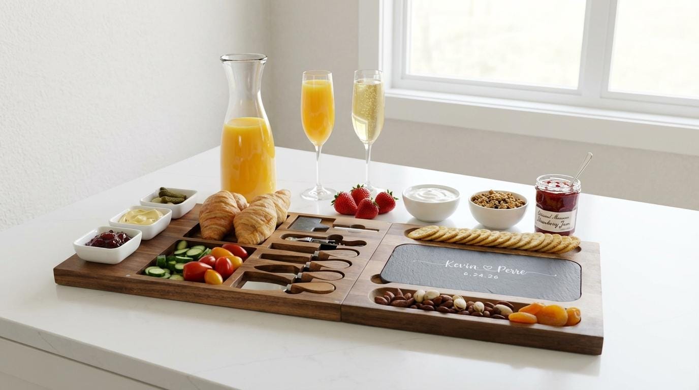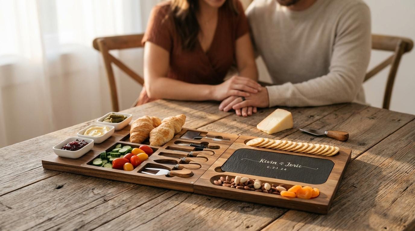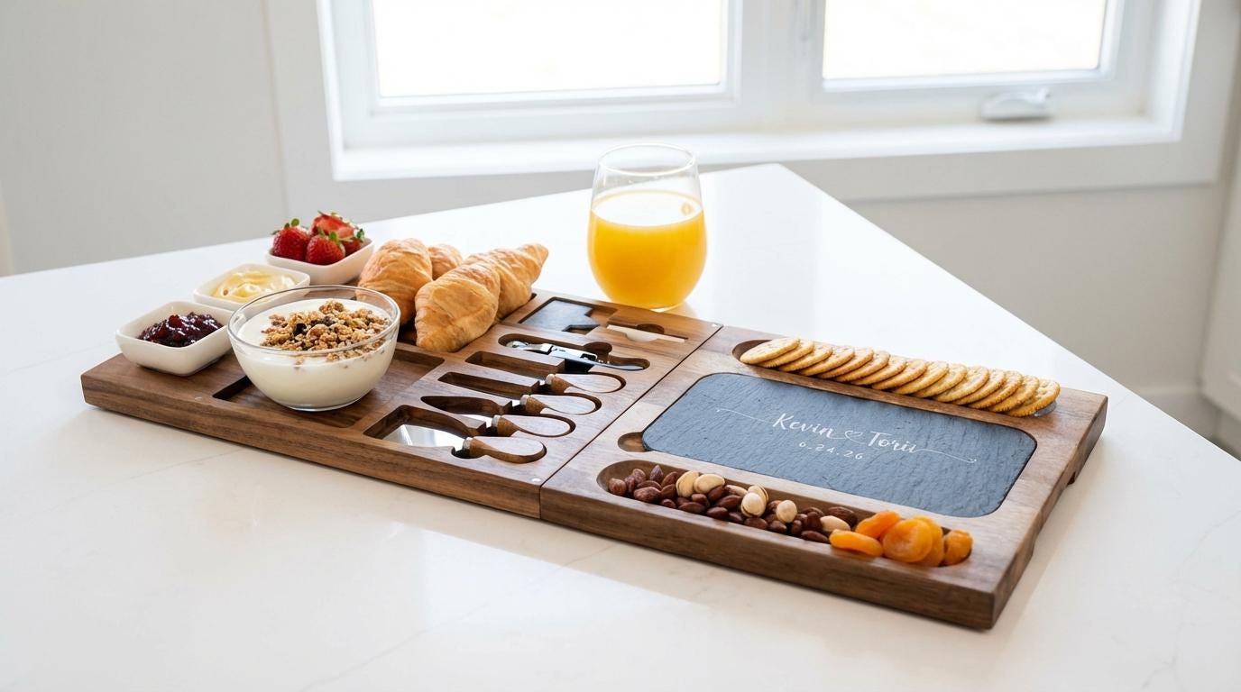 Elevate their hosting game with this personalized charcuterie board set. Featuring a custom-engraved slate insert and expandable acacia trays, this luxury cheese board is the ultimate wedding gift or 5th anniversary present for couples.