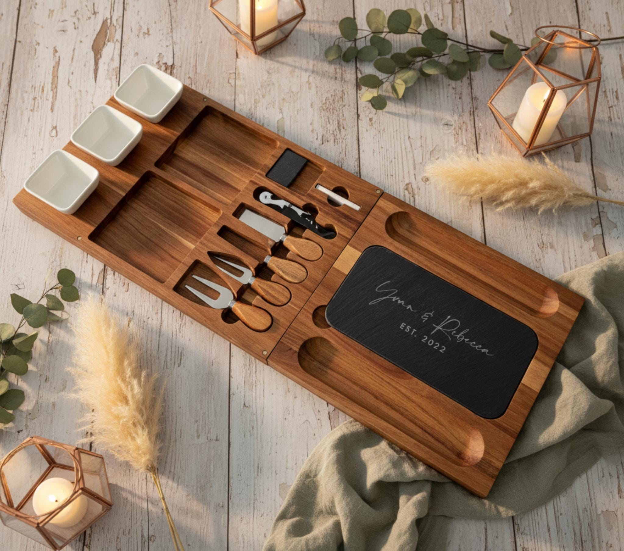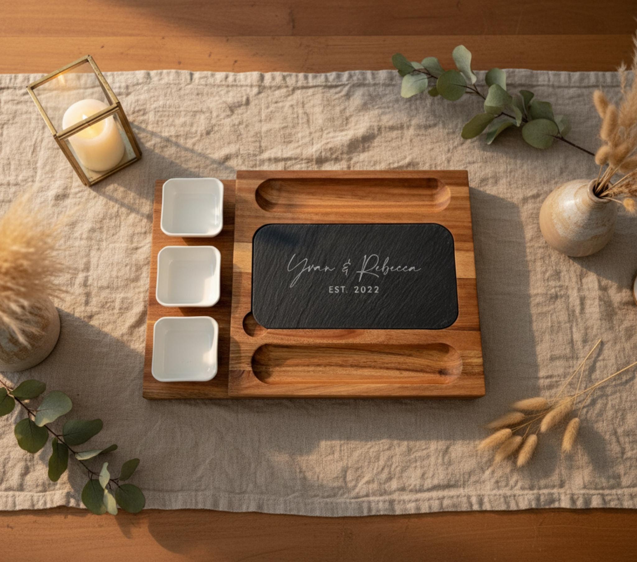 This personalized acacia wood board is the perfect centerpiece for weddings, anniversaries, housewarming parties, Christmas, and any occasion where lasting memories are made.