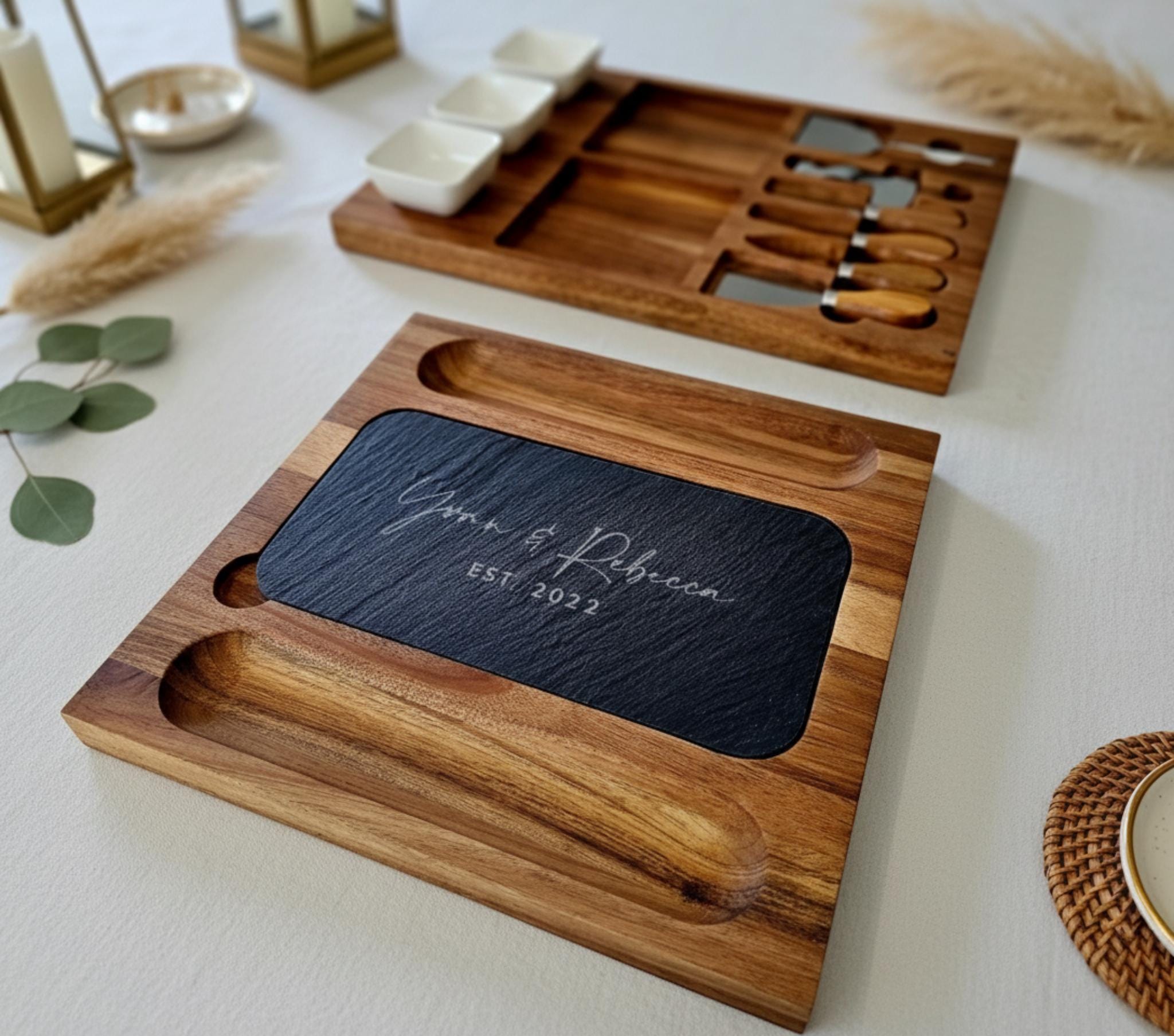 Crafted from two luxurious acacia wood boards, our personalized cheese board set offers versatile serving options as a complete charcuterie platter or two distinct boards, providing ample space for cheeses, meats, and accompaniments. The included stylish slate allows for elegant food labeling, enhancing your hosting experience and impressing your guests. Four expertly crafted cheese knives ensure flawless slicing and serving, while the convenient wine opener makes beverage access effortless. Three exquisite ceramic sauce bowls are perfect for delightful accompaniments, and the two marker slates offer a unique way to personalize your presentation with customizable charms.