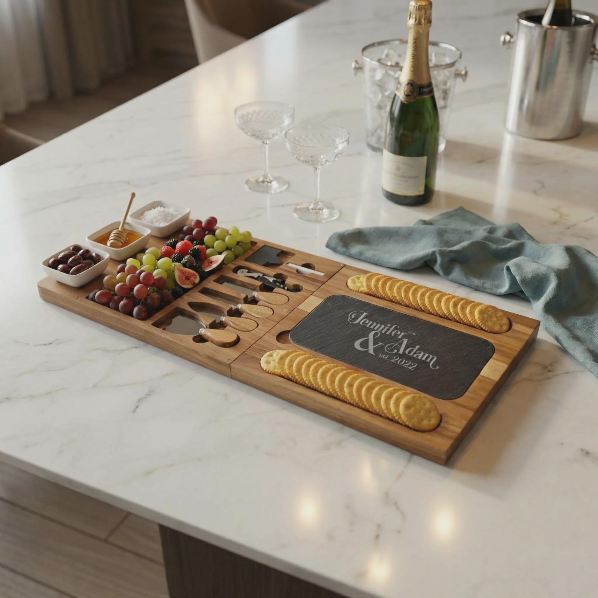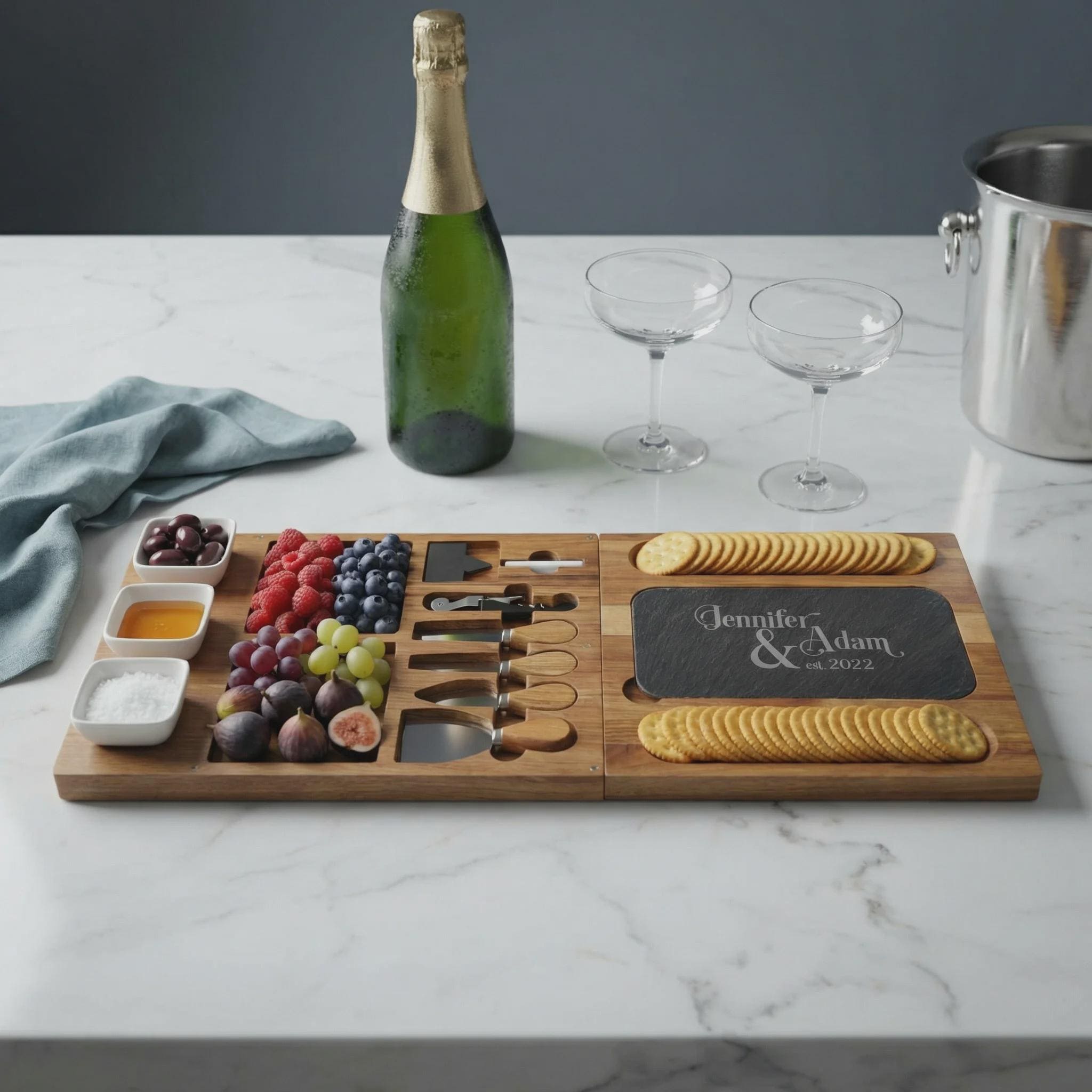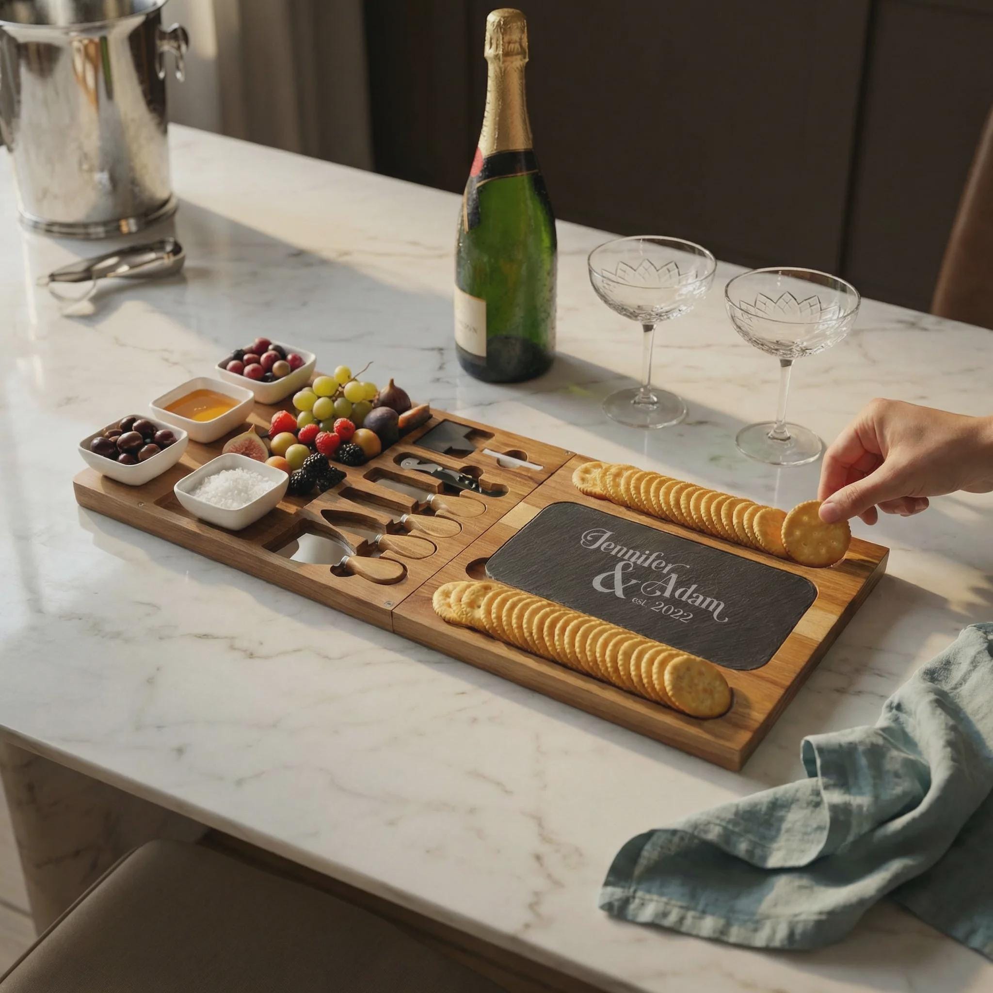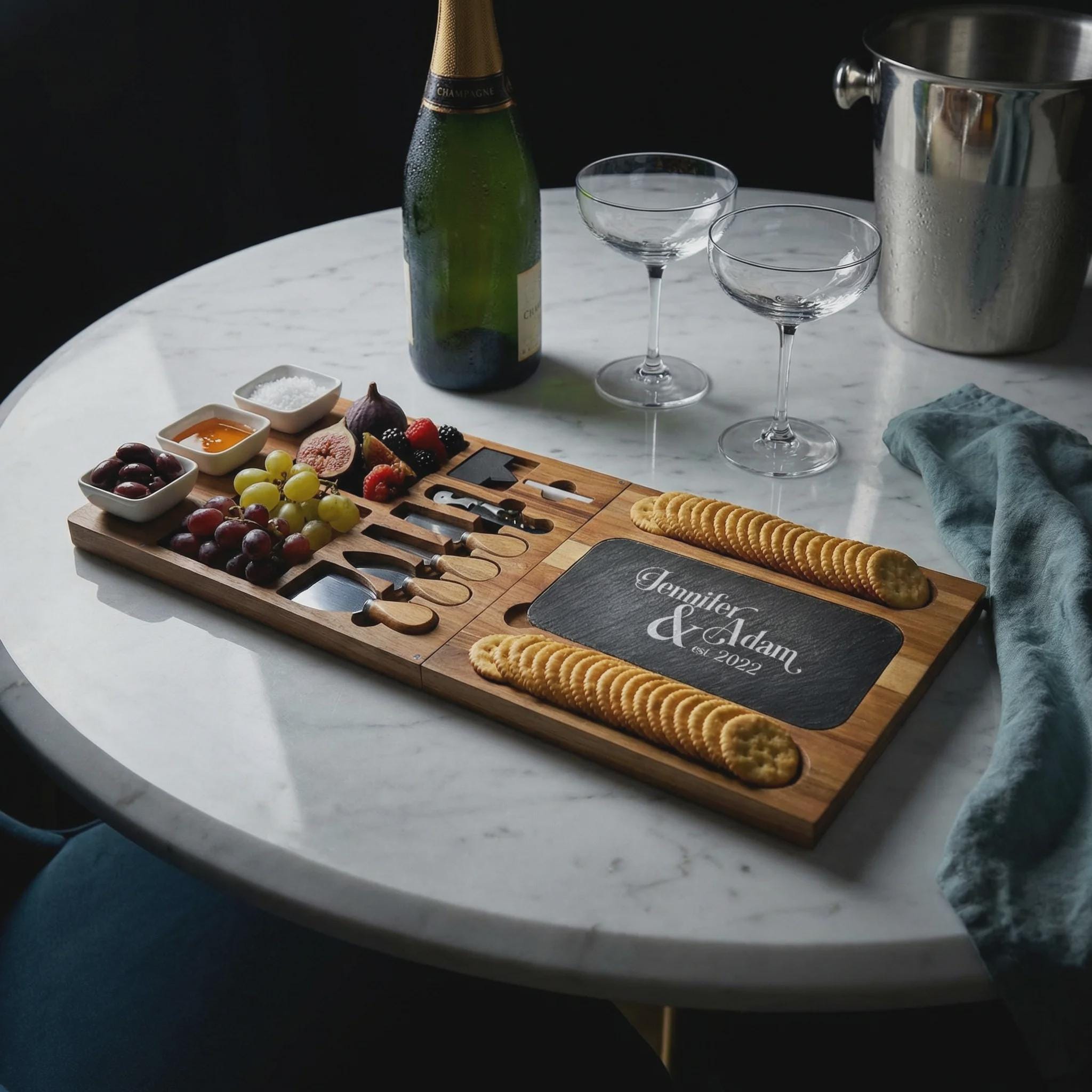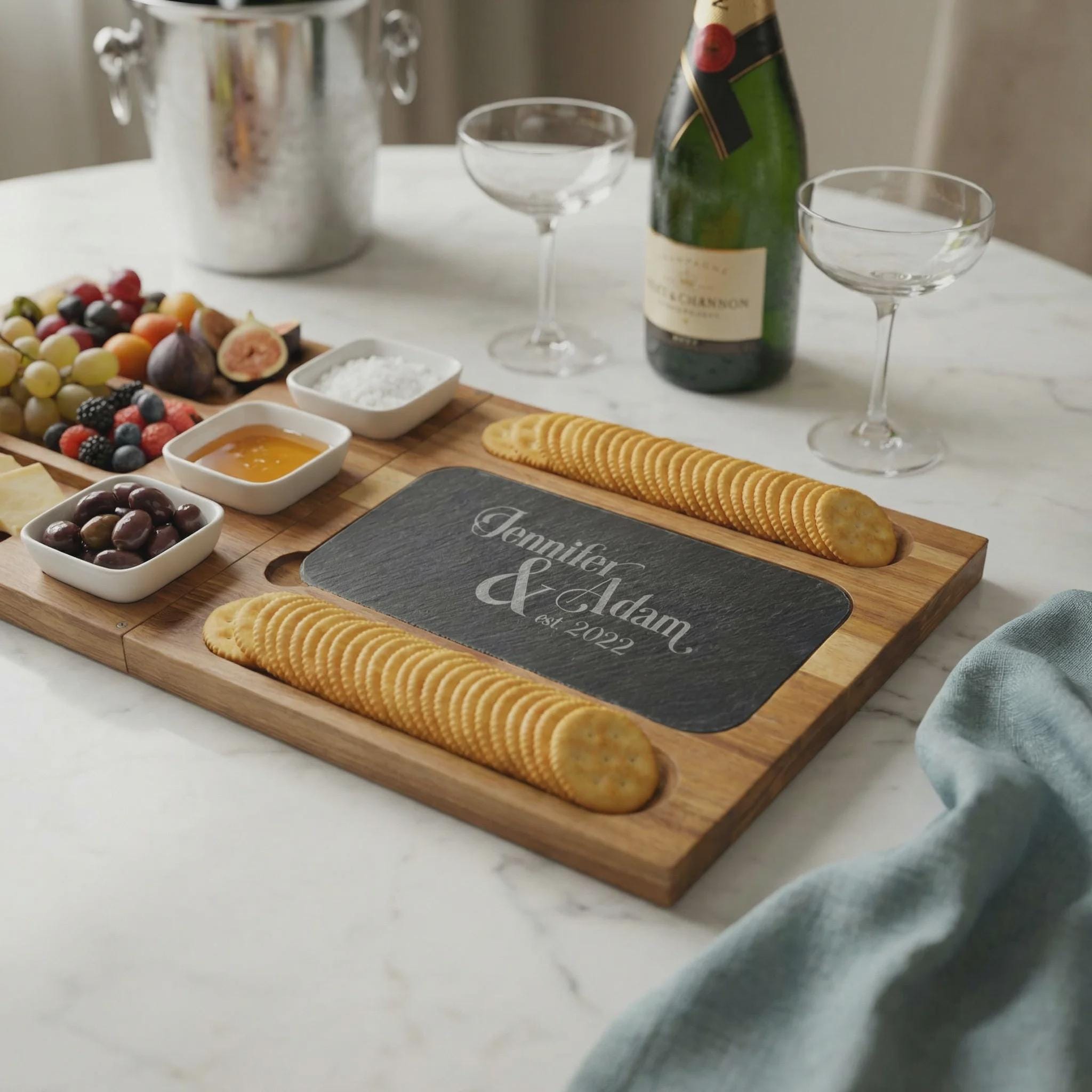Elevate your hosting experience with this Personalized Cheese Board Set, thoughtfully designed for entertaining, gifting, and everyday enjoyment. Crafted from premium natural wood and custom laser engraved with names and a special date, this charcuterie board set is both functional and beautifully decorative. Featuring dedicated compartments for cheeses, fruits, crackers, and accessories, it’s perfect for serving guests in style. Whether you’re celebrating a wedding, anniversary, housewarming, or holiday, this engraved cheese board set makes a meaningful keepsake that blends craftsmanship, elegance, and personal touch.
