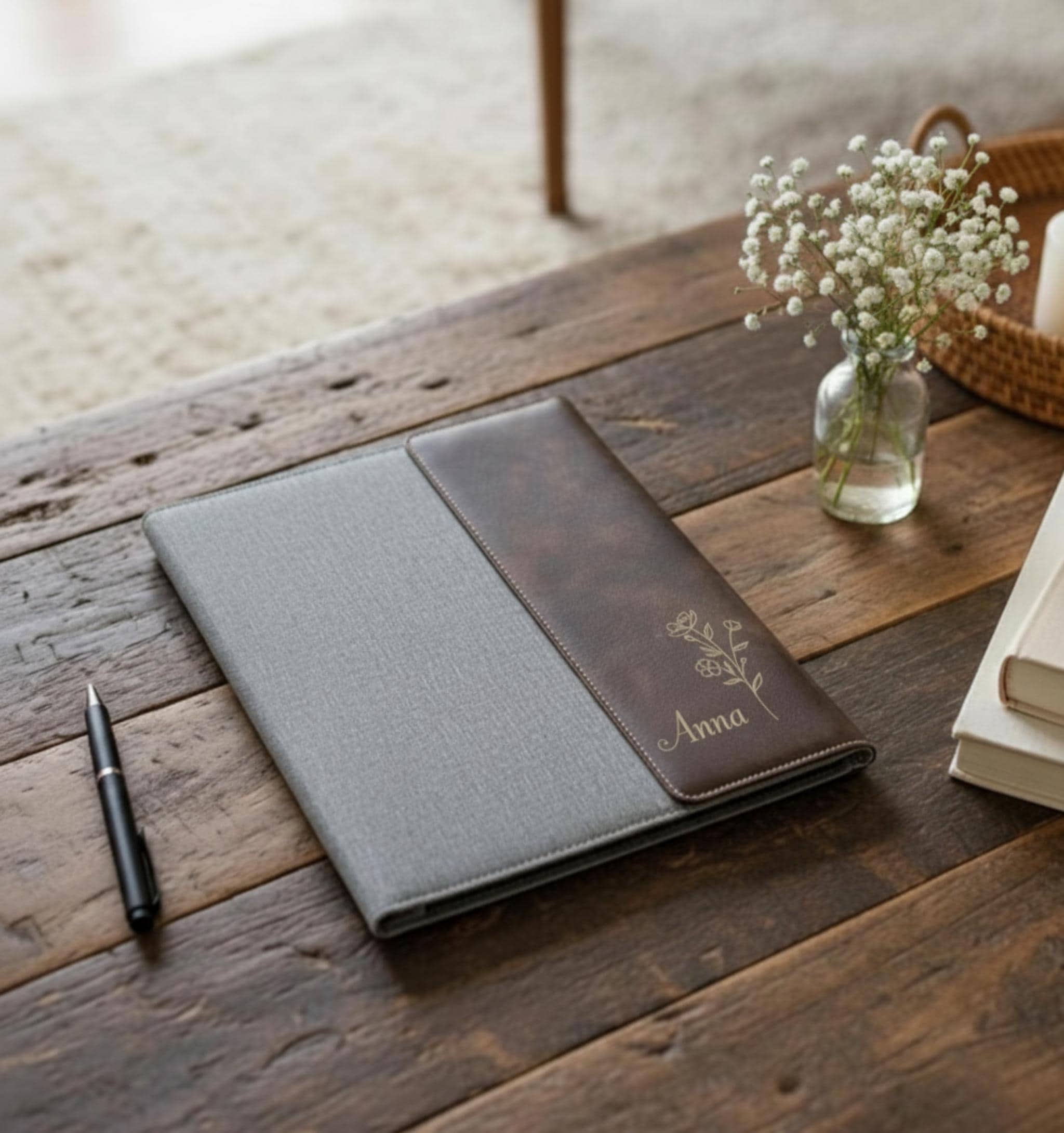 Personalized Leather Portfolio - Custom Engraved Notepad: Floral Theme, Professionals, Graduation, Boss, Teacher, Coworker, Business Gift