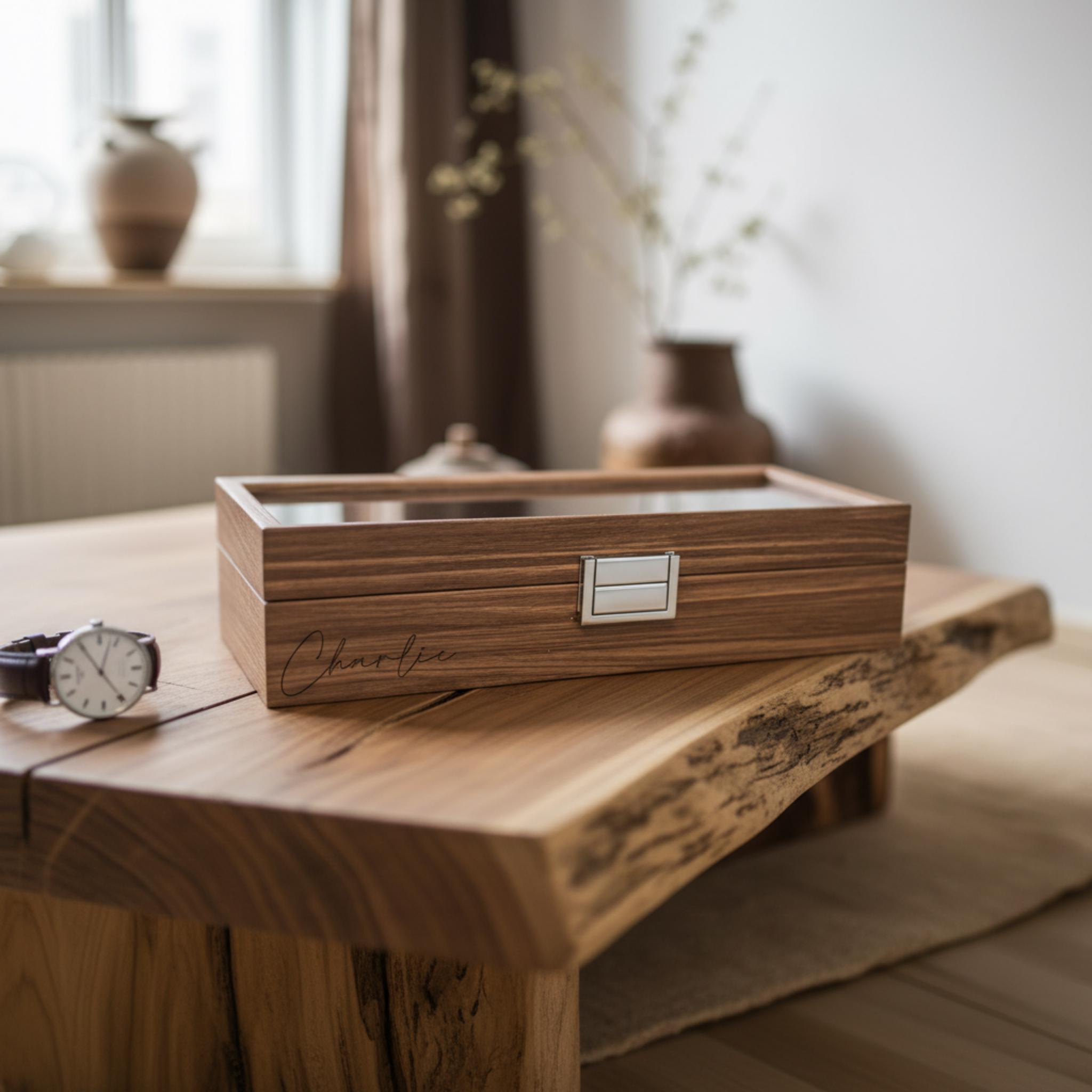 Personalization Options: What sets this veneered walnut watch box apart is the option to personalize it with your chosen design from 4 different options.