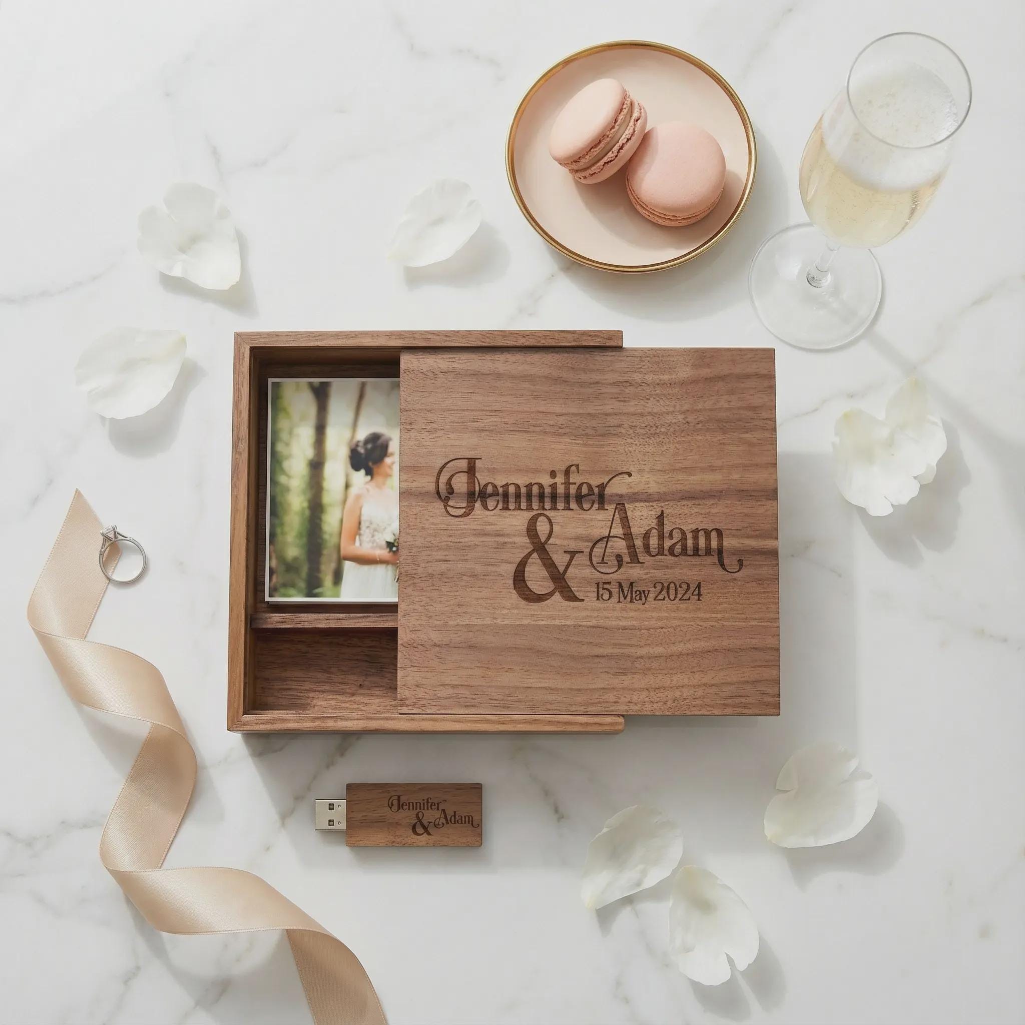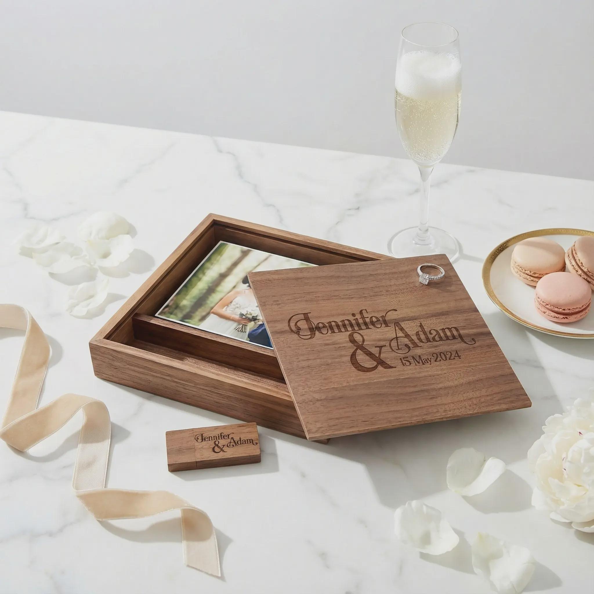 Personalized Wedding Memory Box, Custom Engraved Wood Photo Case with 64GB USB, Anniversary Keepsake for Couples