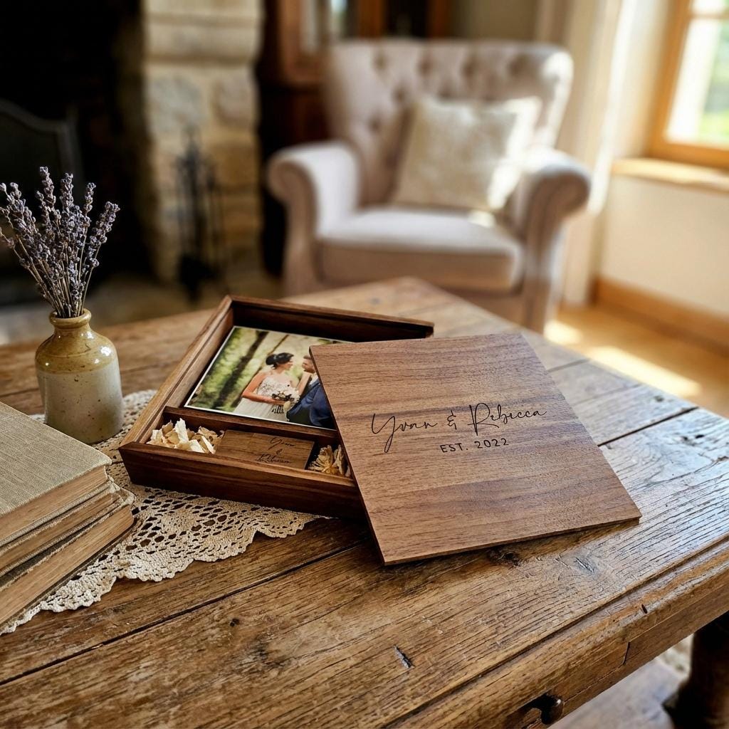 Whether you're looking for a thoughtful wedding present or a way to preserve your own memories, our Personalized Walnut Wooden Photo Album Box Flash Drive Pendrive is the perfect choice. Invest in this timeless piece to safeguard your memories with style and grace.