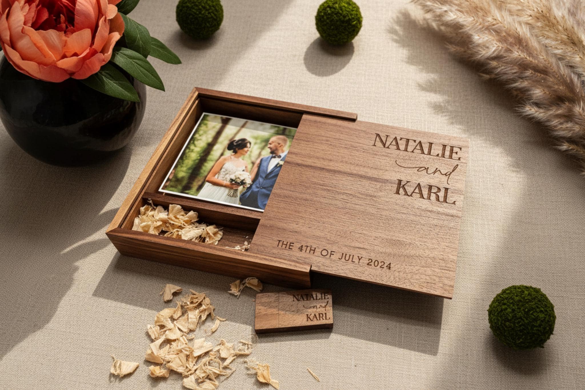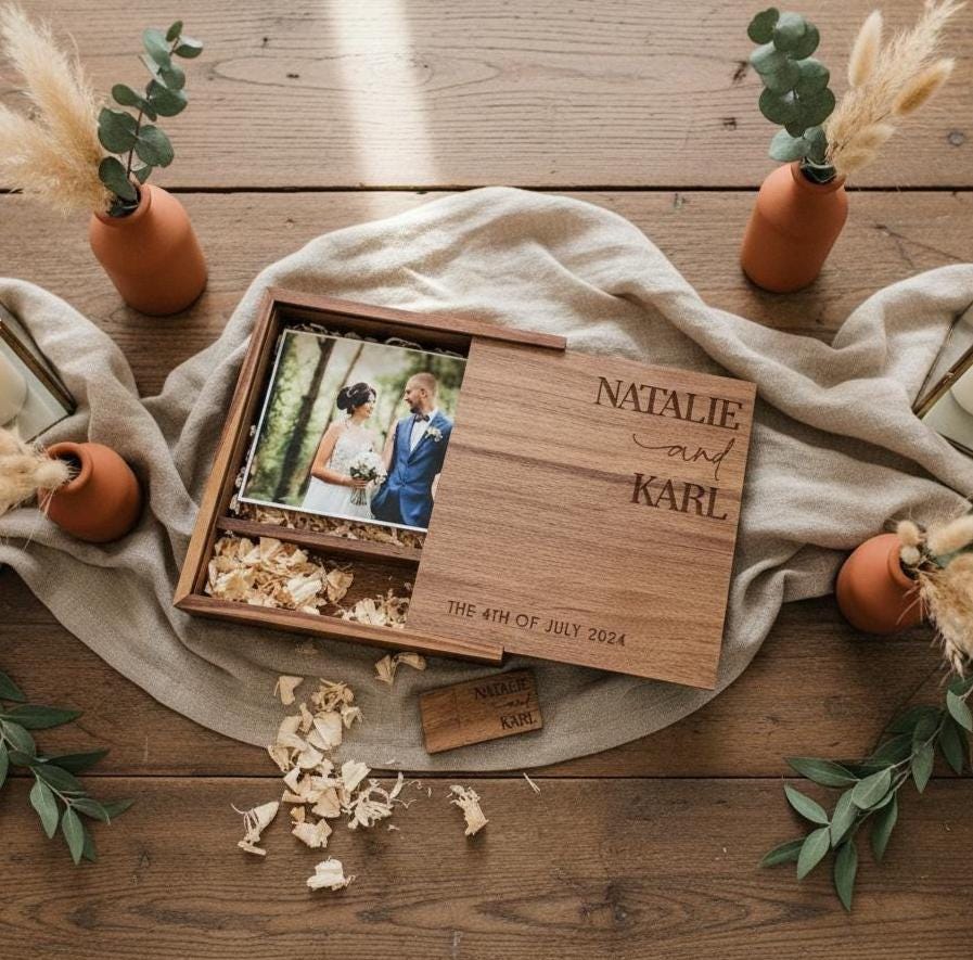 Personalized Wedding Photo Album, Custom Engraved Wooden Memory Box – 64GB USB, 4x6 photo box for photos, Wedding Gift, Couples Gift
