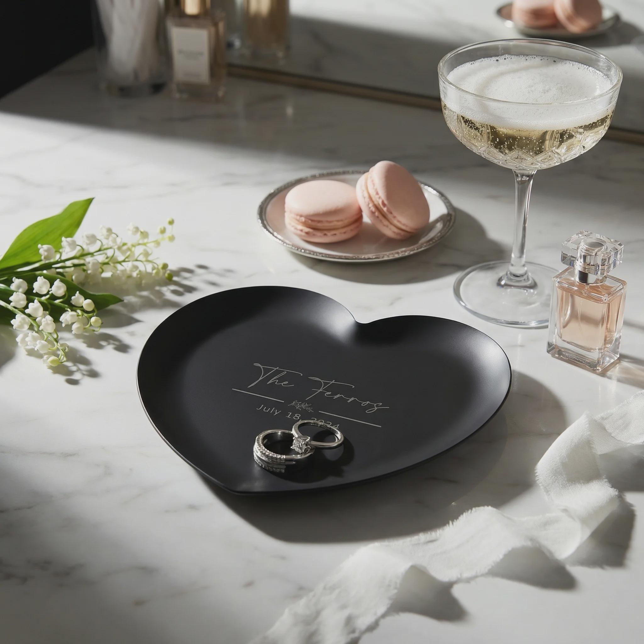 Celebrate the journey of a lifetime with our personalized heart trinket dish. Handcrafted in a sophisticated matte black finish and custom engraved with your family name and ceremony date, this unique jewelry bowl serves as a beautiful wedding memento or engagement treasure. Perfect for keeping bridal bands secure on a vanity or bedside table, this stylish catching tray is an elegant bride-to-be surprise designed to hold the precious symbols of your love story forever.