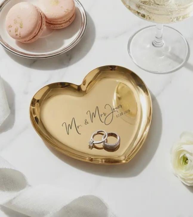 Personalized Gold Heart Ring Dish - Engraved Mr and Mrs Stainless Steel Jewelry Tray
