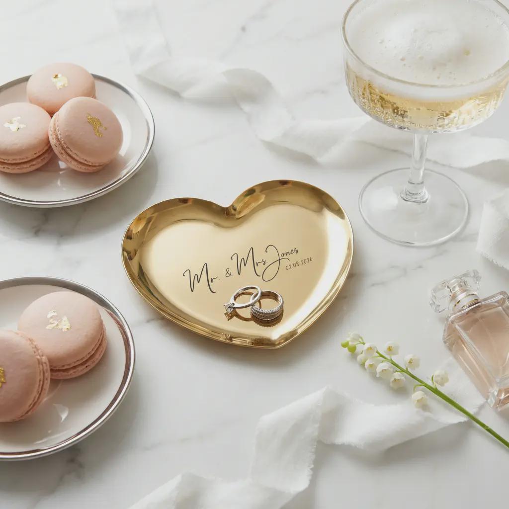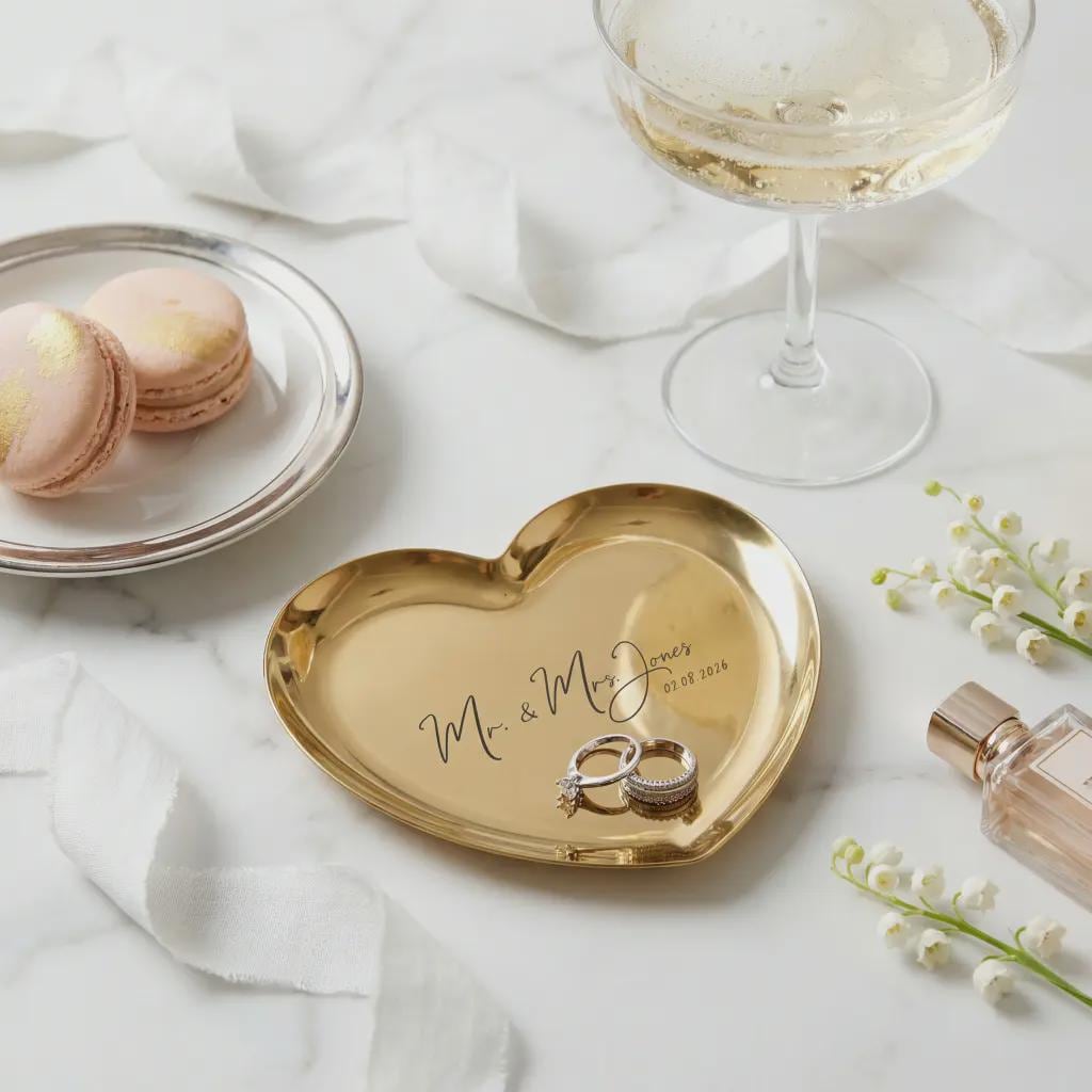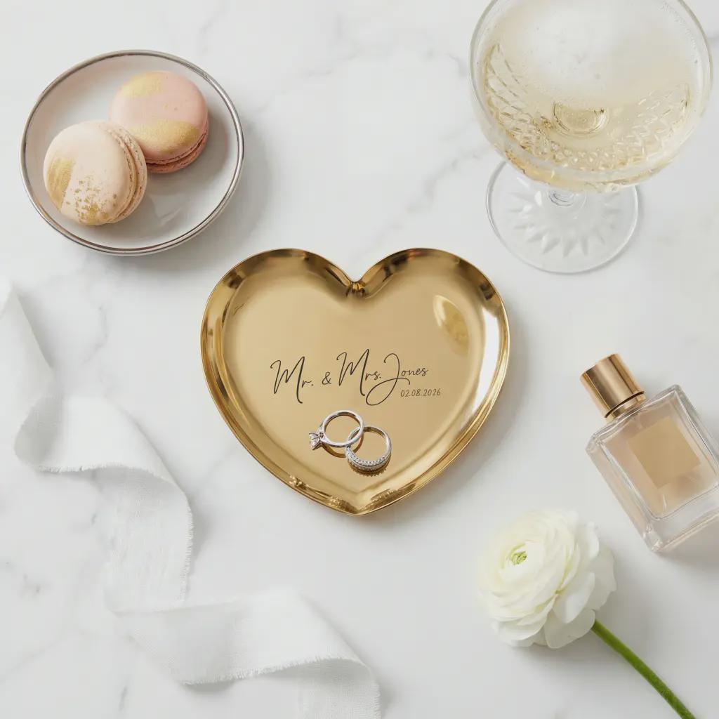 Keep your most precious bands safe on this elegant gold heart-shaped ring dish, custom-engraved with your new name and wedding date. Crafted from high-quality stainless steel with a polished mirror finish, this durable trinket tray serves as a timeless engagement keepsake or a sentimental bridal shower surprise. Its minimalist design adds a sophisticated, personalized touch to any bedside table or vanity.
