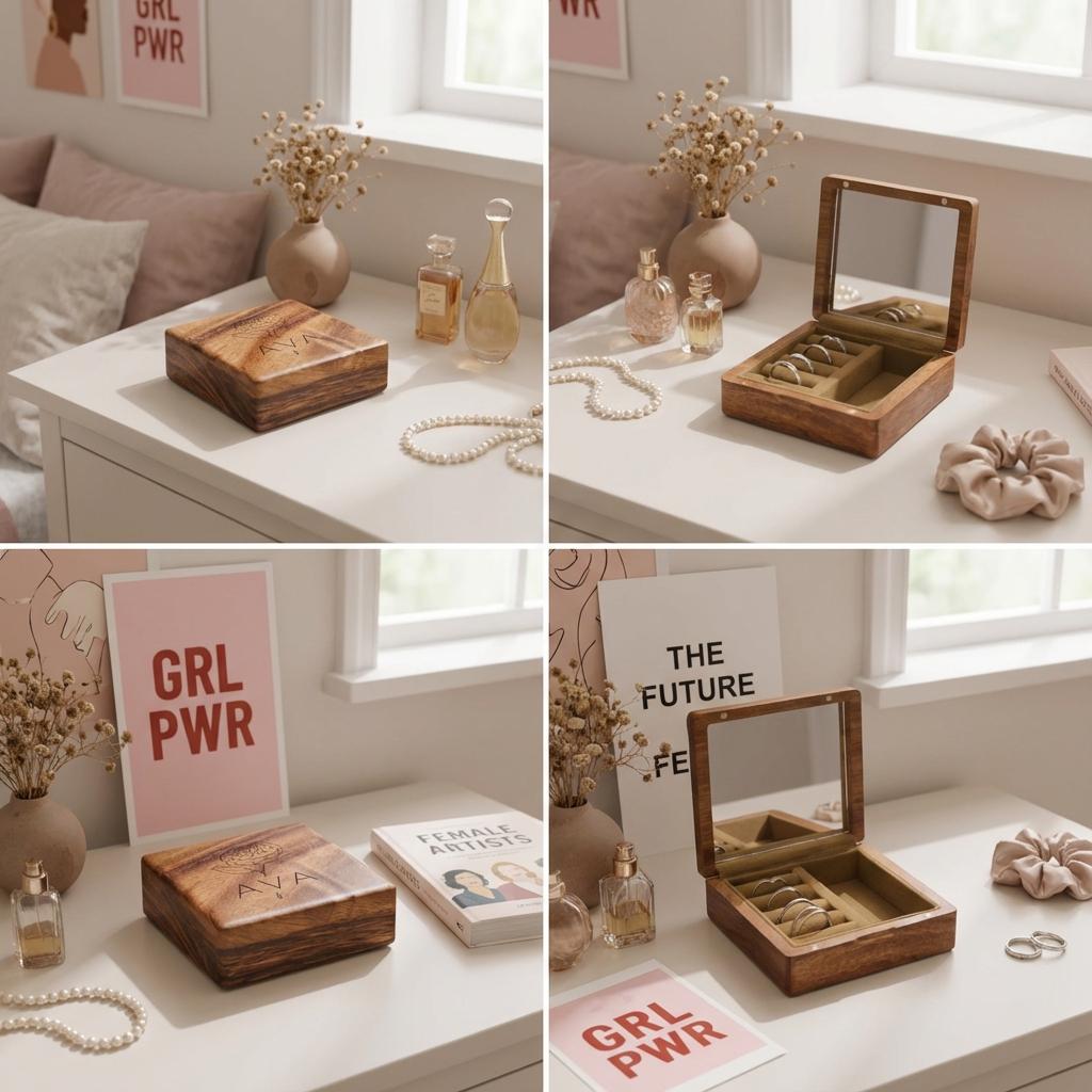 Measuring 4x4 inches, this compact yet charming box is designed to hold her most precious jewels and trinkets. Its magnet closure ensures that her treasures remain secure, while the mirror on the inside lid adds a touch of luxury and convenience.